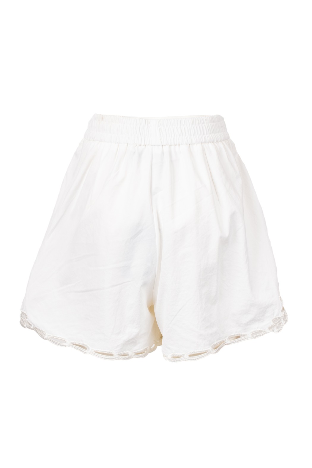 Women’s white shorts with a refined design, featuring a short cut and eyelet hem details that add a feminine and elegant touch. Lightweight and versatile, perfect for chic and contemporary summer looks.