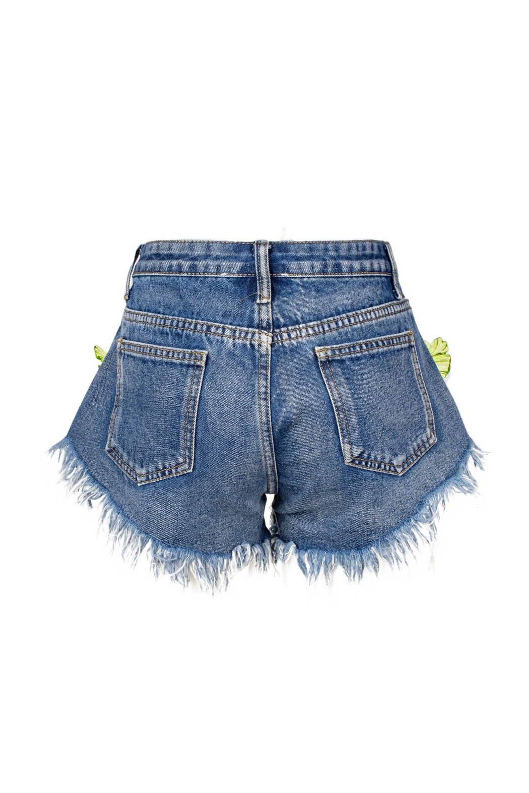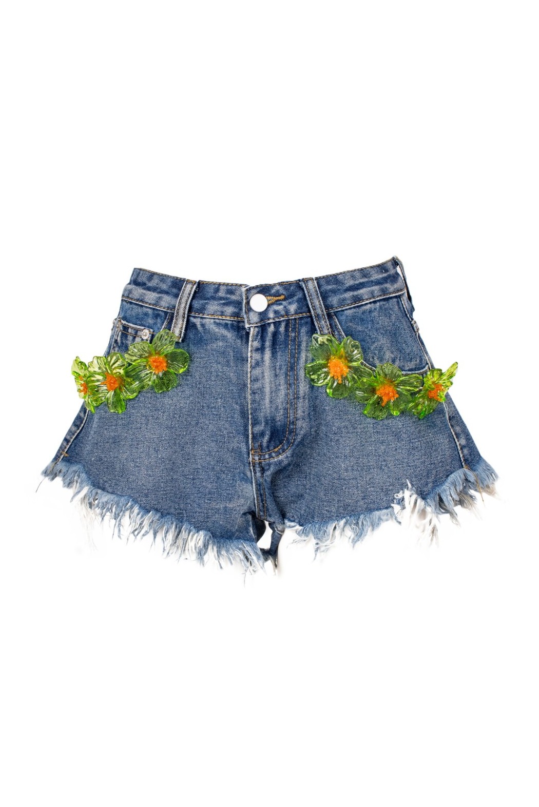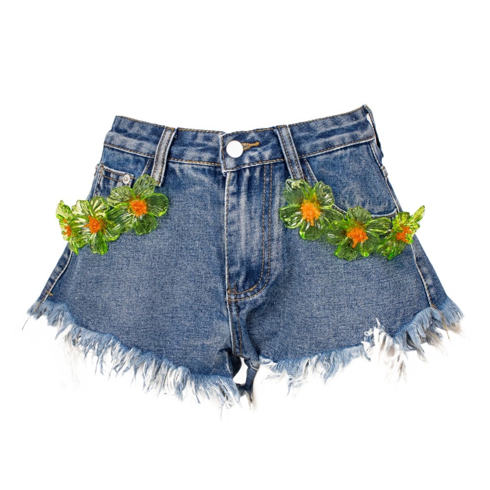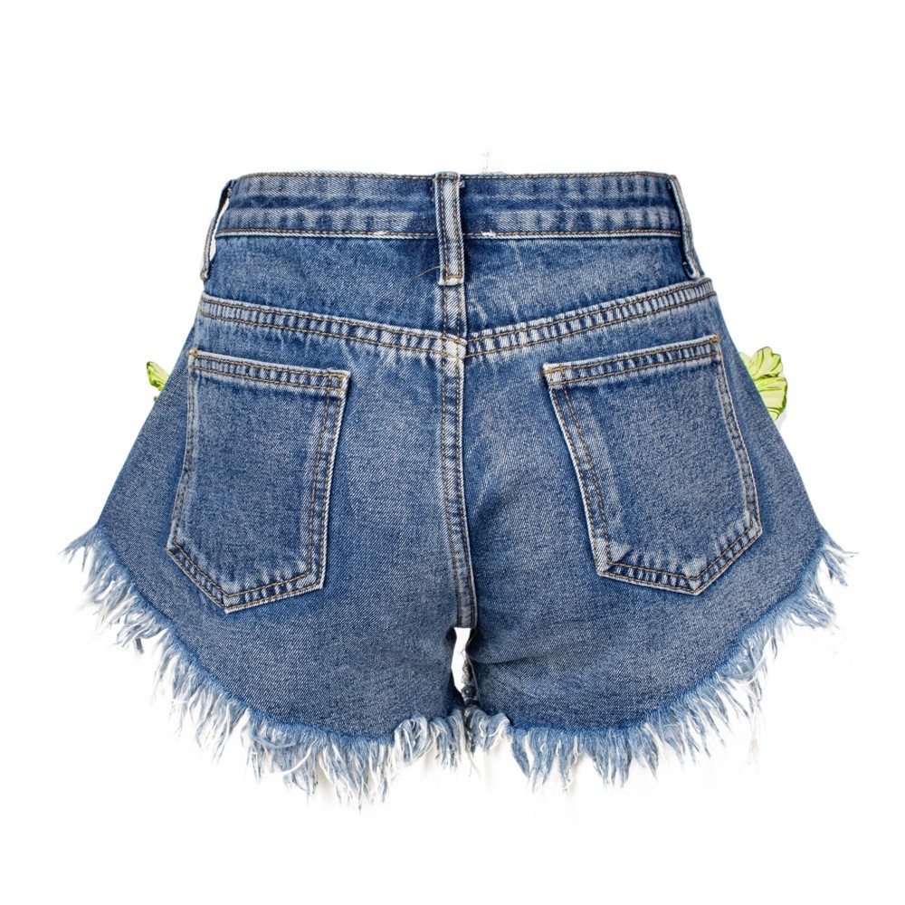 Women’s denim shorts with a frayed hem and regular waist, embellished with decorative floral appliqués that add a unique and distinctive touch. Casual and contemporary in style, perfect for dynamic and on-trend summer looks.