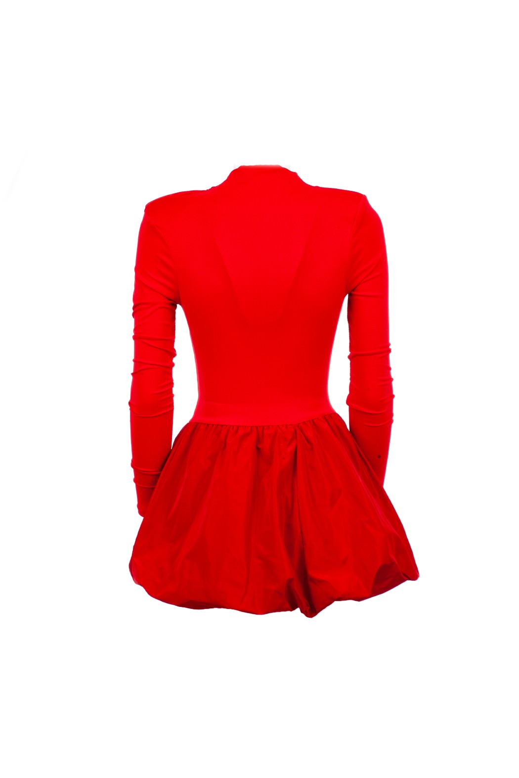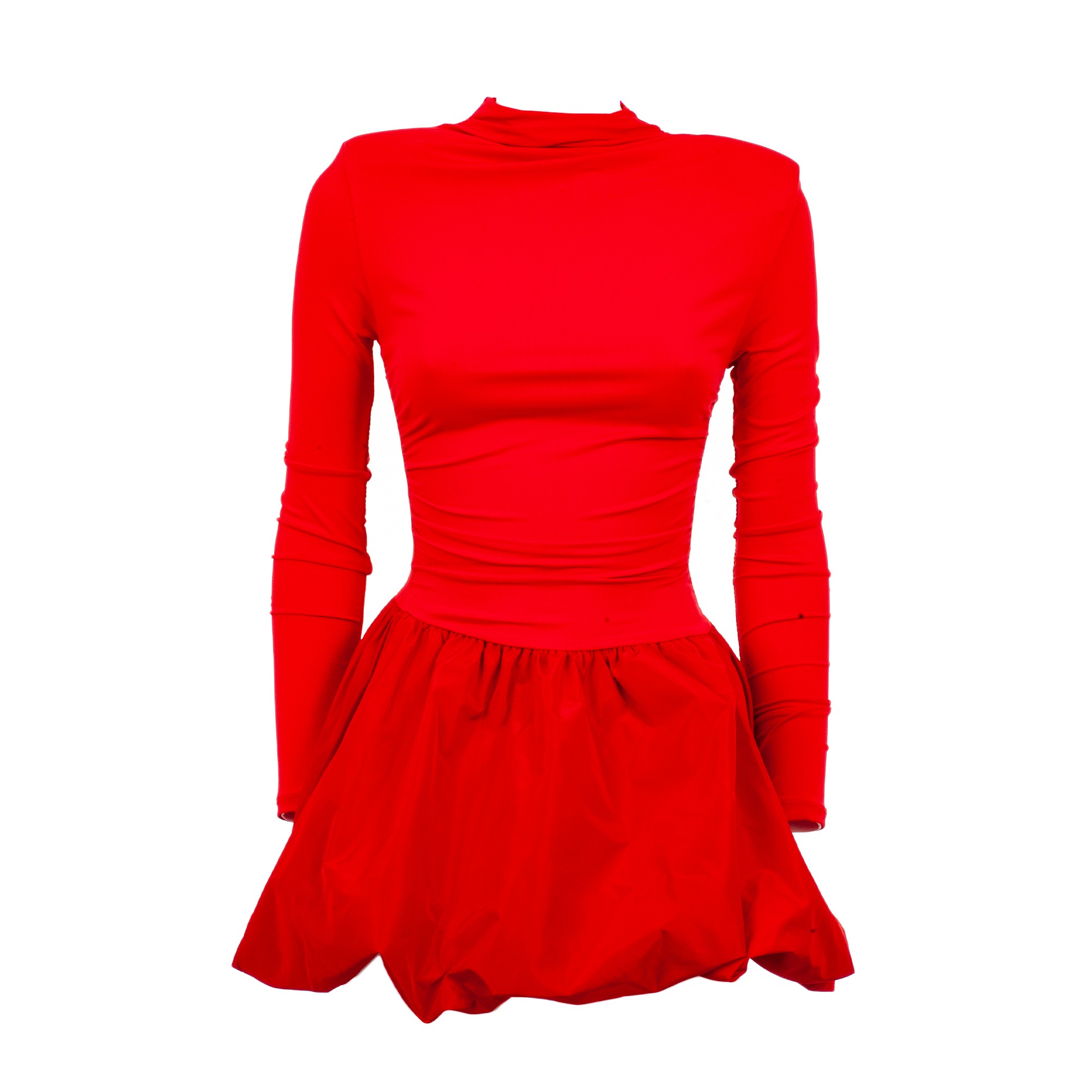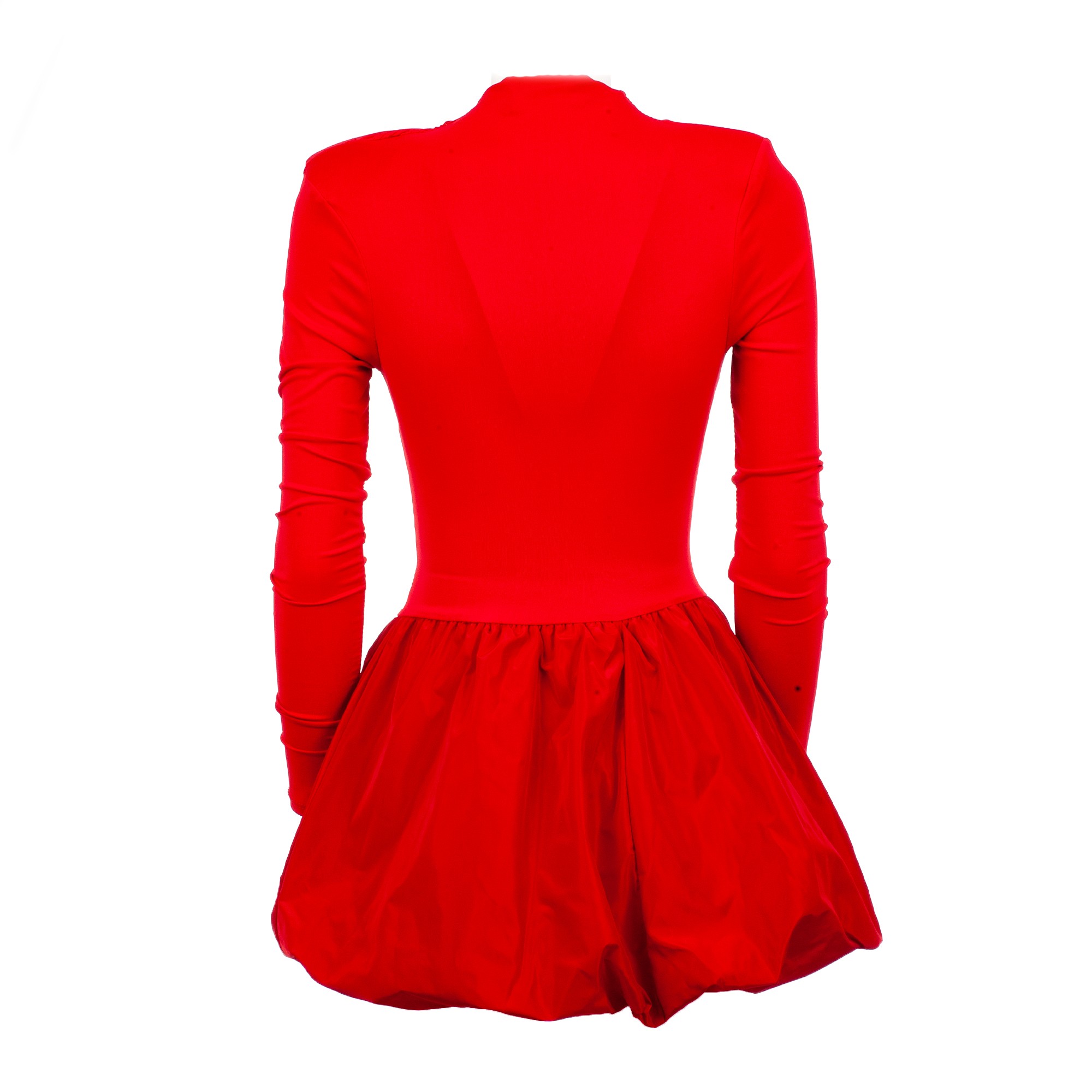 Women’s short dress in bright red, featuring a fitted long-sleeve top and a voluminous skirt with a modern design. Feminine and eye-catching, perfect for special occasions, parties, and evening events