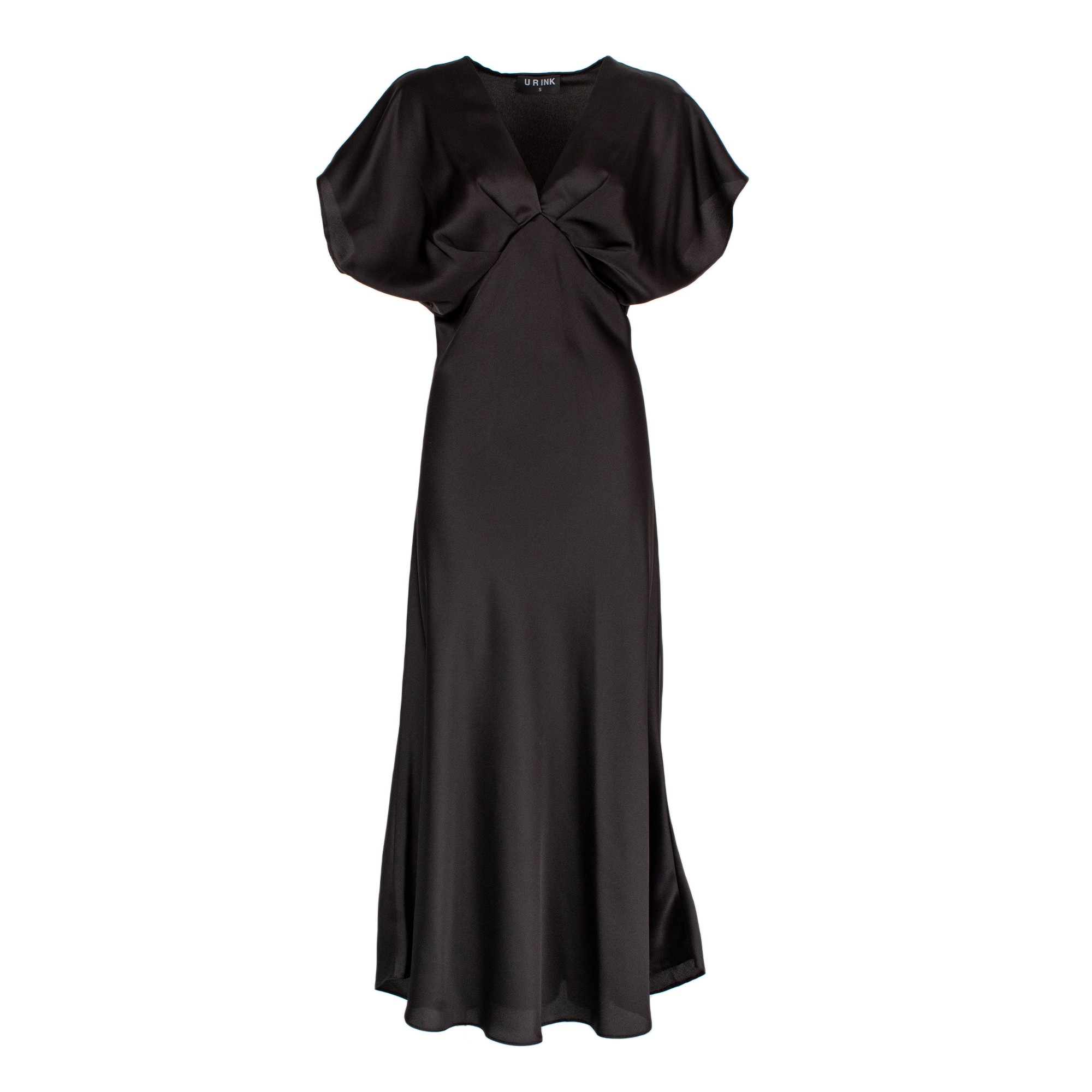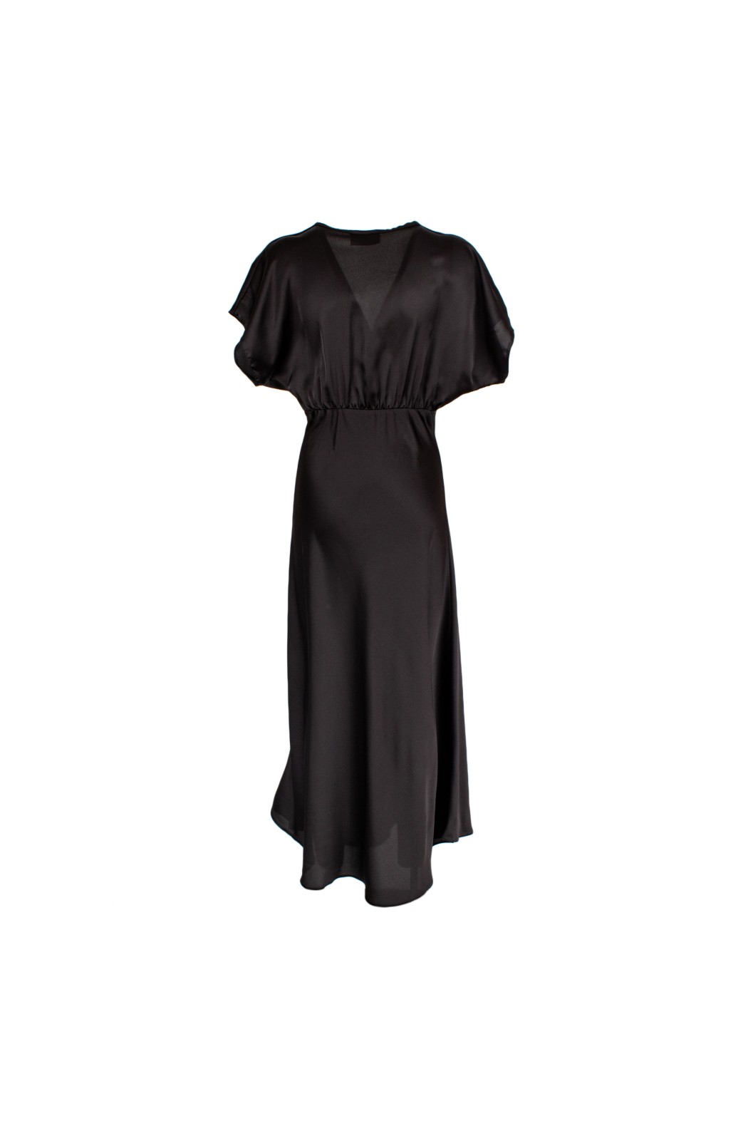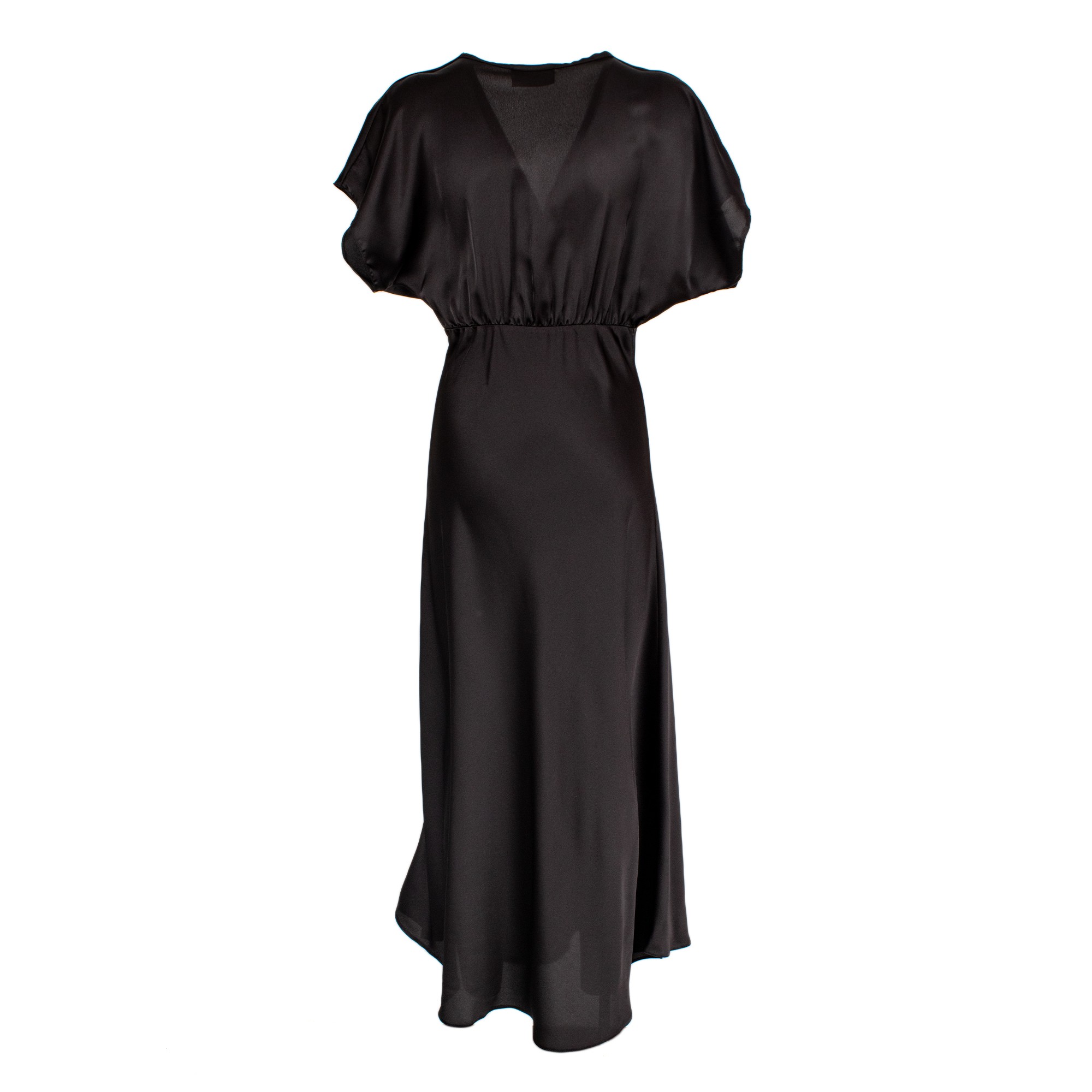 Abito lungo da donna nero con scollo a V, maniche morbide e dettaglio drappeggiato sul davanti che valorizza la silhouette con eleganza. Fluido e sofisticato, è perfetto per cerimonie, eventi serali e occasioni speciali.