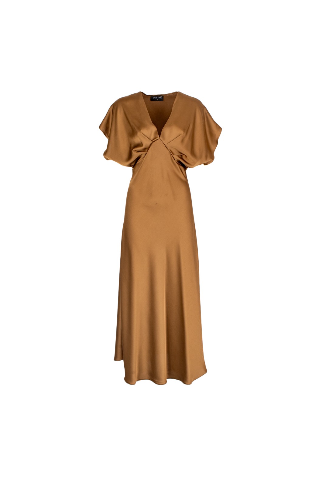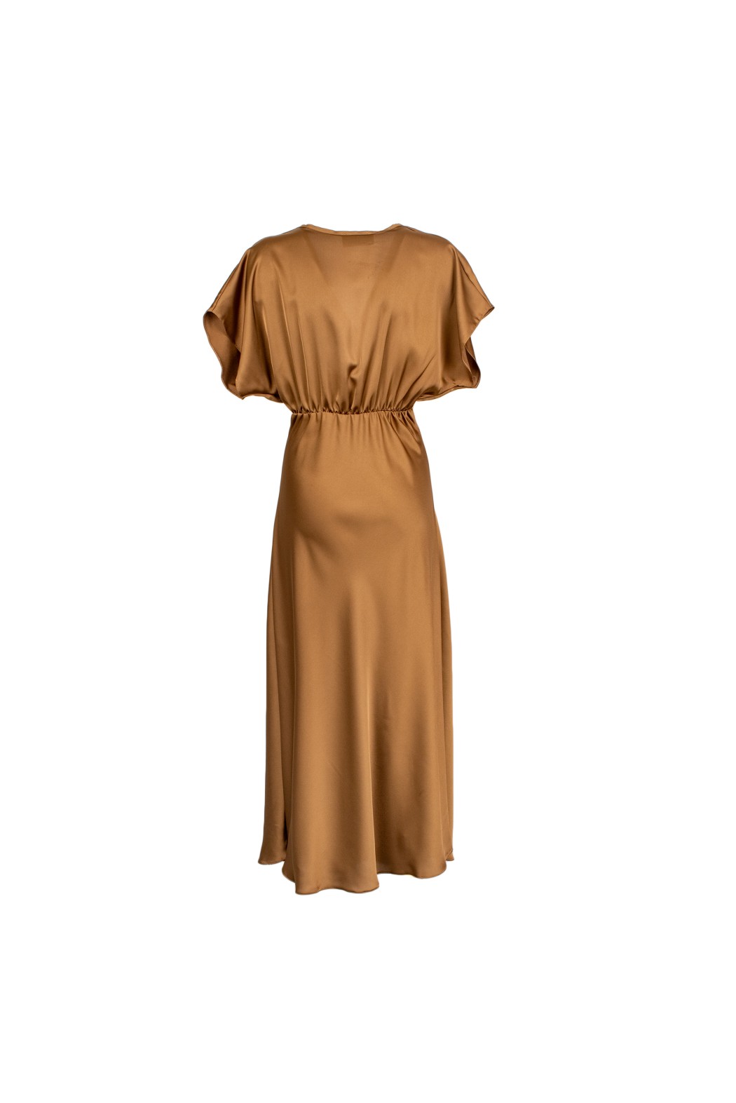 Women’s long tobacco-colored dress with a V-neckline, soft sleeves, and a draped front detail that enhances the silhouette with elegance. Flowing and sophisticated, perfect for ceremonies, evening events, and special occasions.