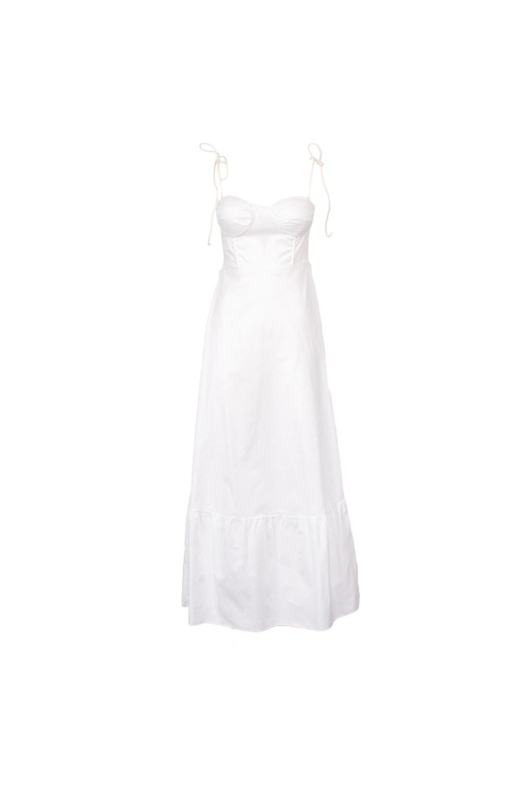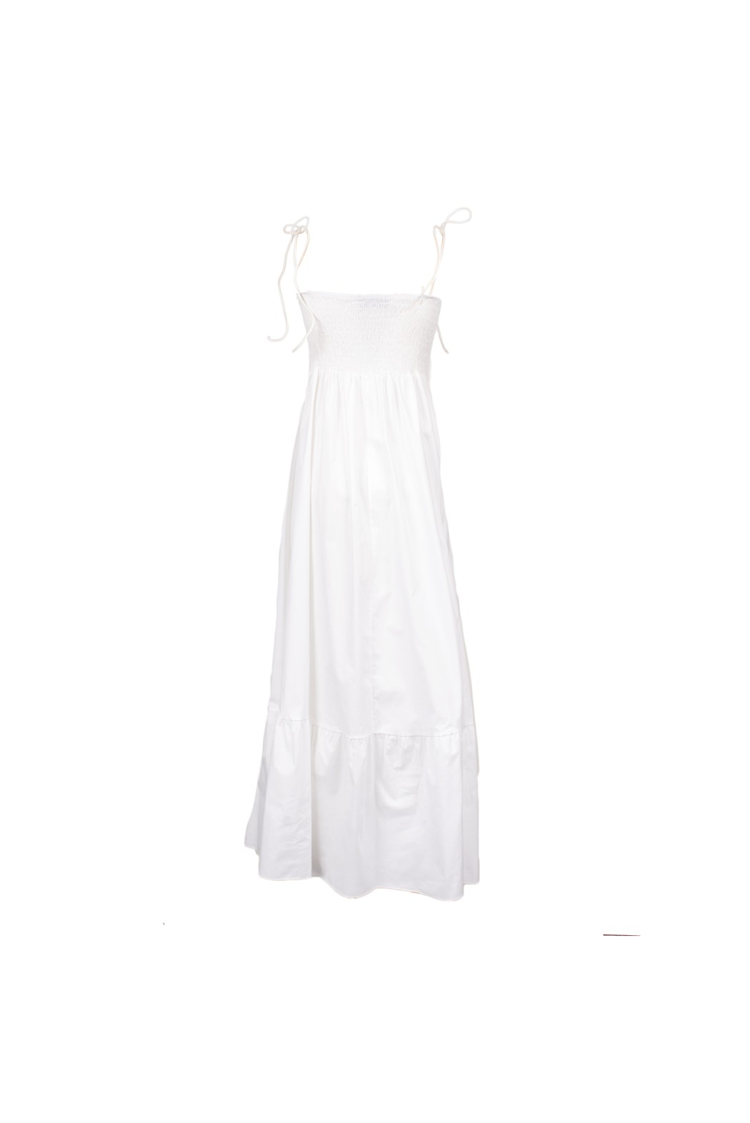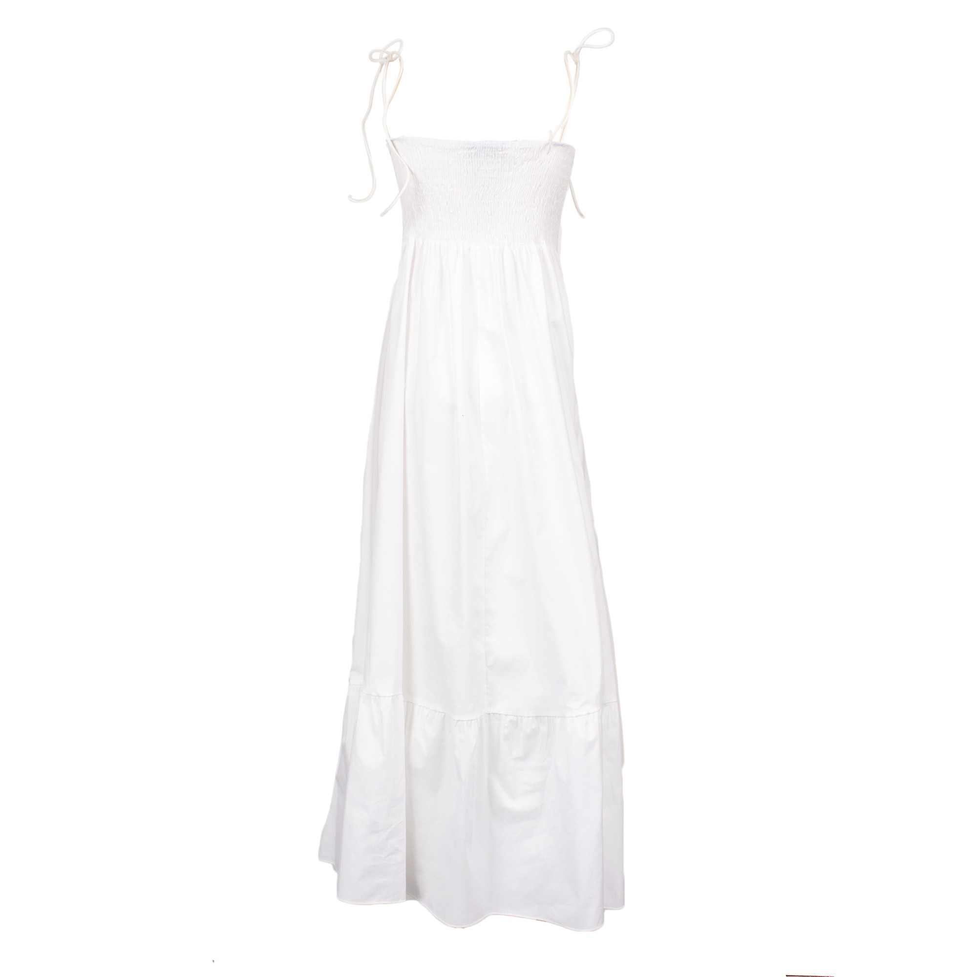 Women’s long white dress with thin straps and a structured bodice that enhances the silhouette with elegance and femininity. Flowing and luminous, perfect for refined summer looks, outdoor ceremonies, and special occasions.