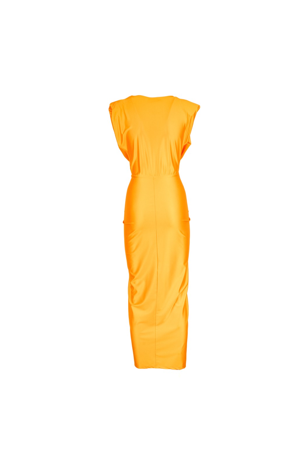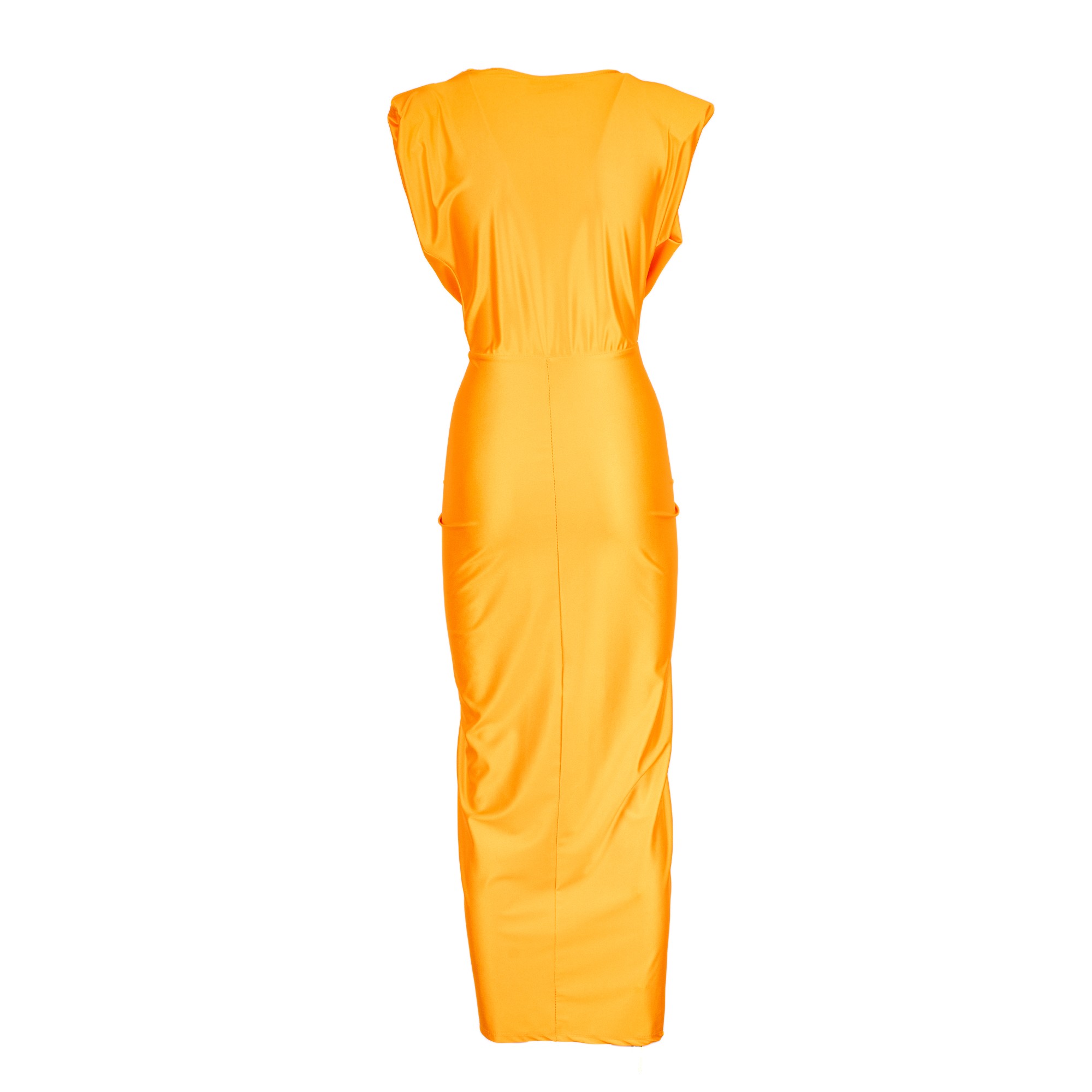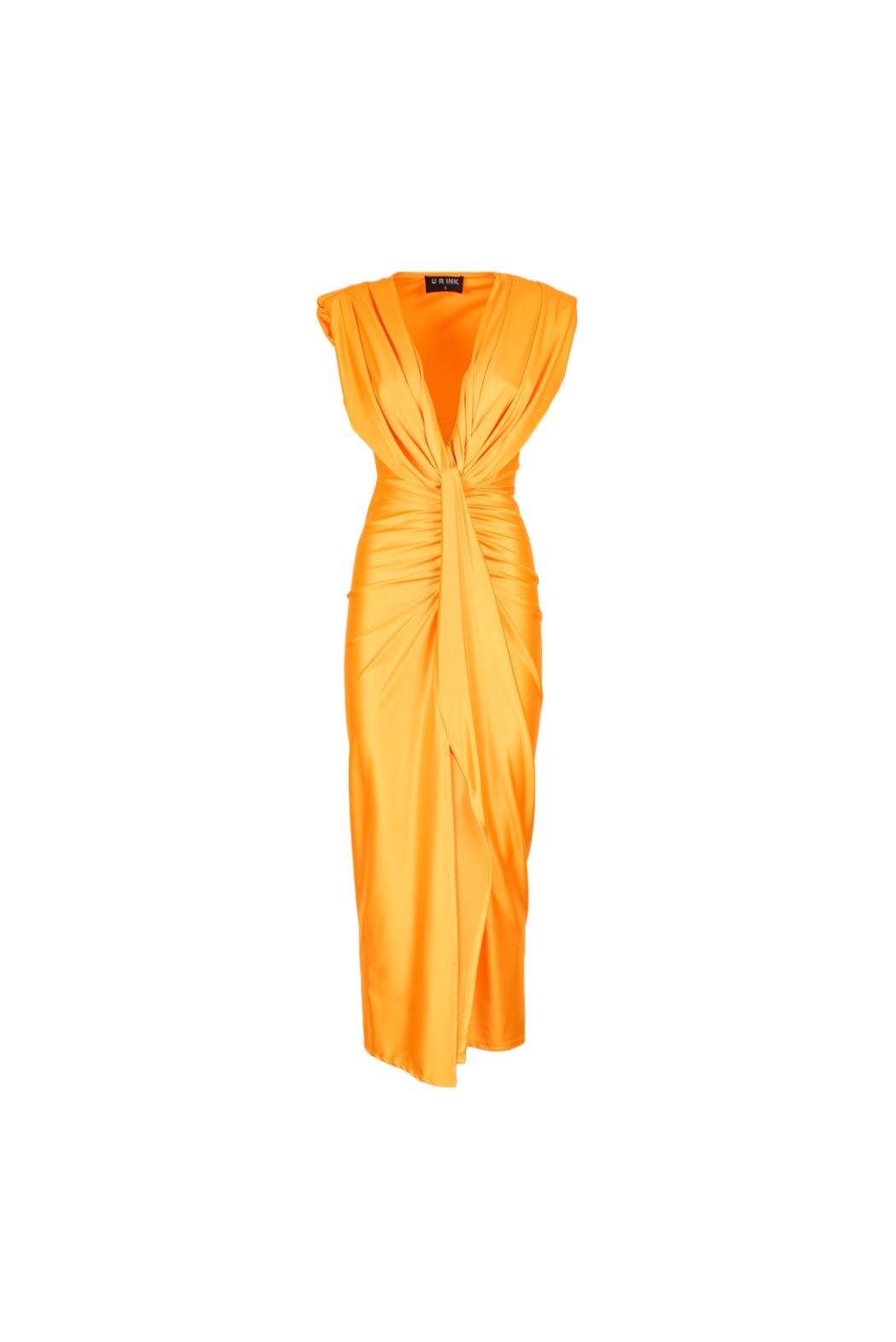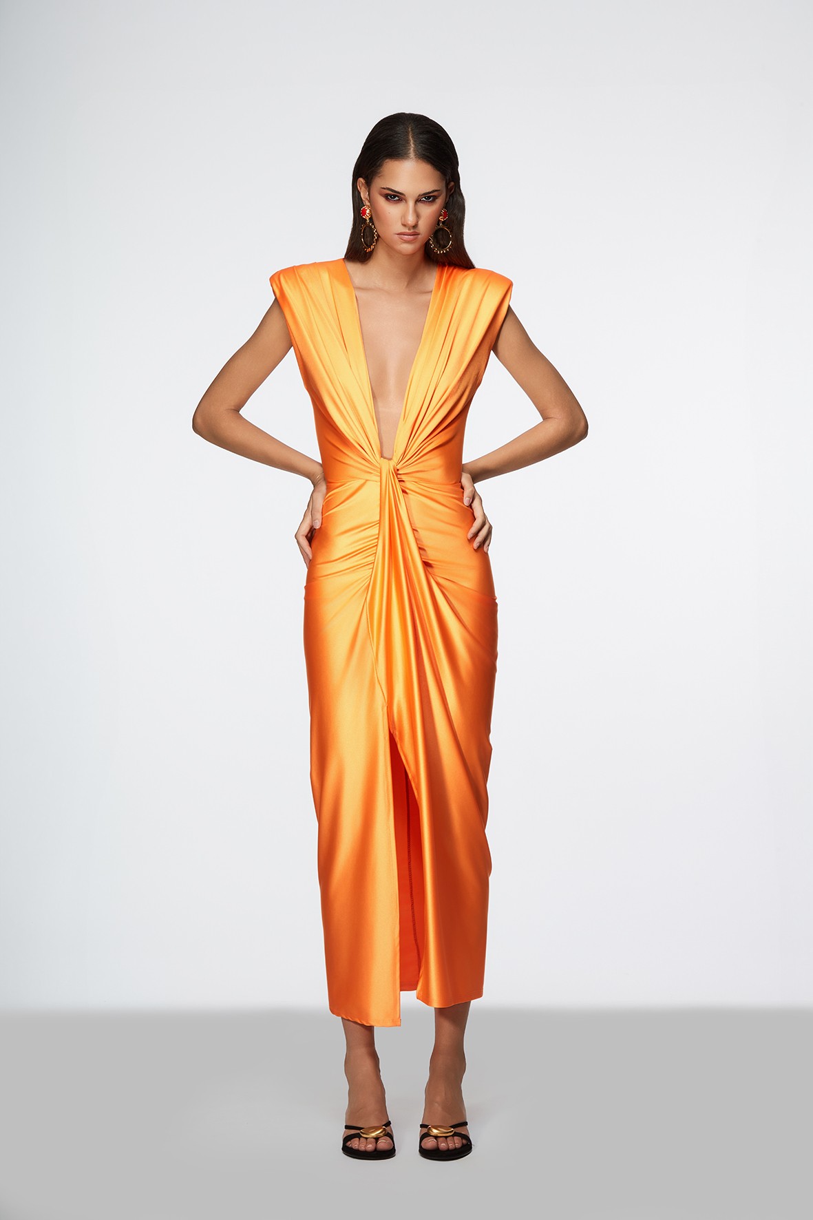 Make a bold statement with the Baru Orange Dress. This stunning maxi features a plunging V-neckline, structured power shoulders, and an elegant central twist that creates sophisticated draping. Crafted from a vibrant tangerine fabric with a silky sheen and a daring front slit, it is the ultimate choice for high-end events and evening glamour.