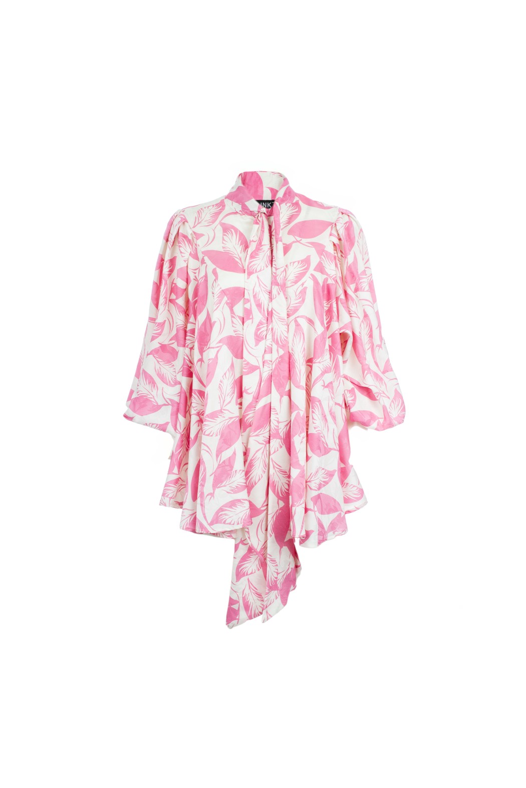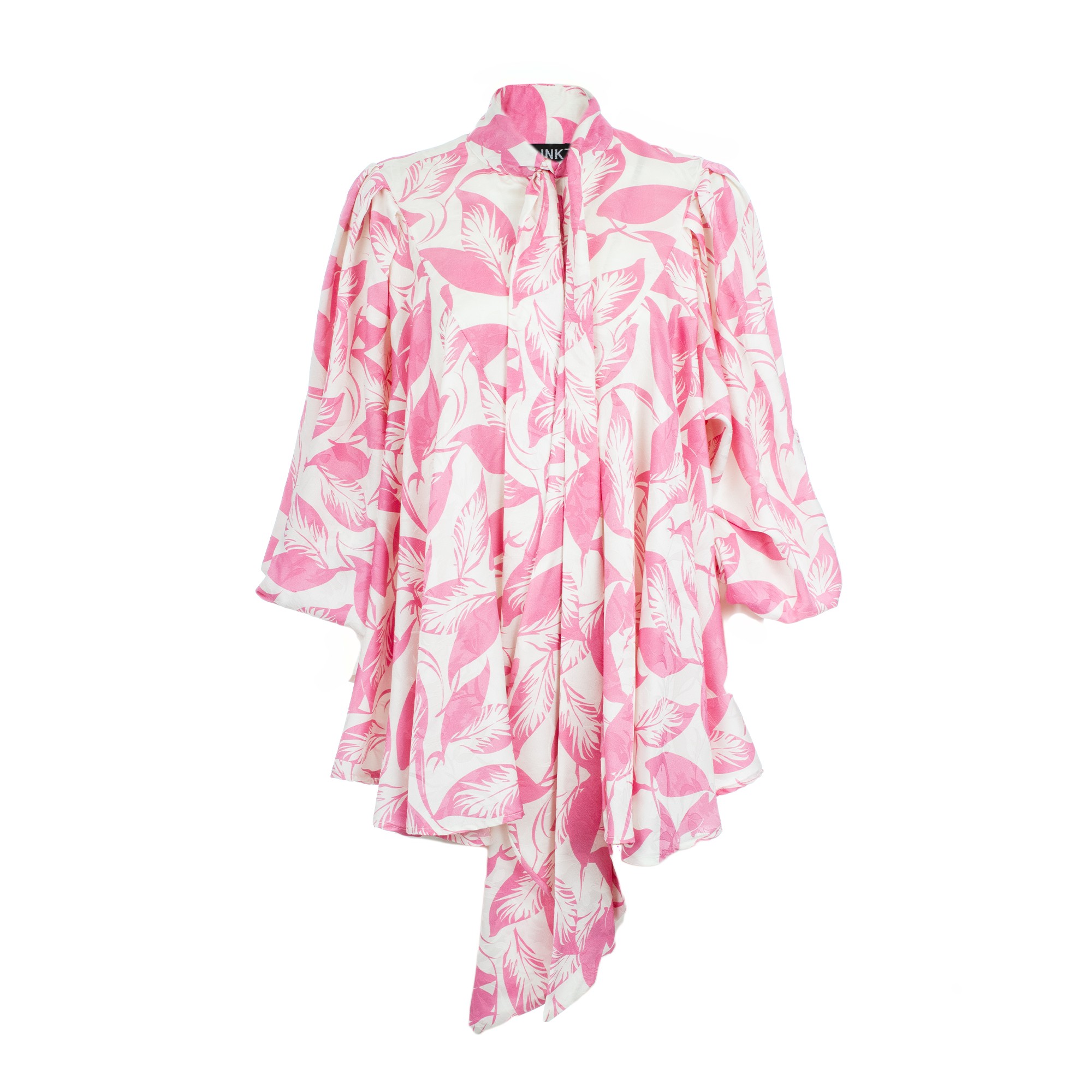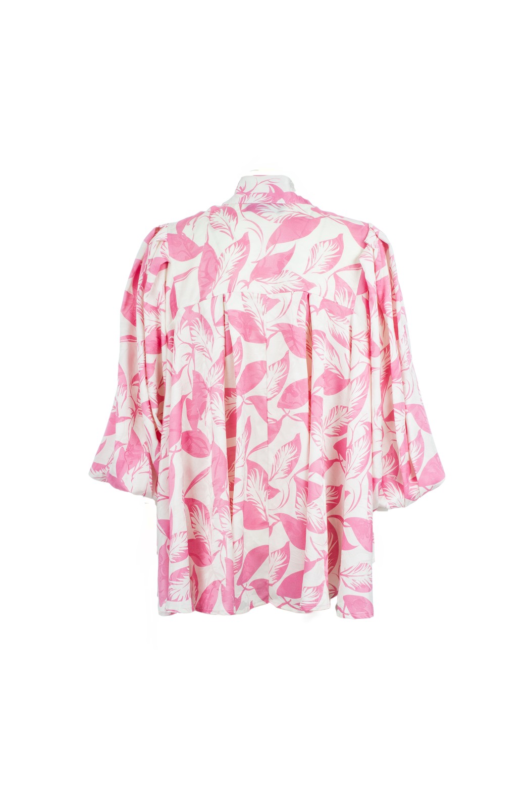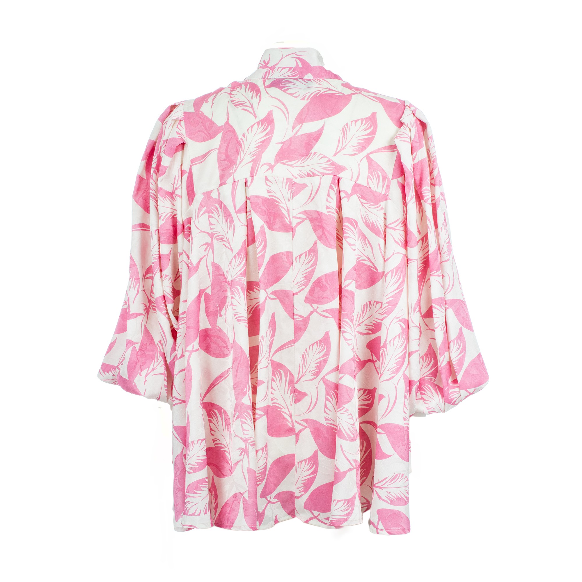 Elevate your style with the Meco pink and white blouse. This fluid, oversized piece features a vibrant leaf print and a sophisticated high neck with an adjustable tie-bow. Designed with voluminous balloon sleeves and a pleated back for a graceful drape, it’s the perfect blend of romance and modern elegance for any occasion.