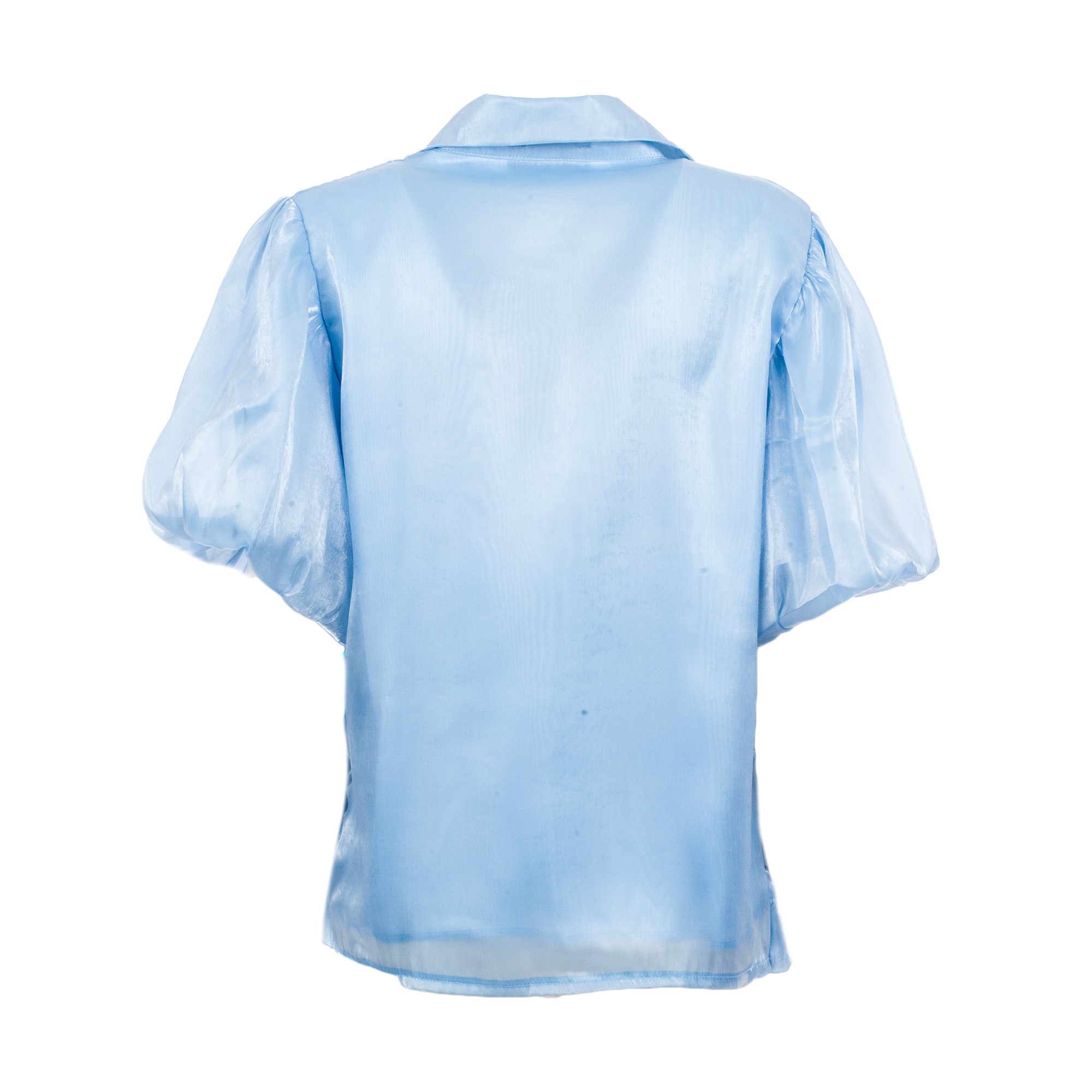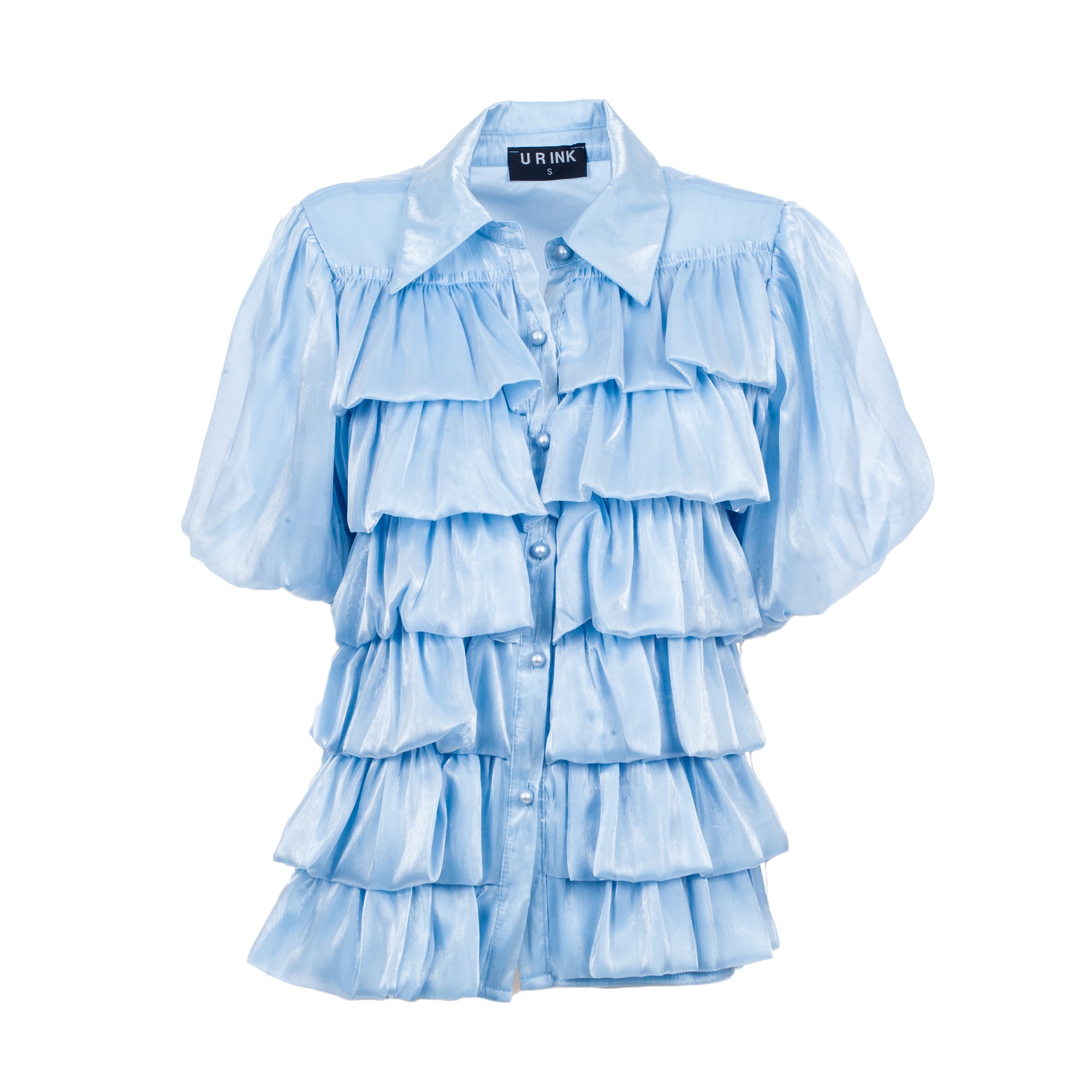 Make a statement with the Espiel Celeste Shirt. Featuring eye-catching tiered ruffles and voluminous puff sleeves, this light blue shirt offers a sophisticated metallic sheen. Its classic collar and button-down front blend timeless style with modern texture, perfect for elevating any evening or occasion look.