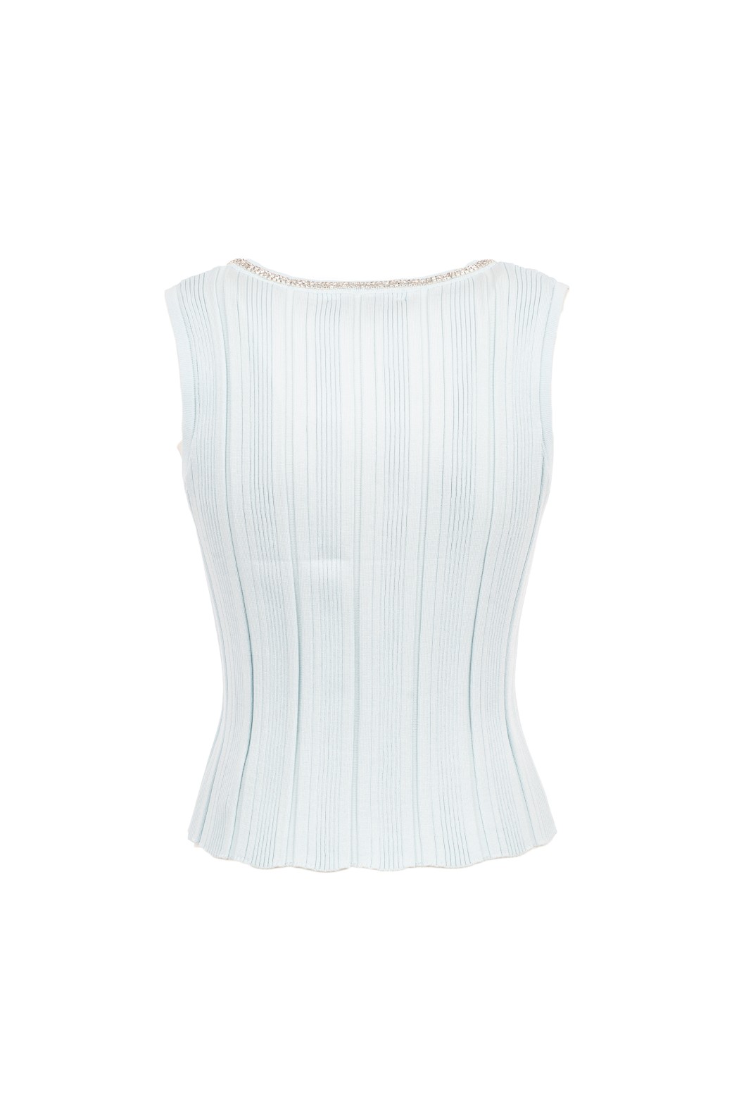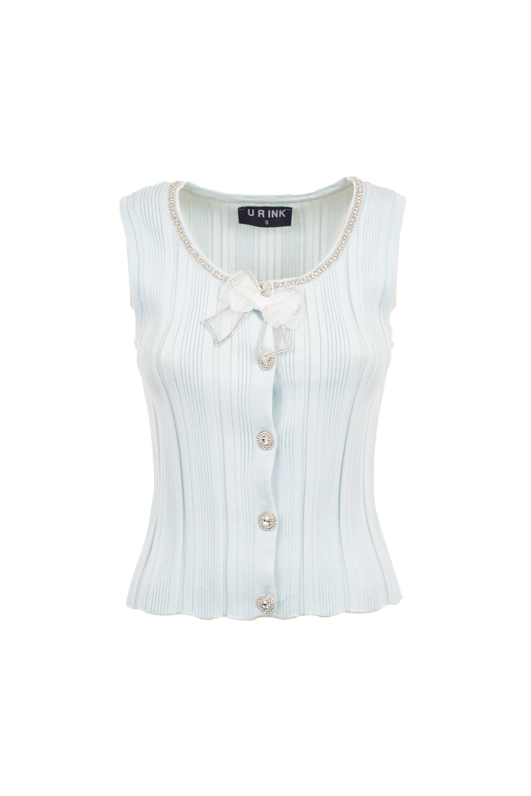 Elevate your wardrobe with the Jimenez Top in a serene celeste blue. This sleeveless ribbed knit features a crystal-trimmed neckline, a delicate organza bow, and sparkling statement buttons. Perfect for transitioning from day to evening with effortless elegance.