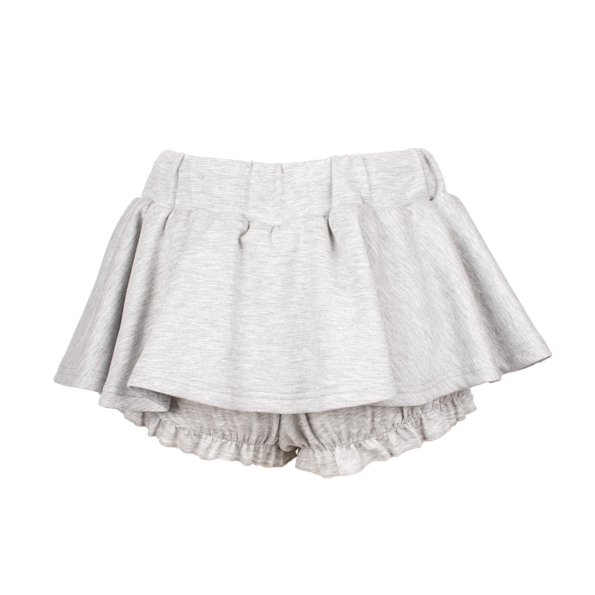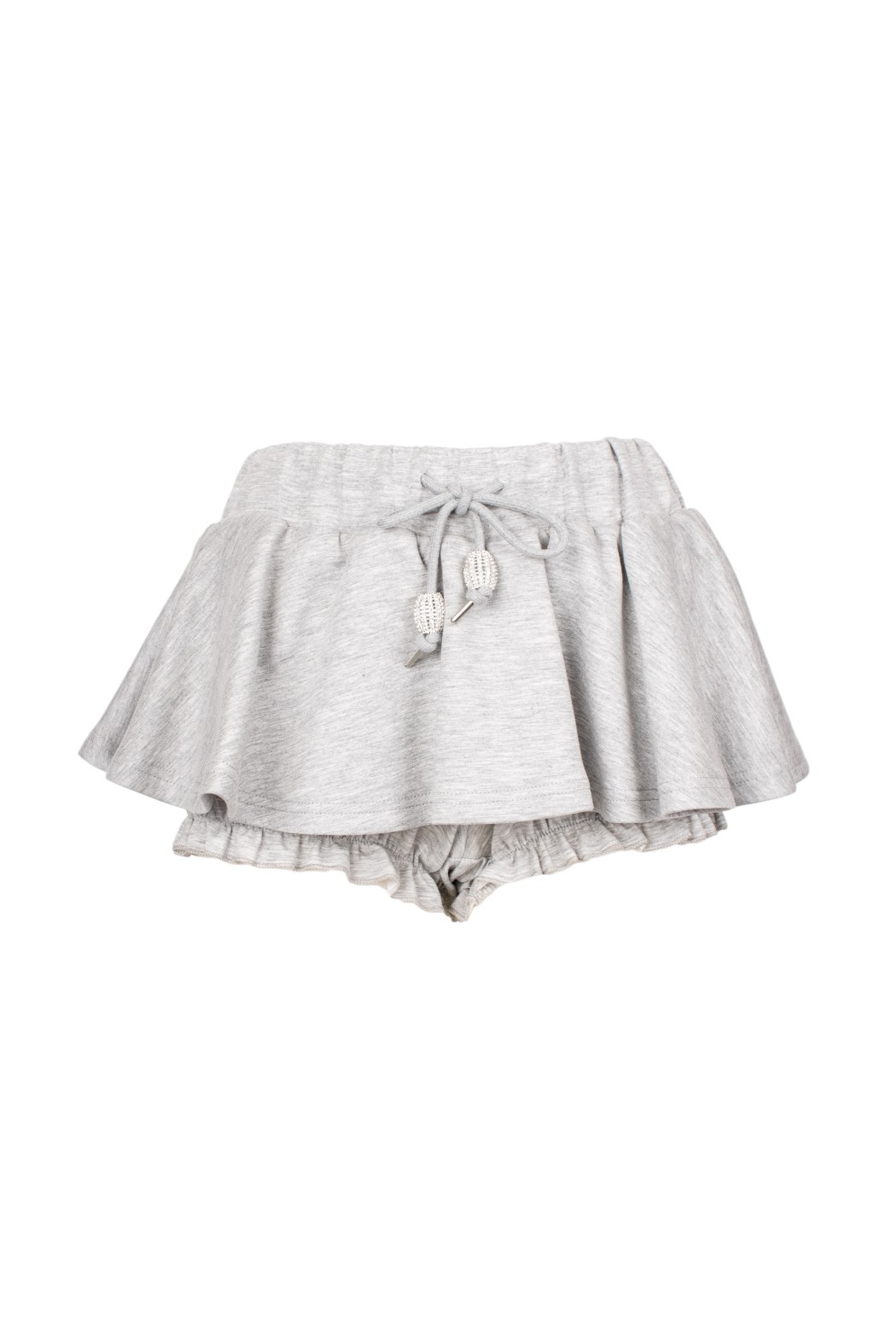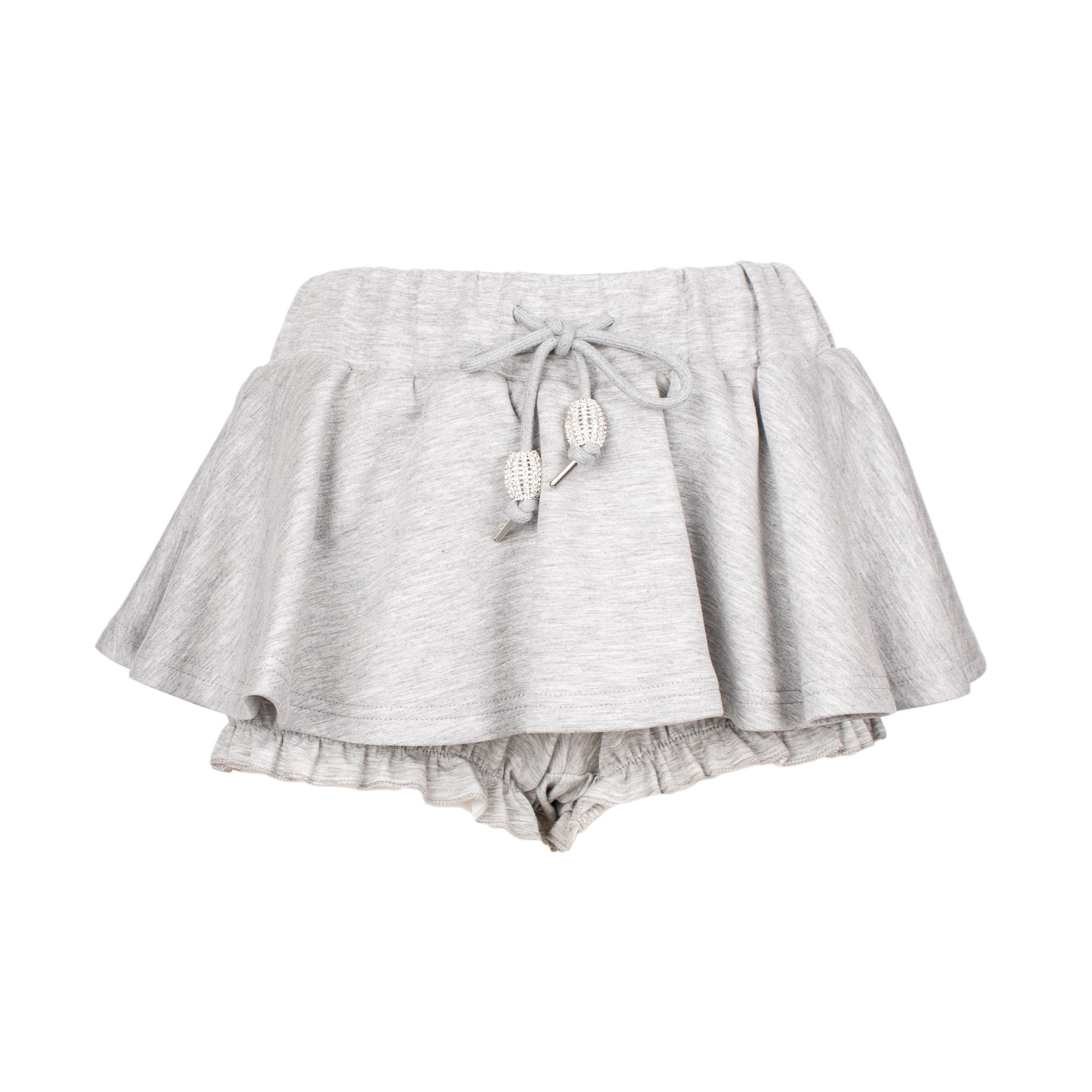 Elevate your casual style with the Jodar Shorts in Grigio. These playful grey jersey shorts feature a feminine double-layer design: a flirty ruffled skirt overlay sitting atop comfortable frilled bloomers. Finished with an adjustable drawstring waist and eye-catching crystal-encrusted toggles, they offer a perfect blend of comfort and whimsical charm for any off-duty look.