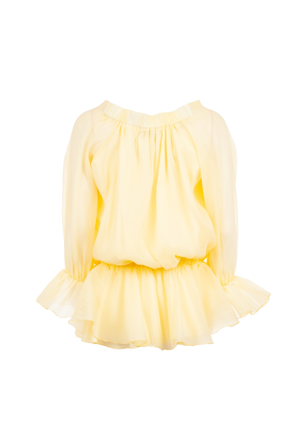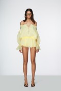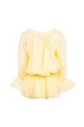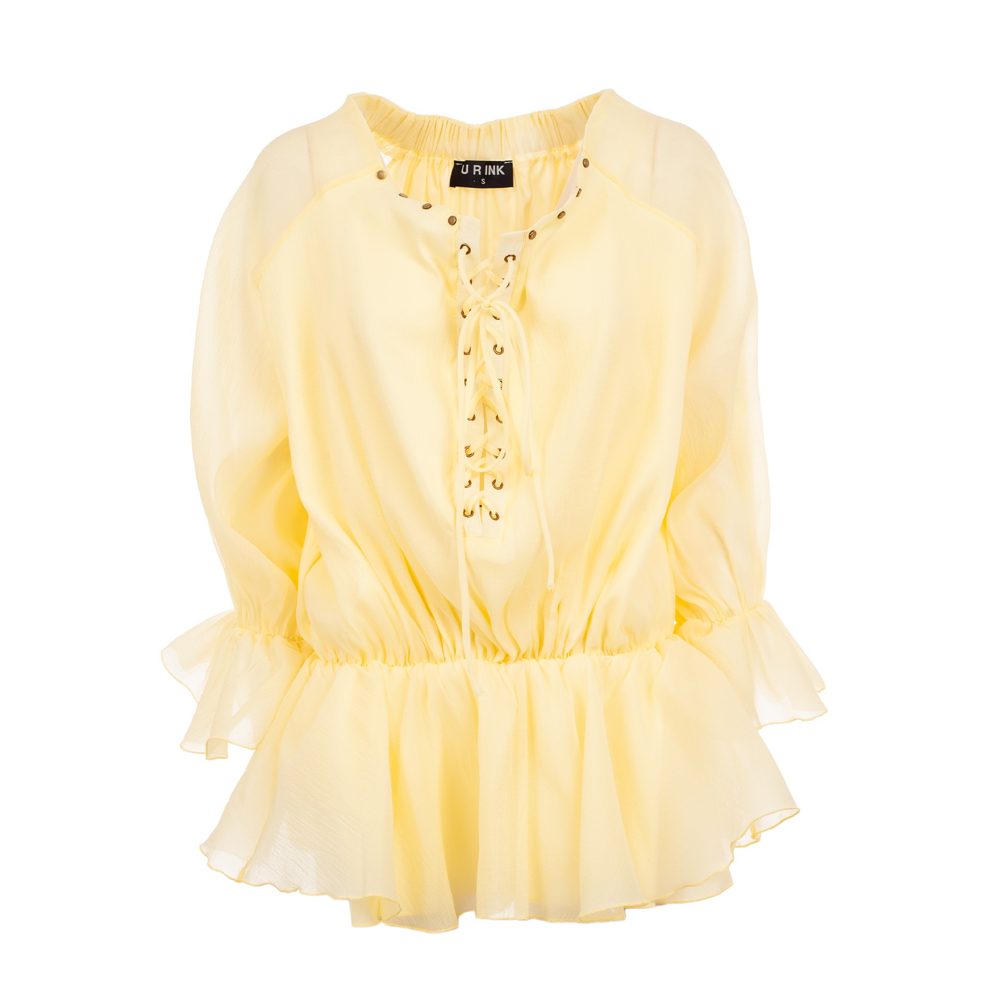 Elevate your summer wardrobe with the **URINK Jundia Yellow Dress**. Crafted from a lightweight, sheer fabric, this vibrant lemon-hued piece features a romantic lace-up front accented by gold-tone eyelets. With its versatile off-the-shoulder neckline, voluminous ruffled sleeves, and a matching peplum hem, it offers a bohemian-chic silhouette perfect for resort wear and sun-filled days.