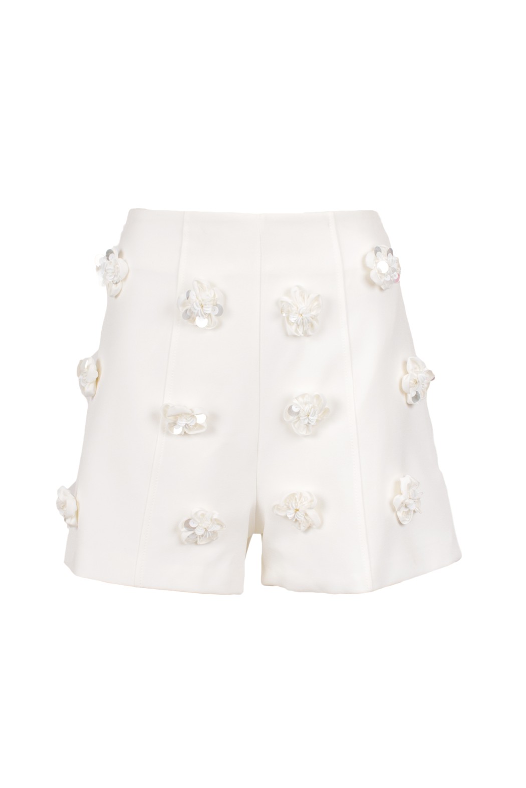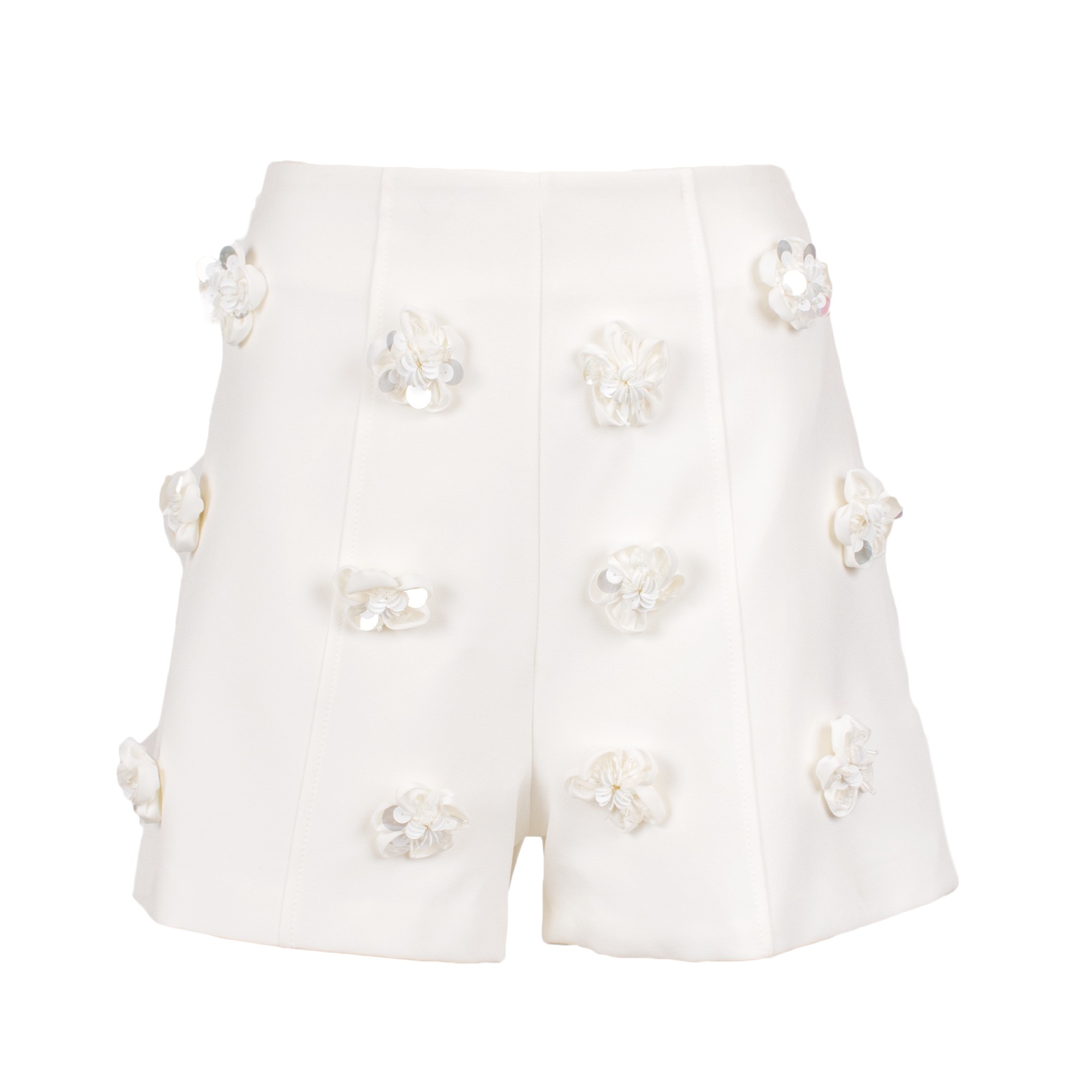 Ivory flared shorts embellished with tone-on-tone floral appliqués. Feminine and elegant, perfect for refined and luminous looks.