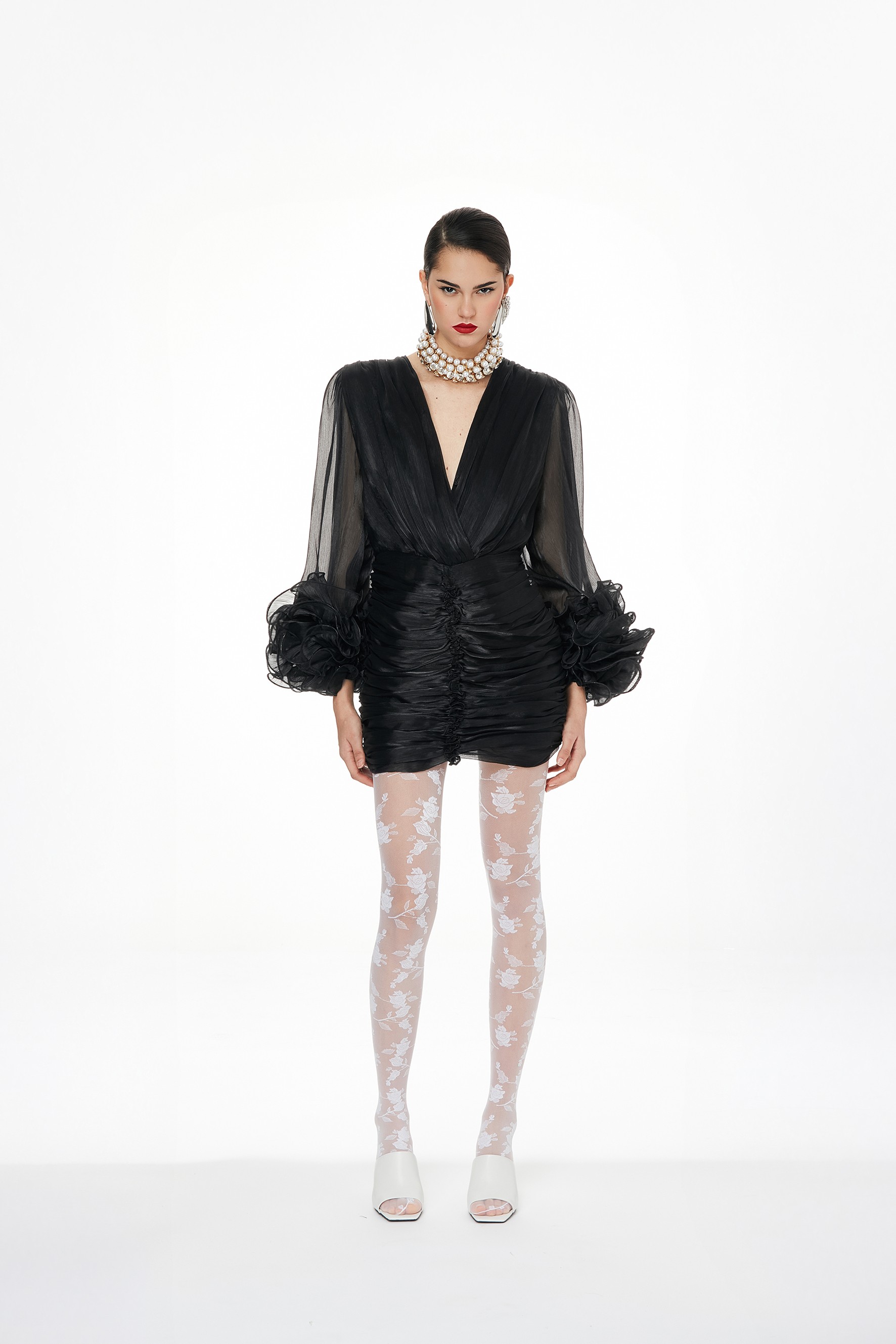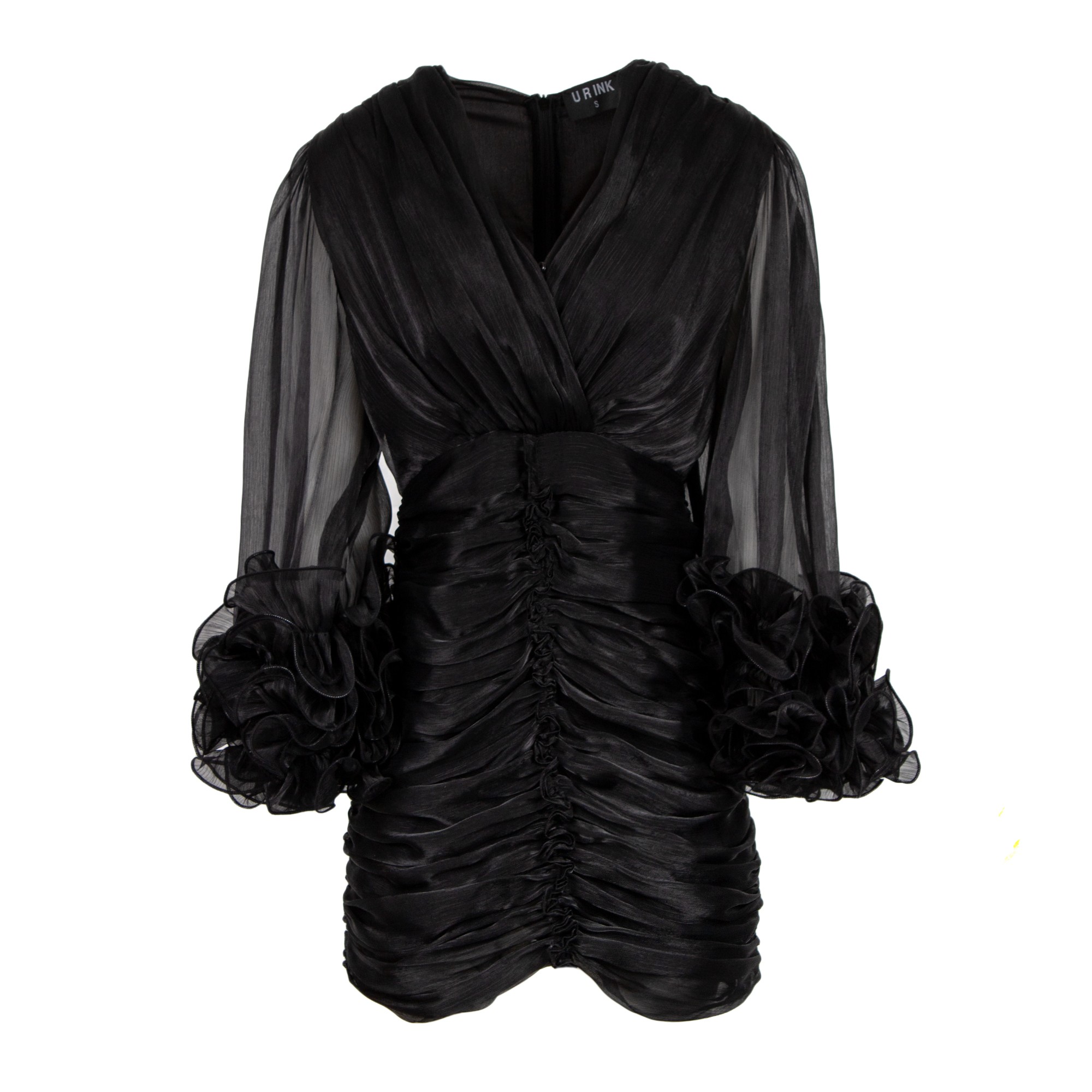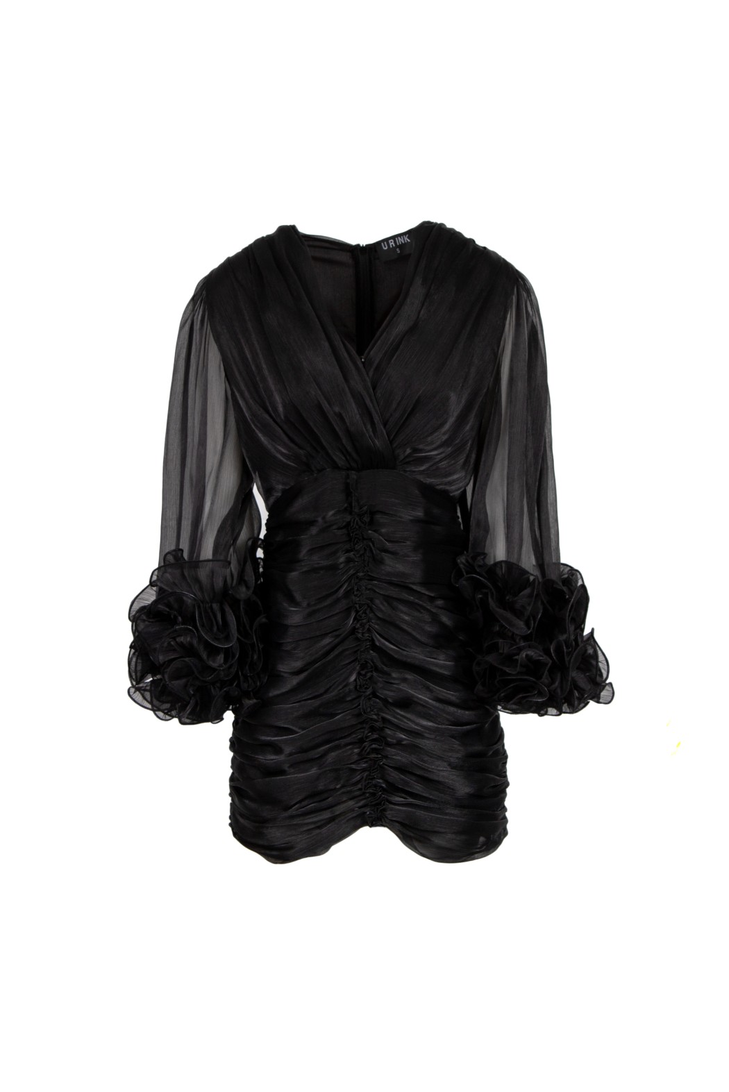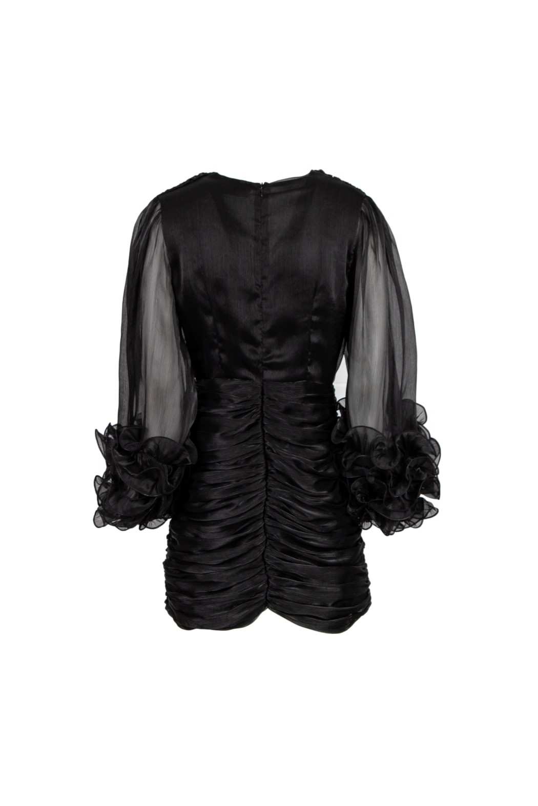 Abito corto in organza. Presenta scollo a V, maniche a tre quarti con volants e corpino arricciato.