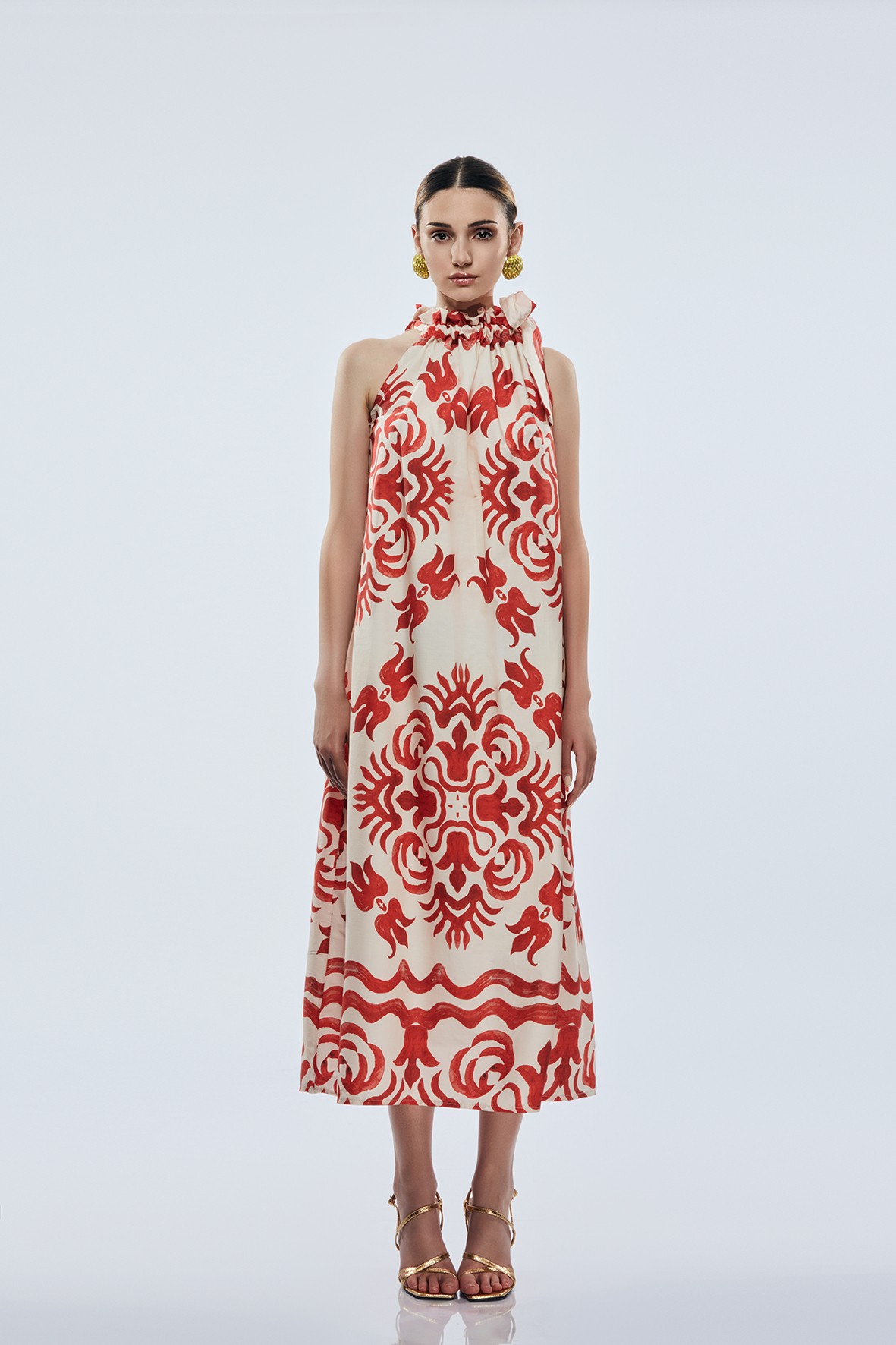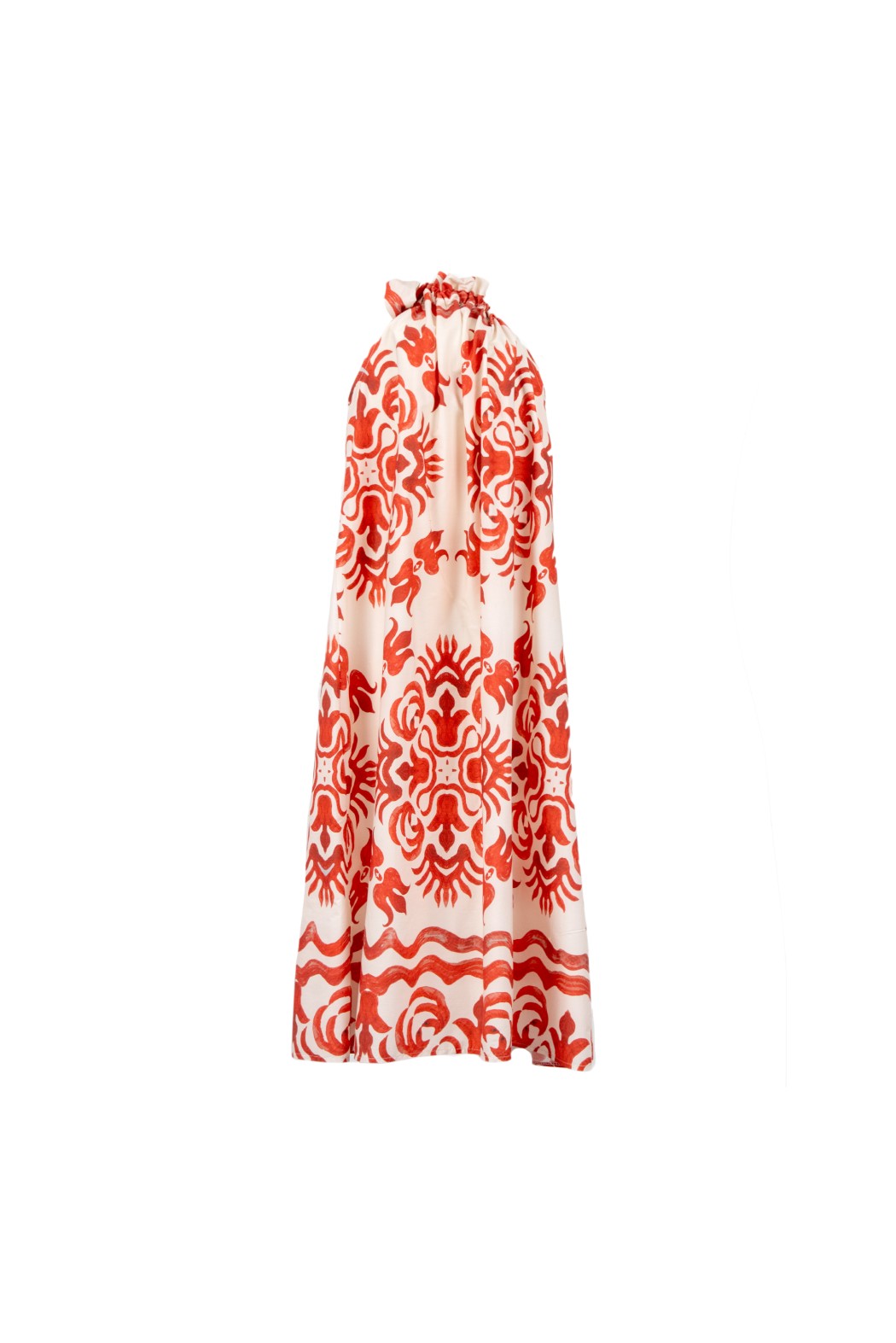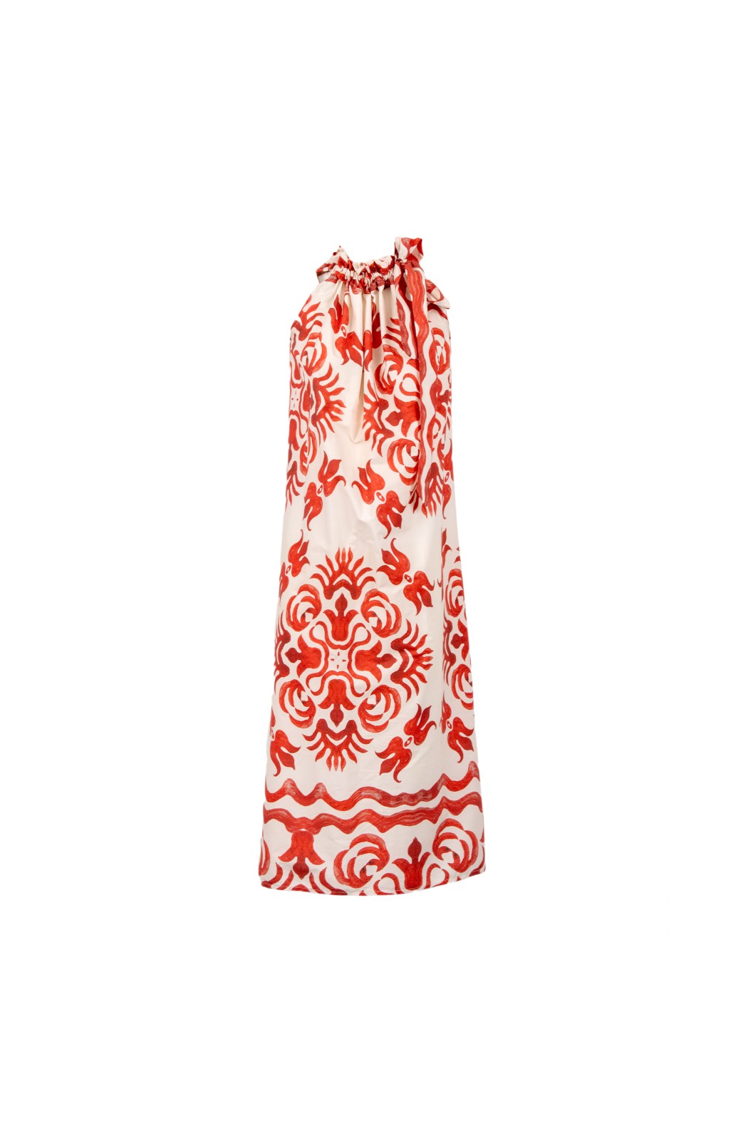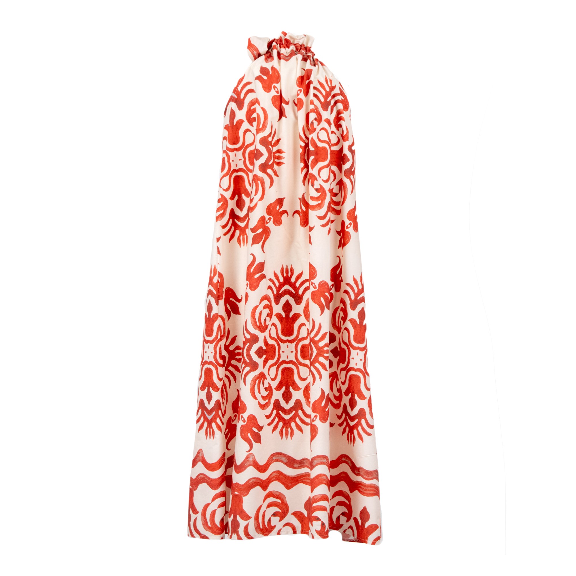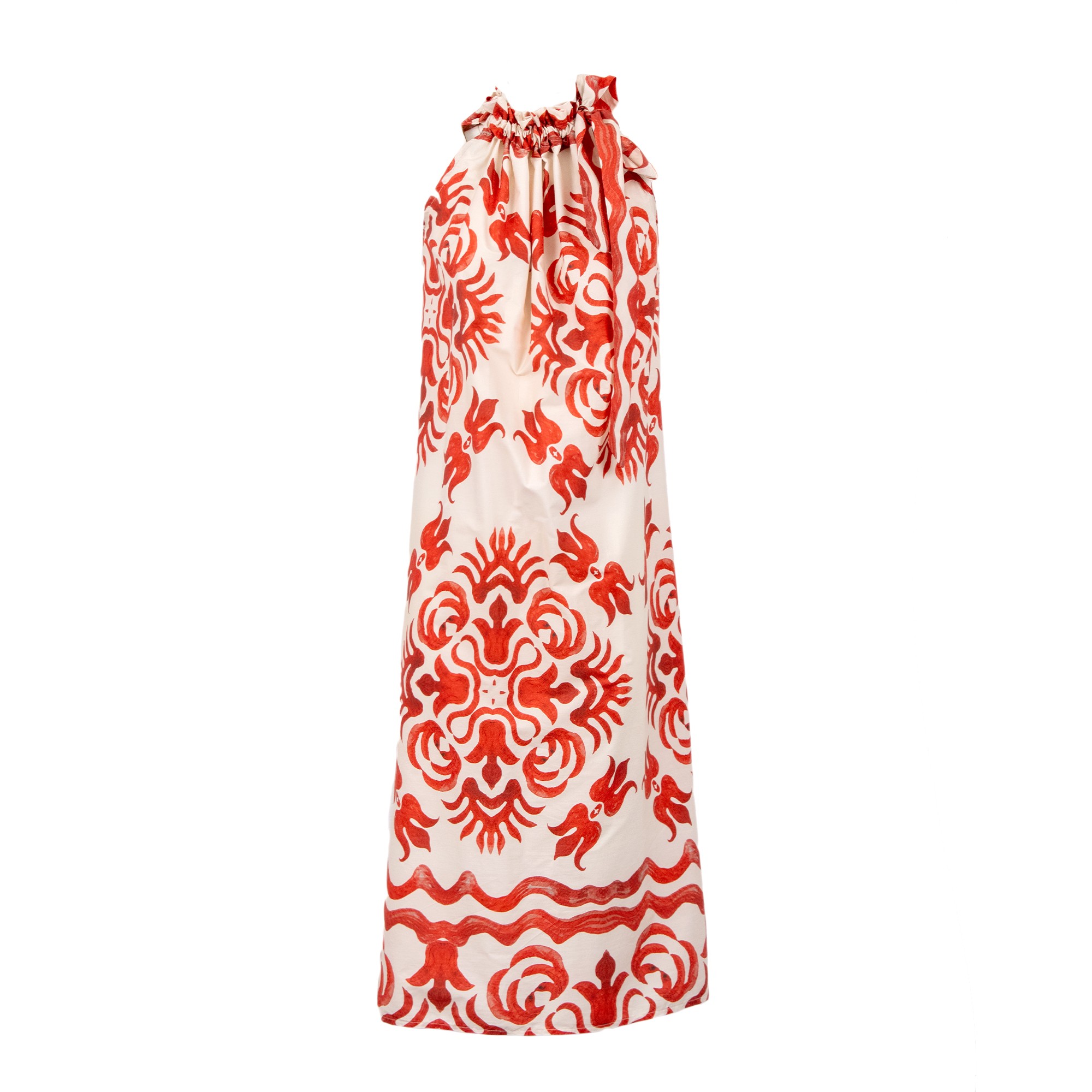 Abito lungo morbido, fantasia, legato al collo.