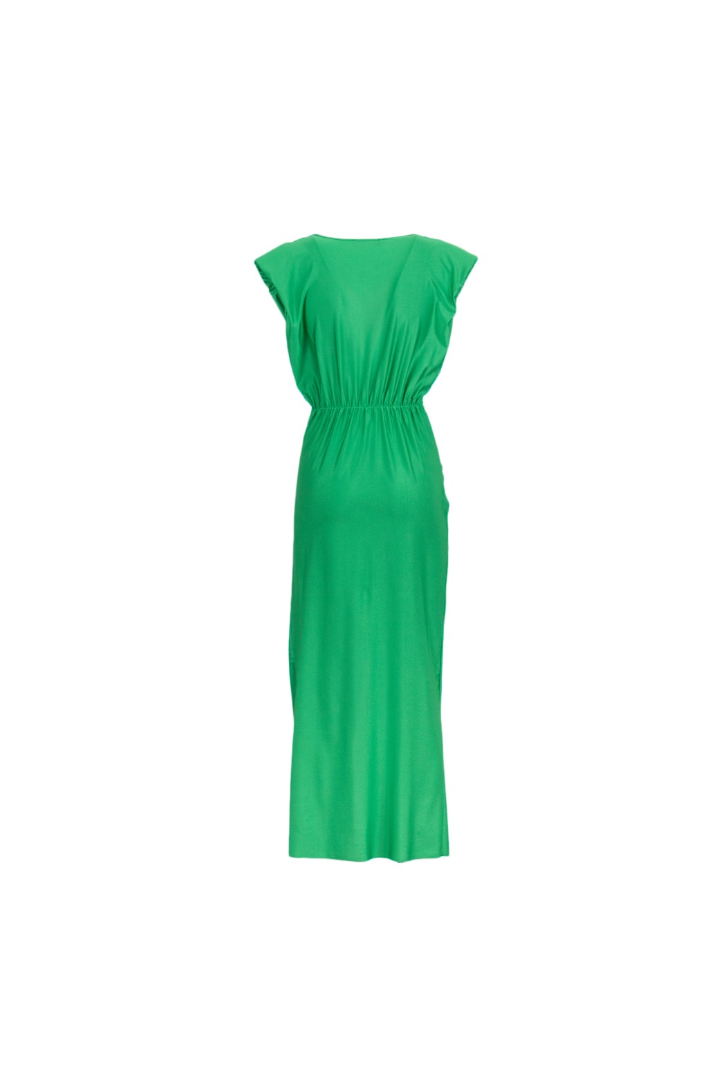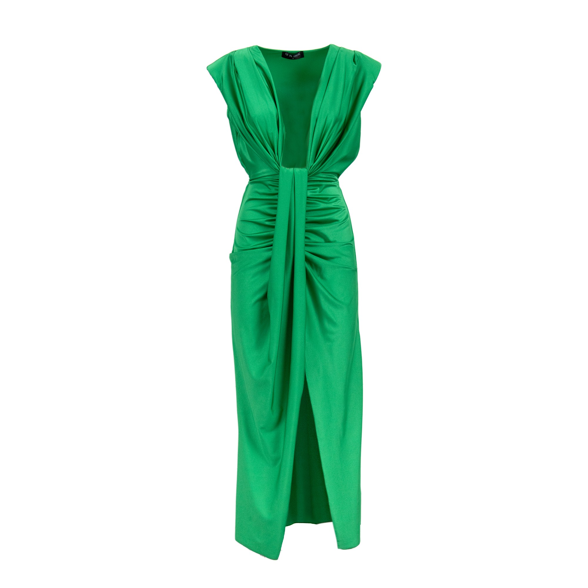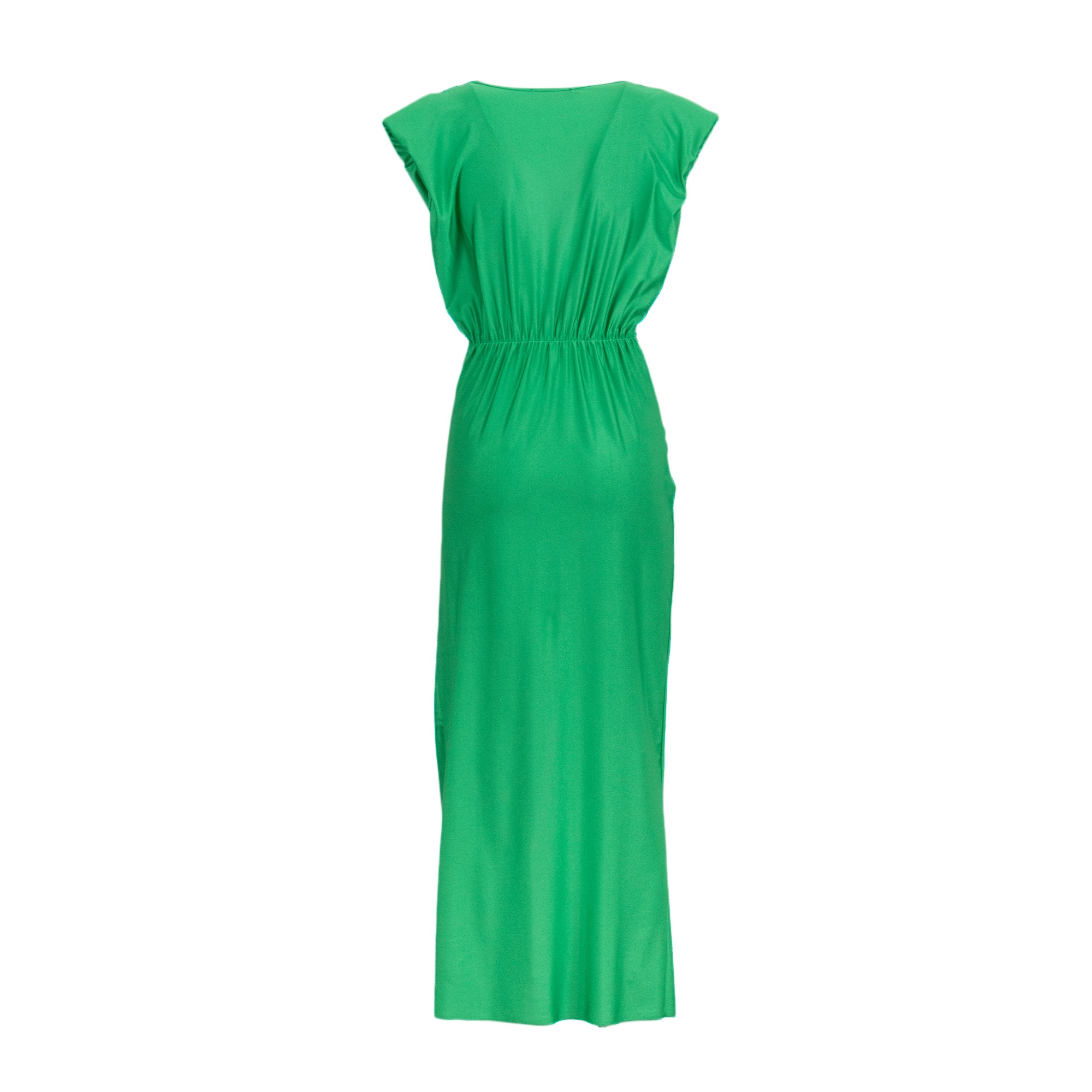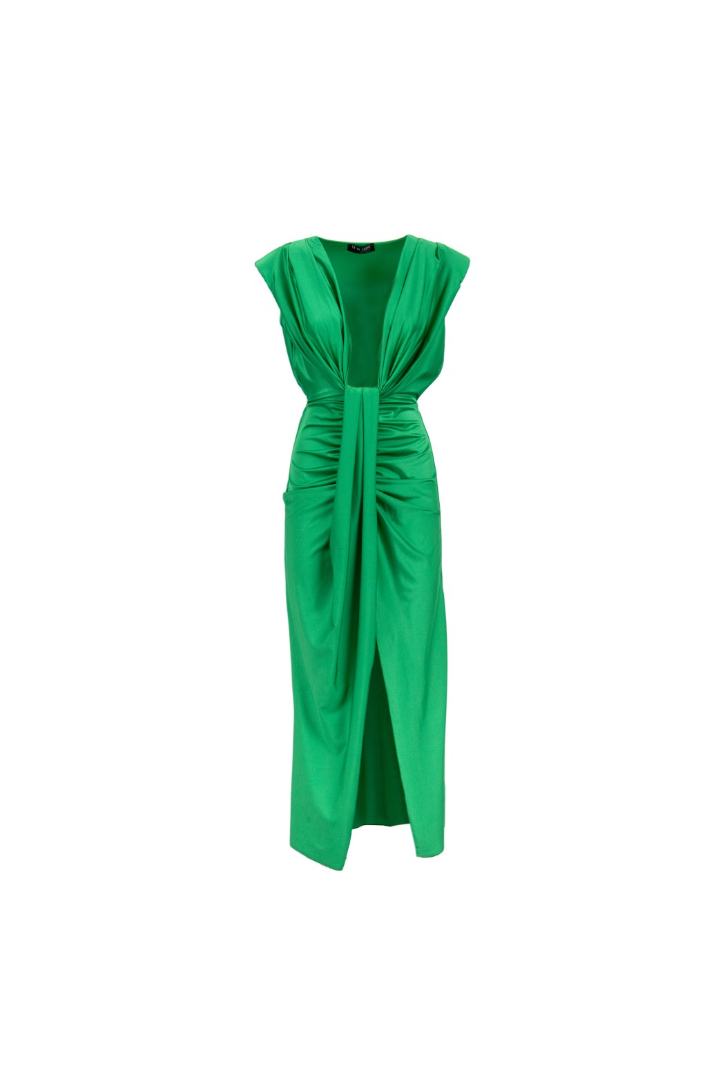 Abito lungo in tessuto elasticizzato con scollo profondo, drappeggio, nodo centrale spacco sul fronte. Spalle segnate.