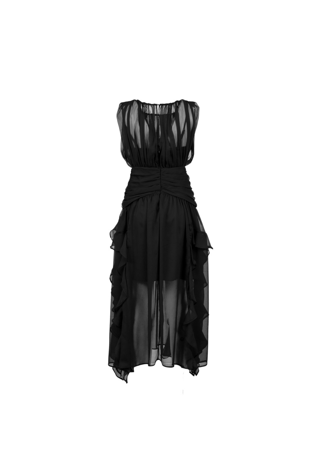 Abito lungo scollo tondo, in tessuto drappeggiato con grandi rouches.