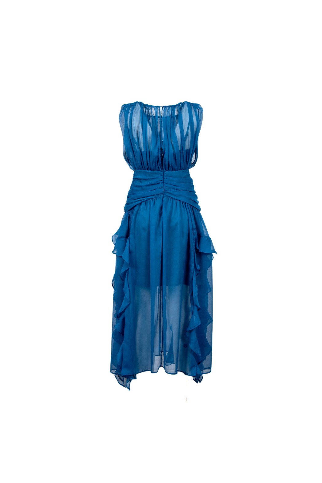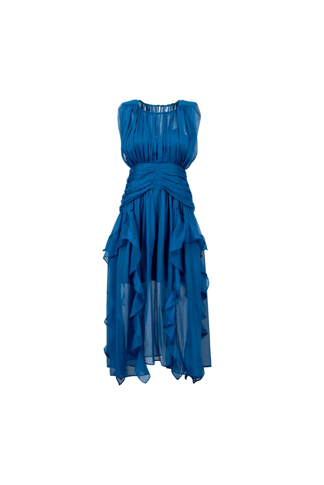 Abito lungo scollo tondo, in tessuto drappeggiato con grandi rouches.
