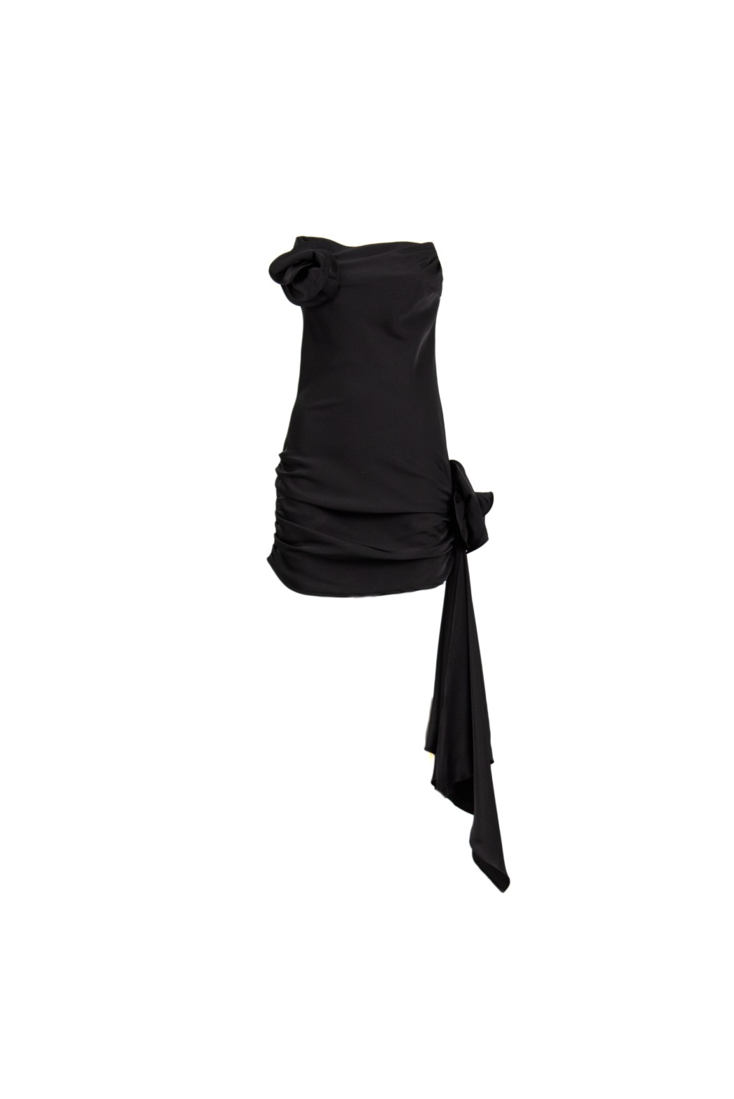 Abito mini, scollo dritto, fiori applicati, drappeggio e voulant laterale.