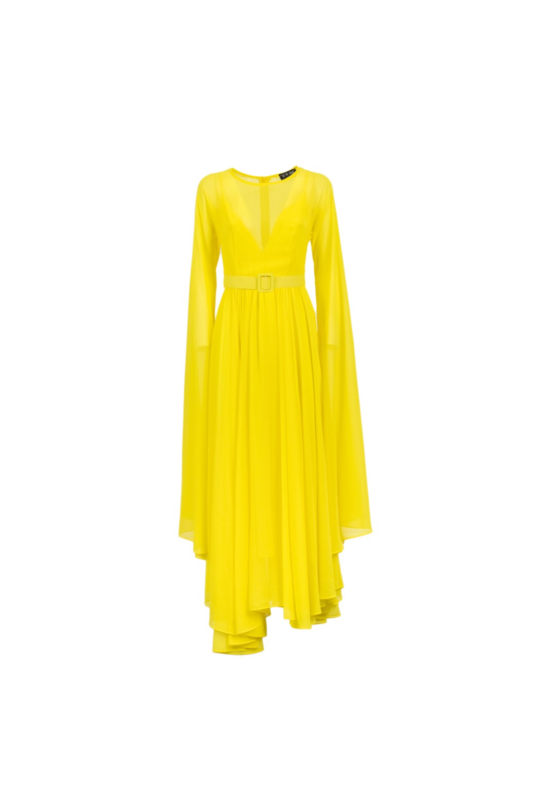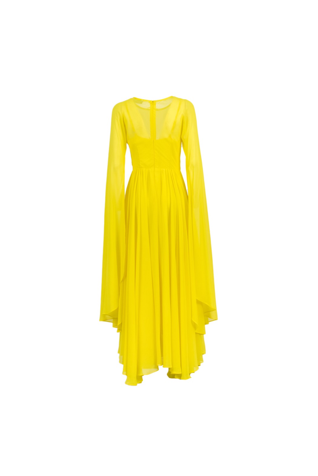 Abito lungo morbido, scollo tondo, gonna drappeggiata, con ampie maniche pipistrello a voulant. tessuto trasparente con sottoveste.