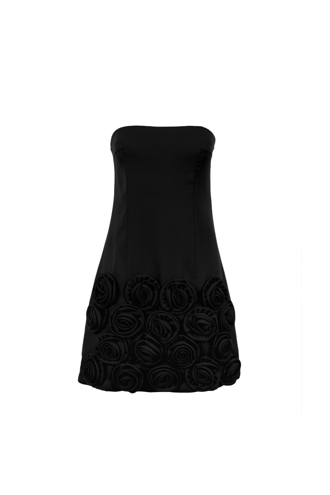 Abito mini scollo dritto, con fiori in tessuto applicati su gonna.