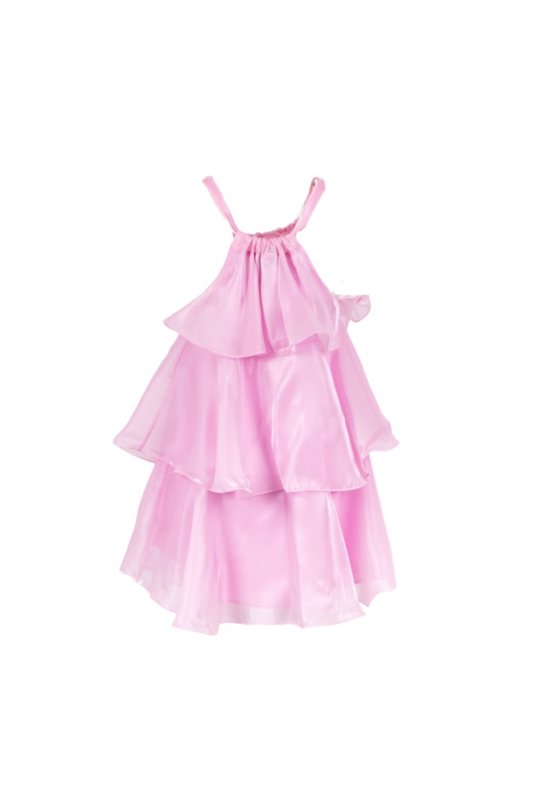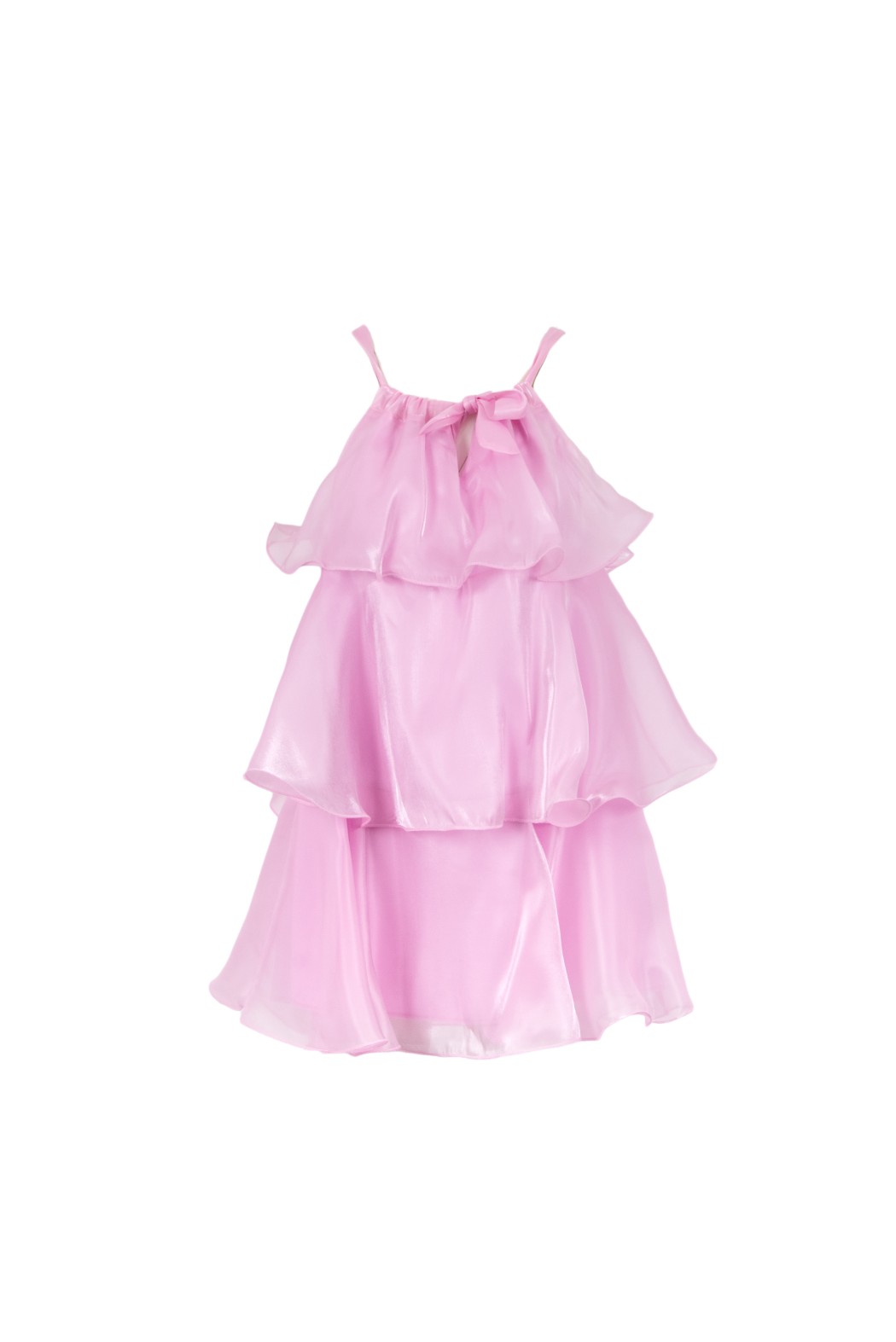 Abito mini con collo legato, tessuto drappeggiato con voulant.