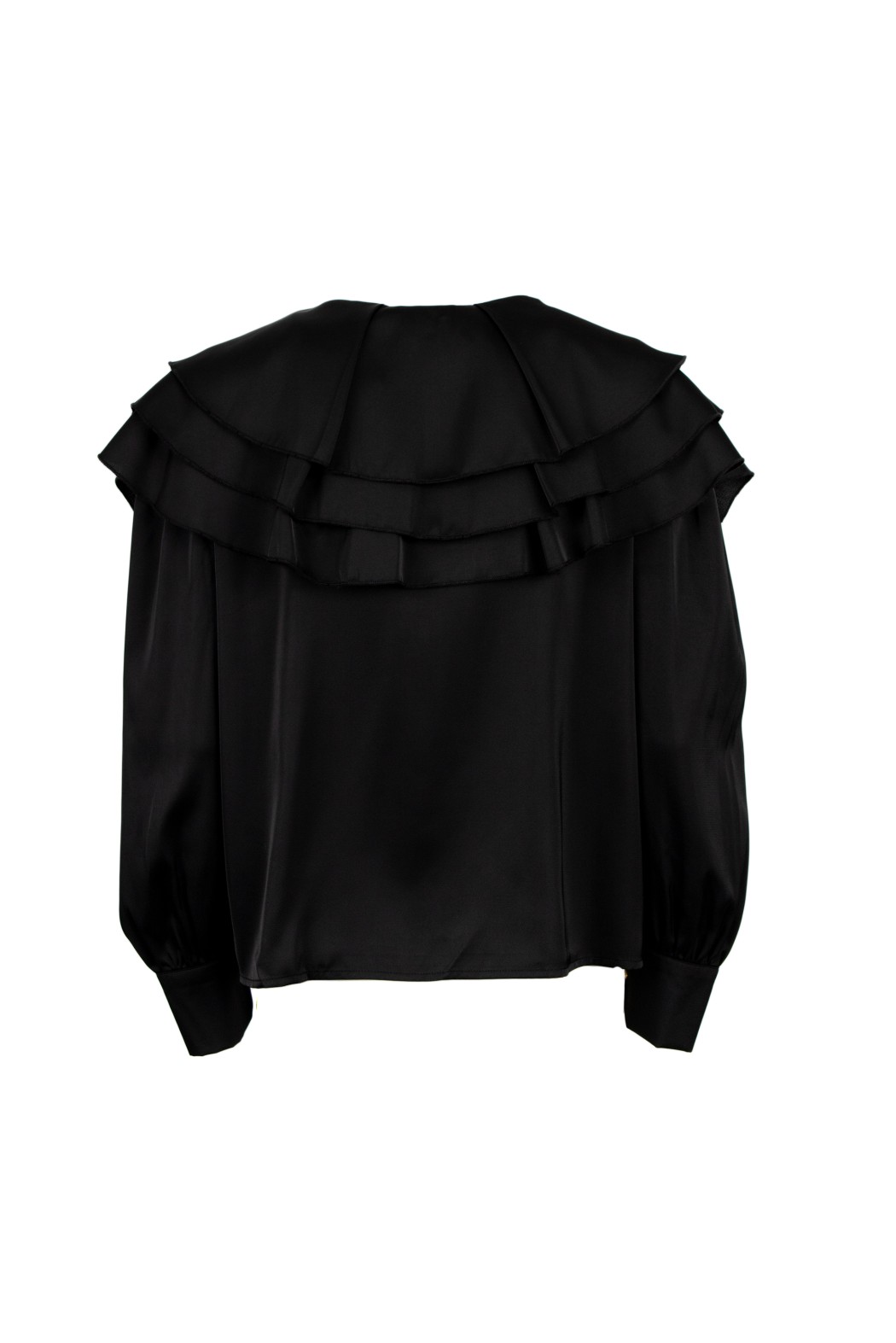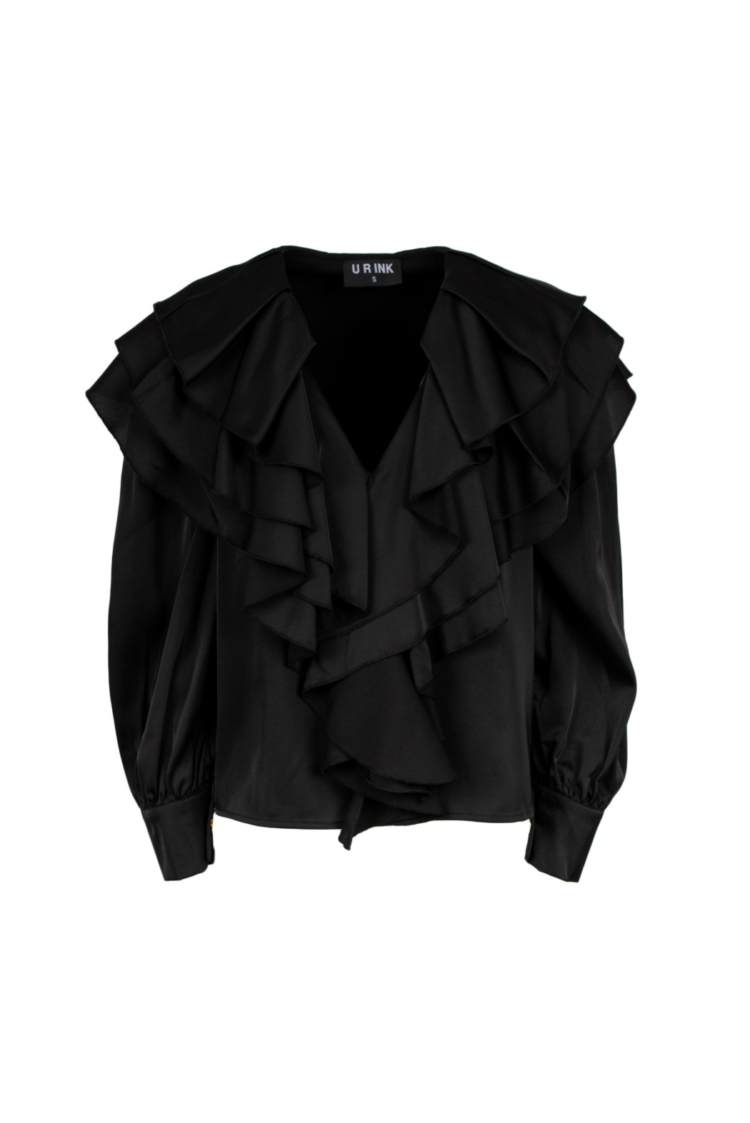 Camicia a maniche lunghe con collo a V. Il capo presenta un'applicazione a balze frontali e dei polsini alti con bottoni.
