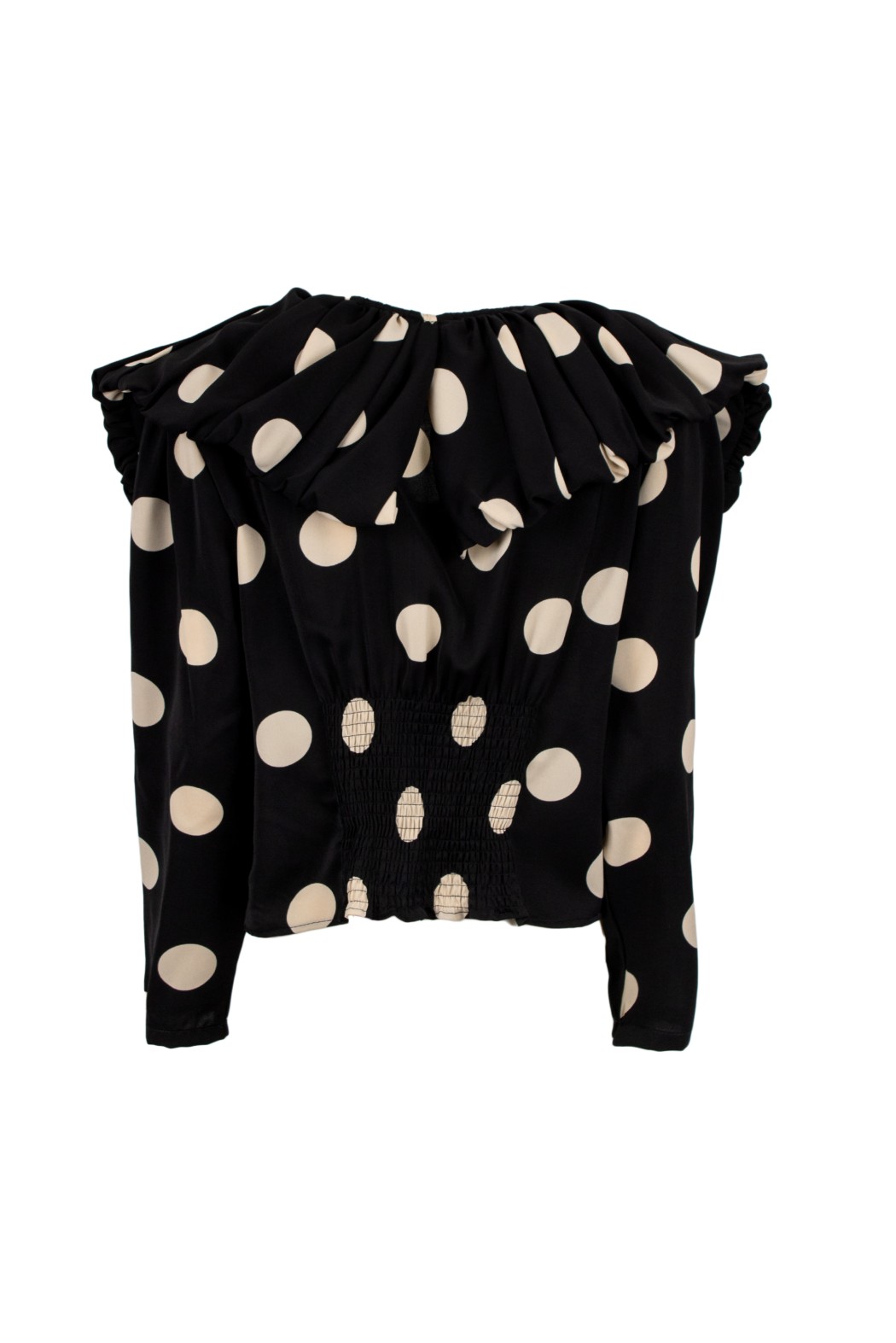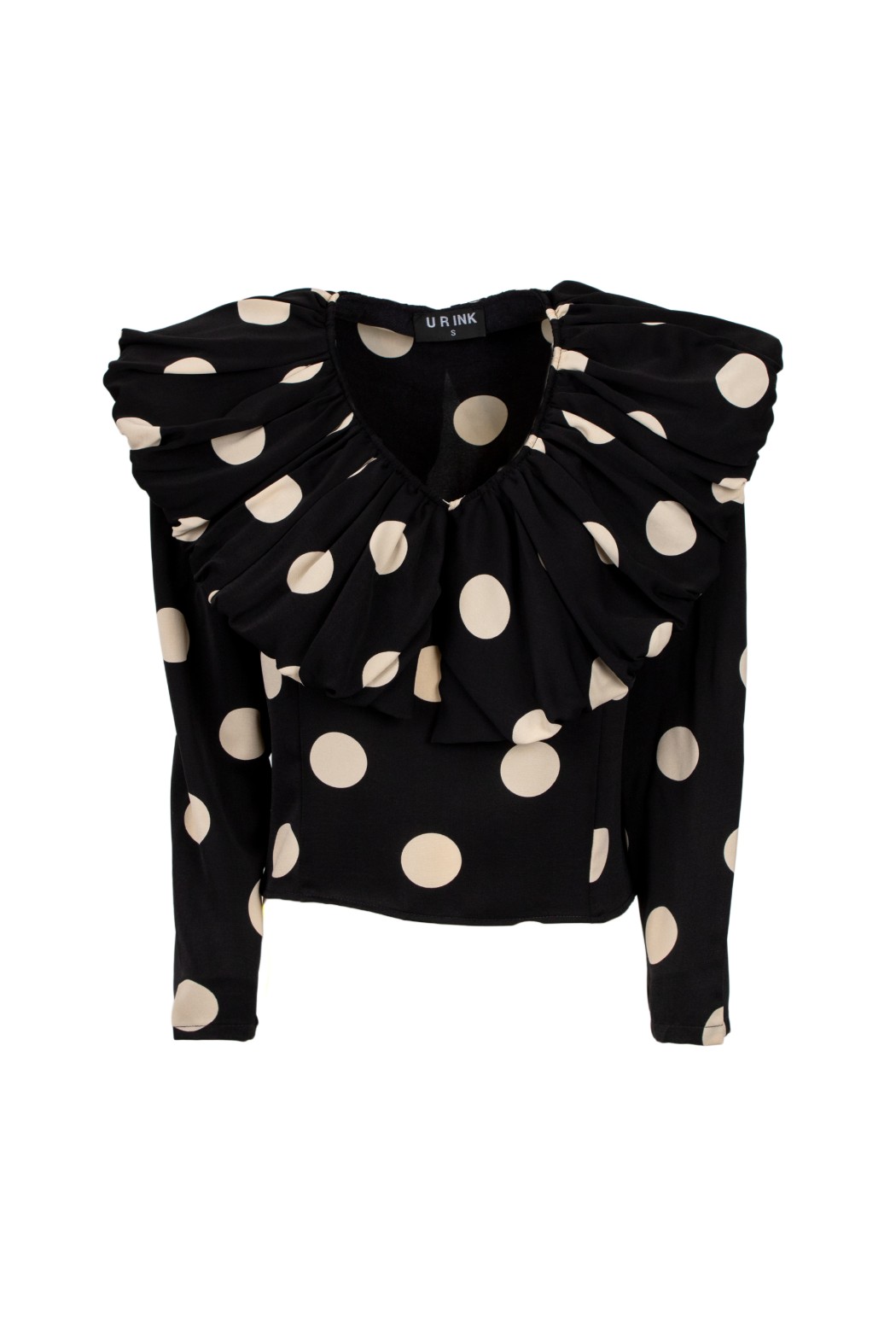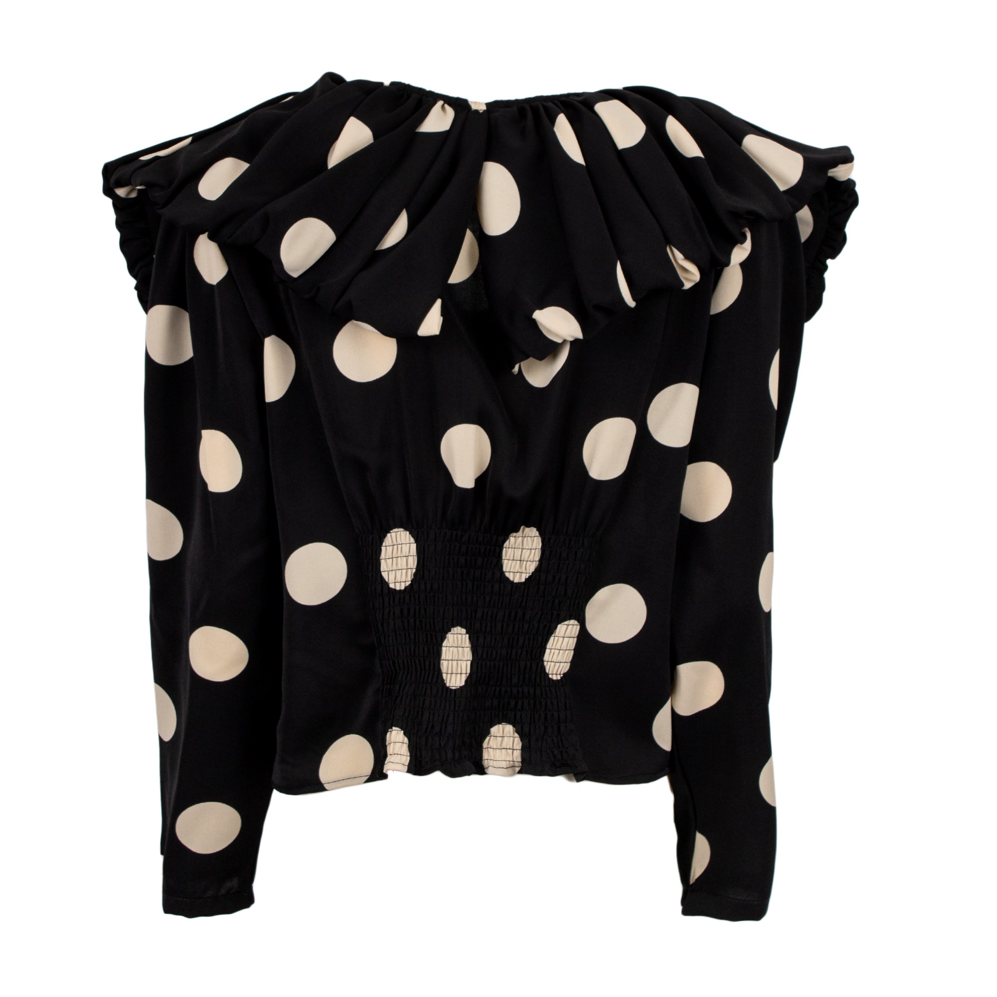 Camicia a maniche lunghe. Presenta scollo a V, motivo a pois, rouches su spalle e scollo.