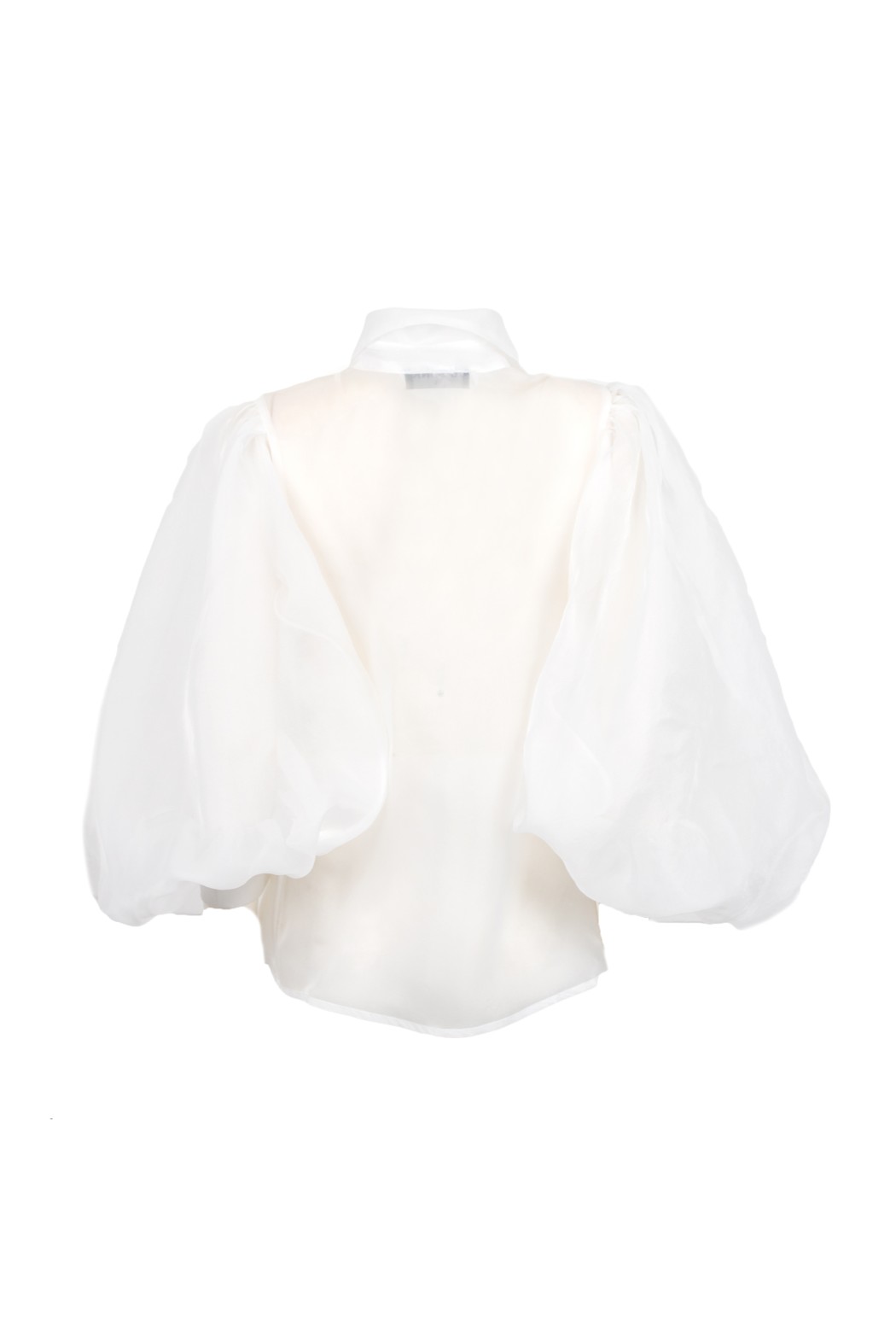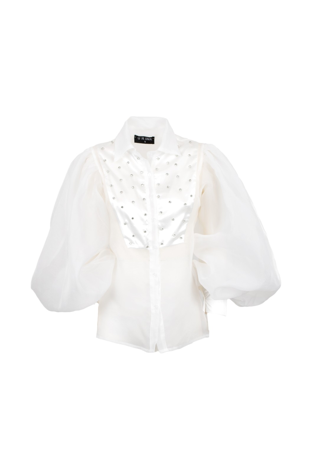 Camicia in organza con maniche a sbuffo. Presenta un corpetto in raso con applicazioni di strass e chiusura frontale con bottoni.