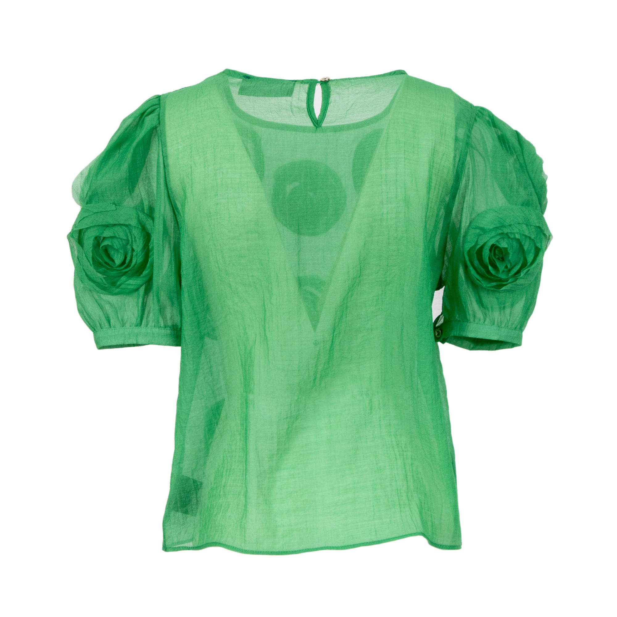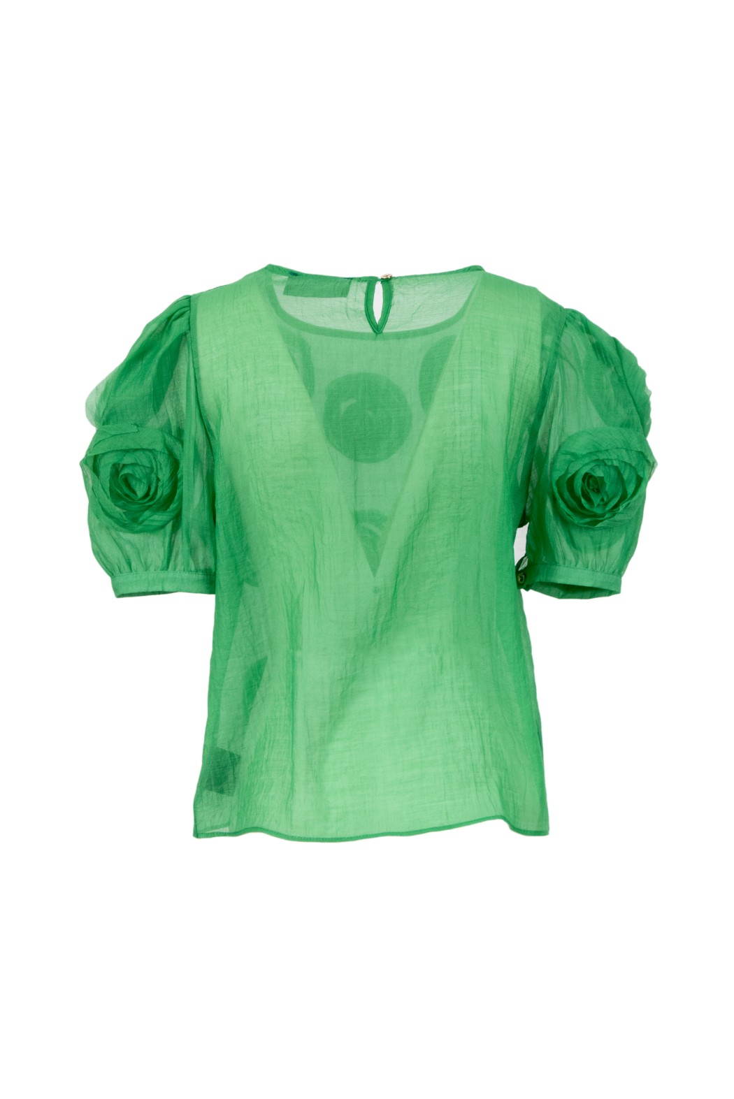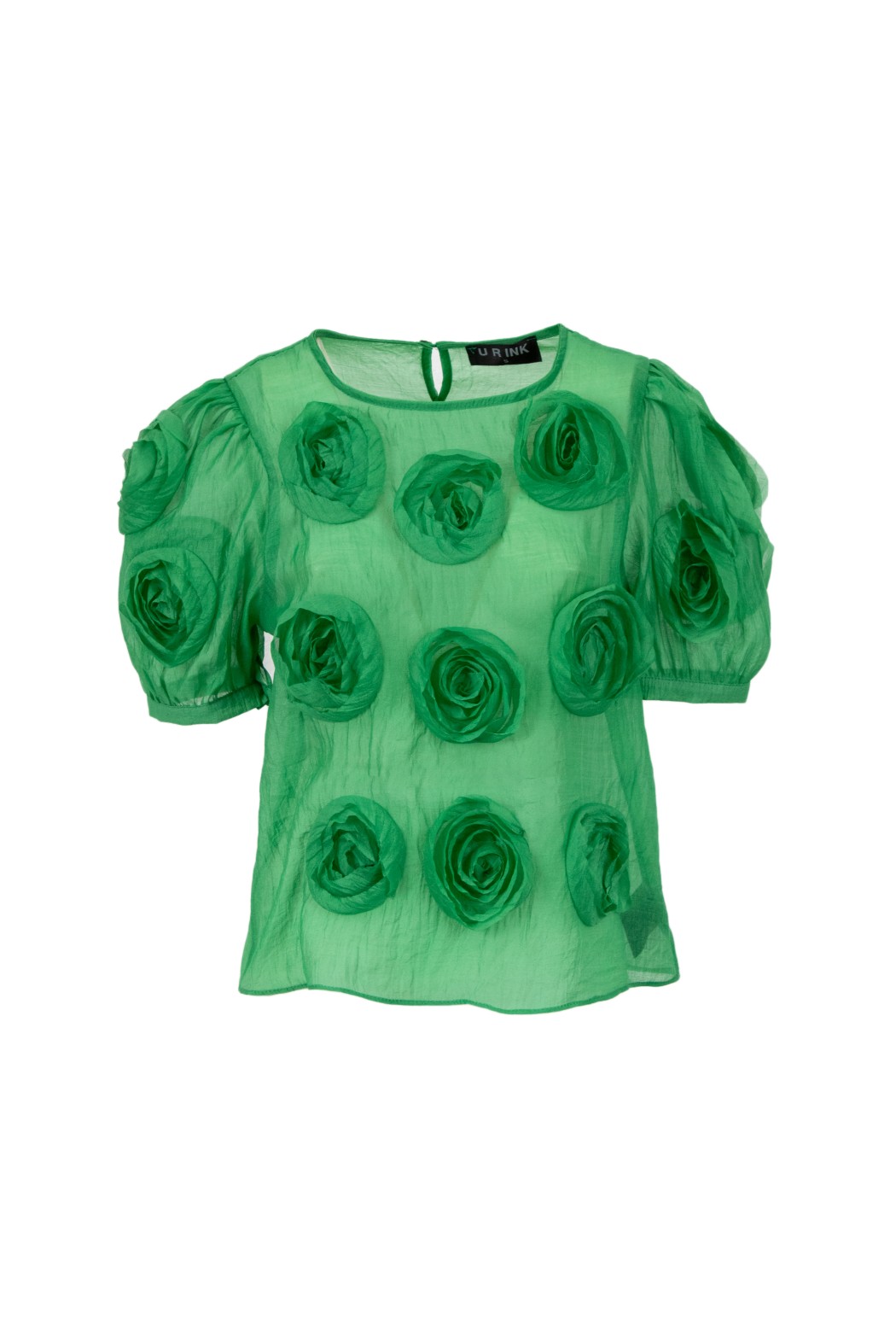 Blusa in tessuto semitrasparente, scollo tondo e fiori in tessuto applicati.