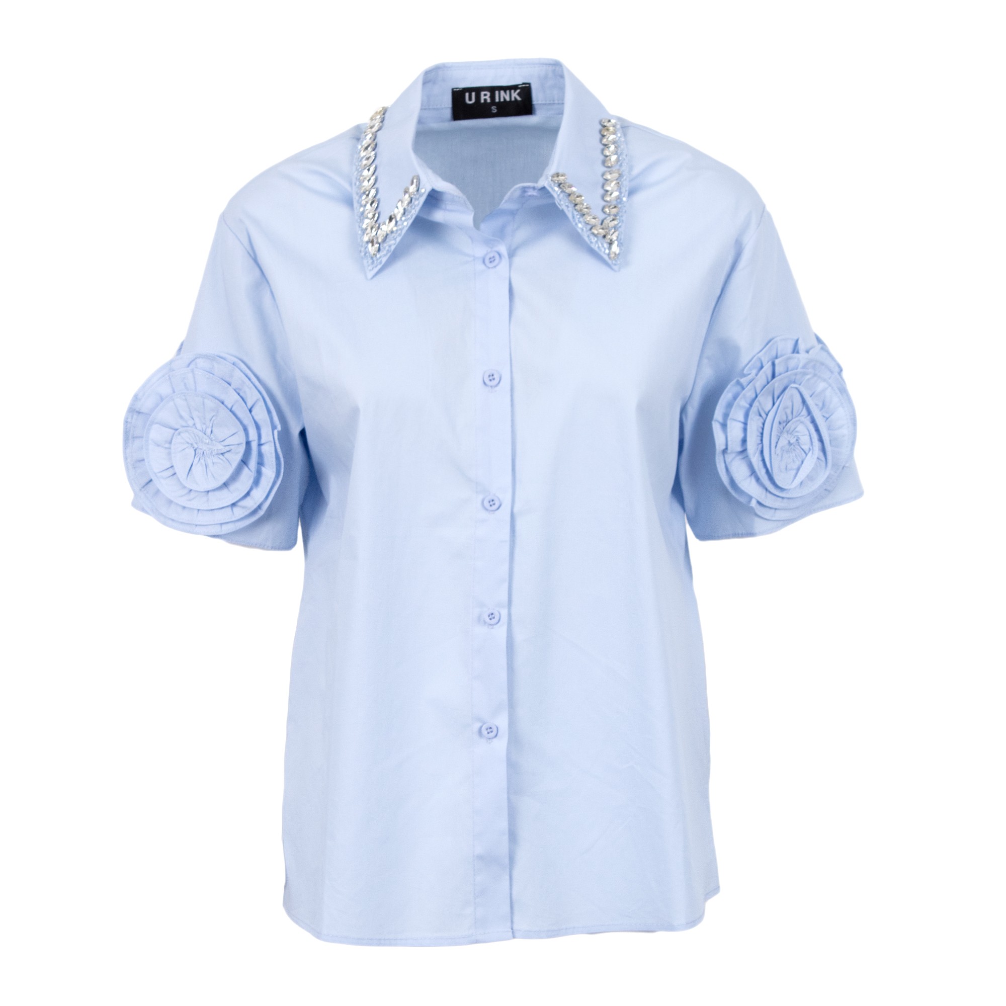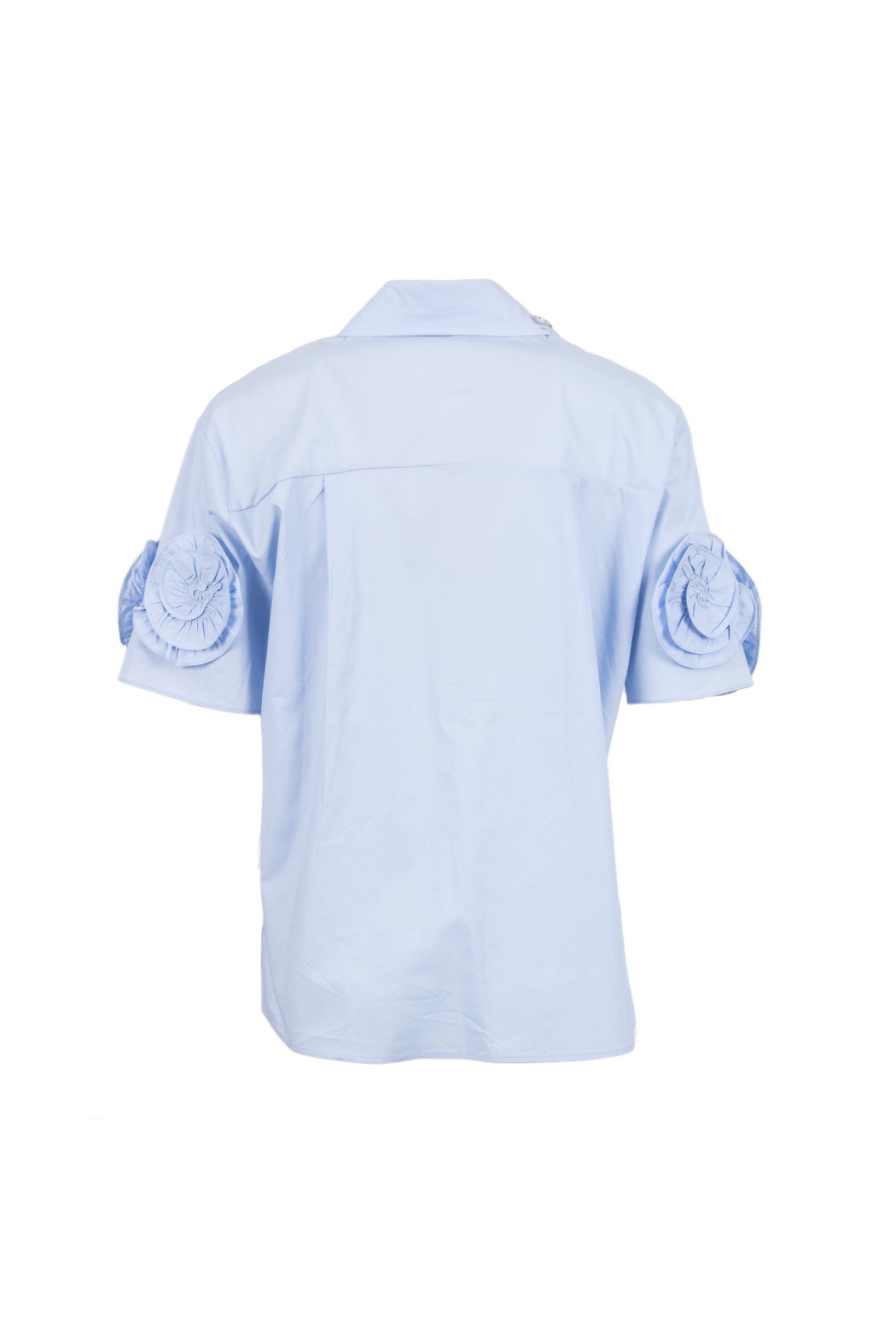 Camicia collo classico con dettagli gioiello, fiori in tessuto applicati sulle maniche, abbottonata sul fronte.