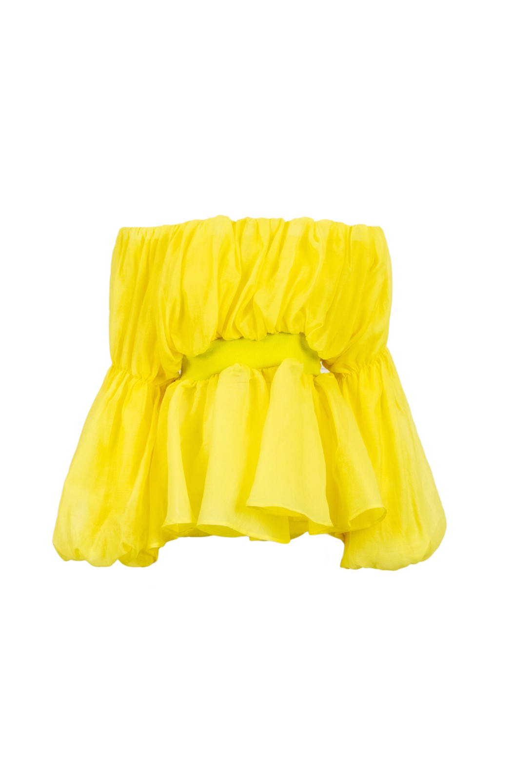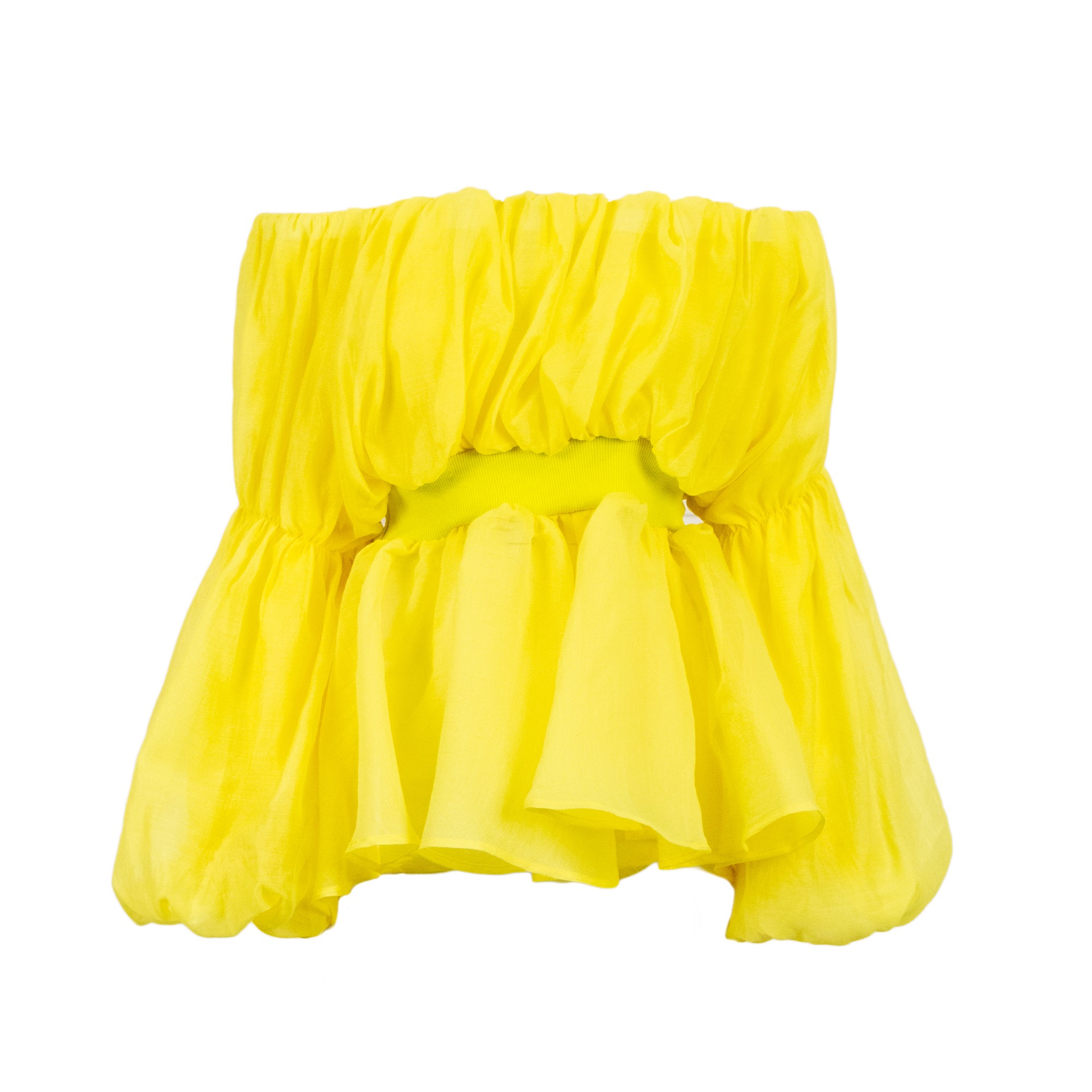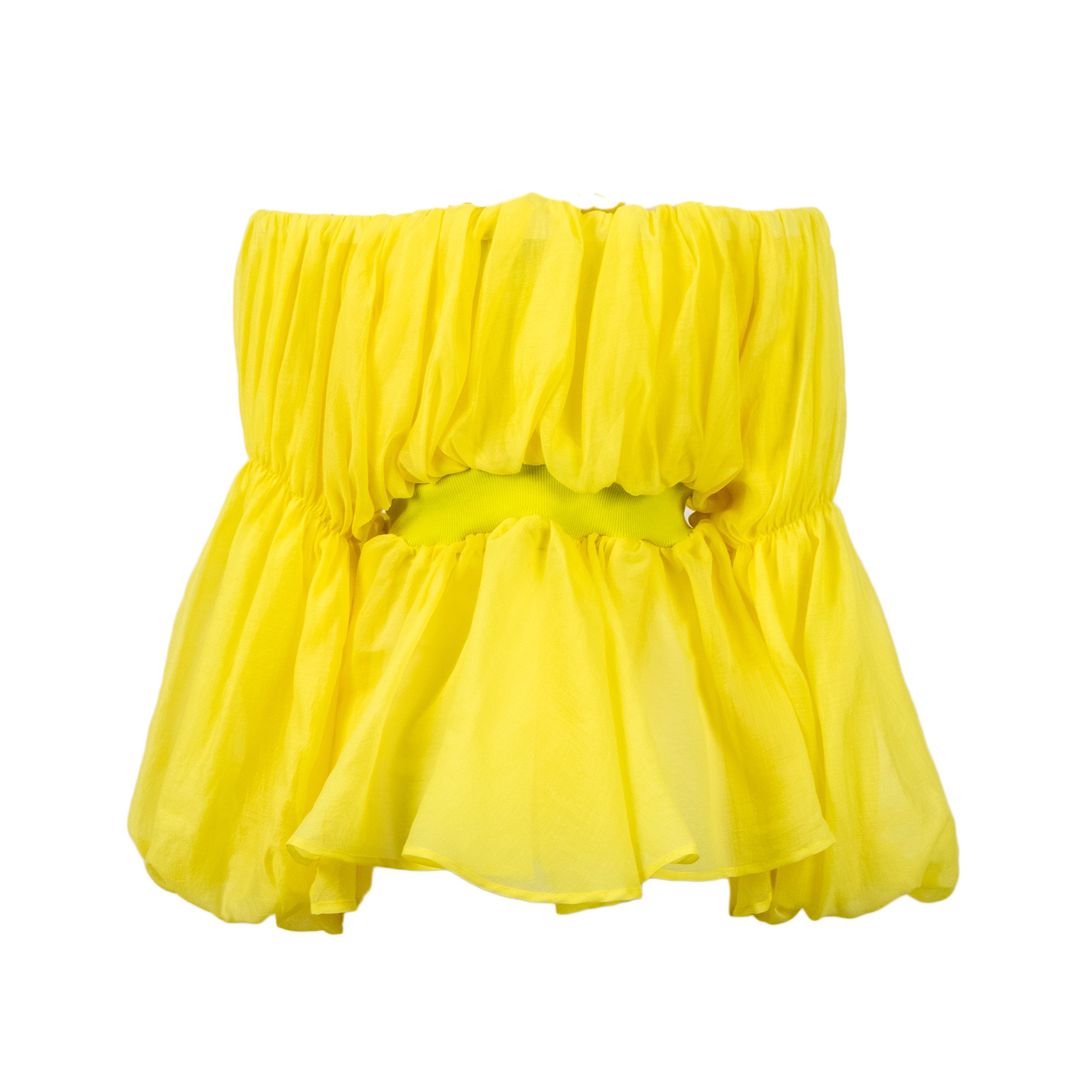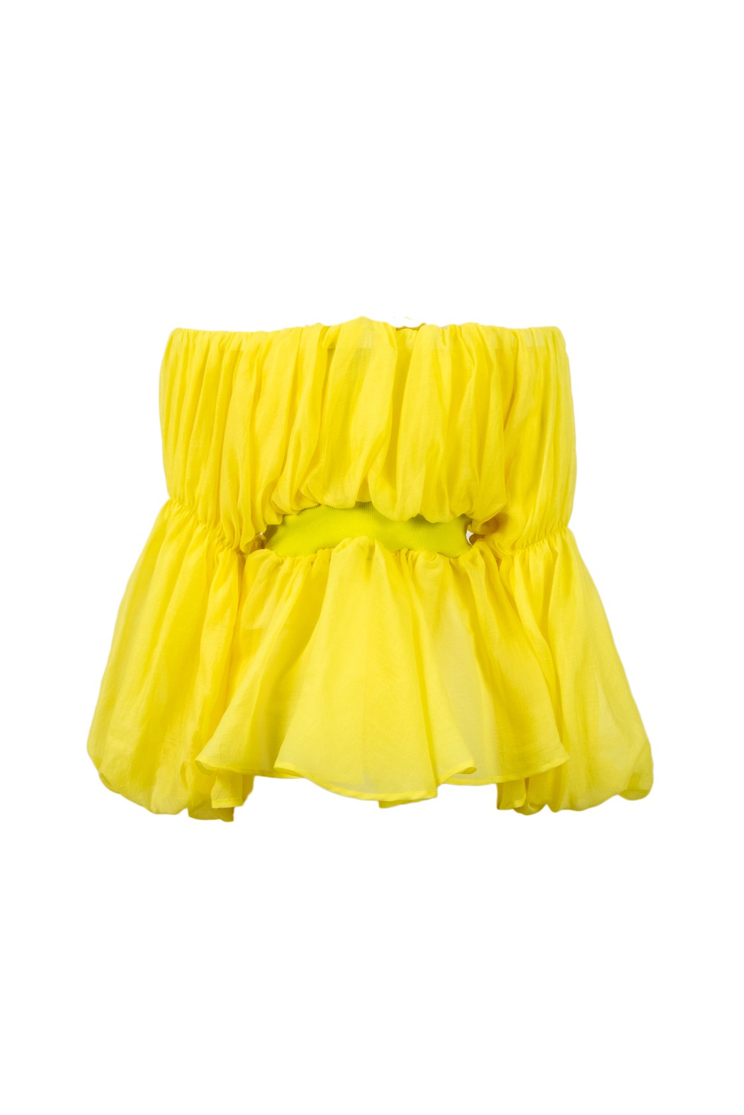 Blusa ampia tessuto drappeggiato, scollo dritto, maniche palloncino stretta in vita.
