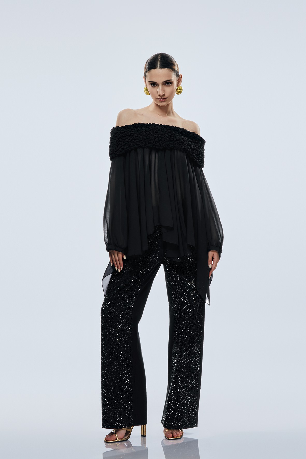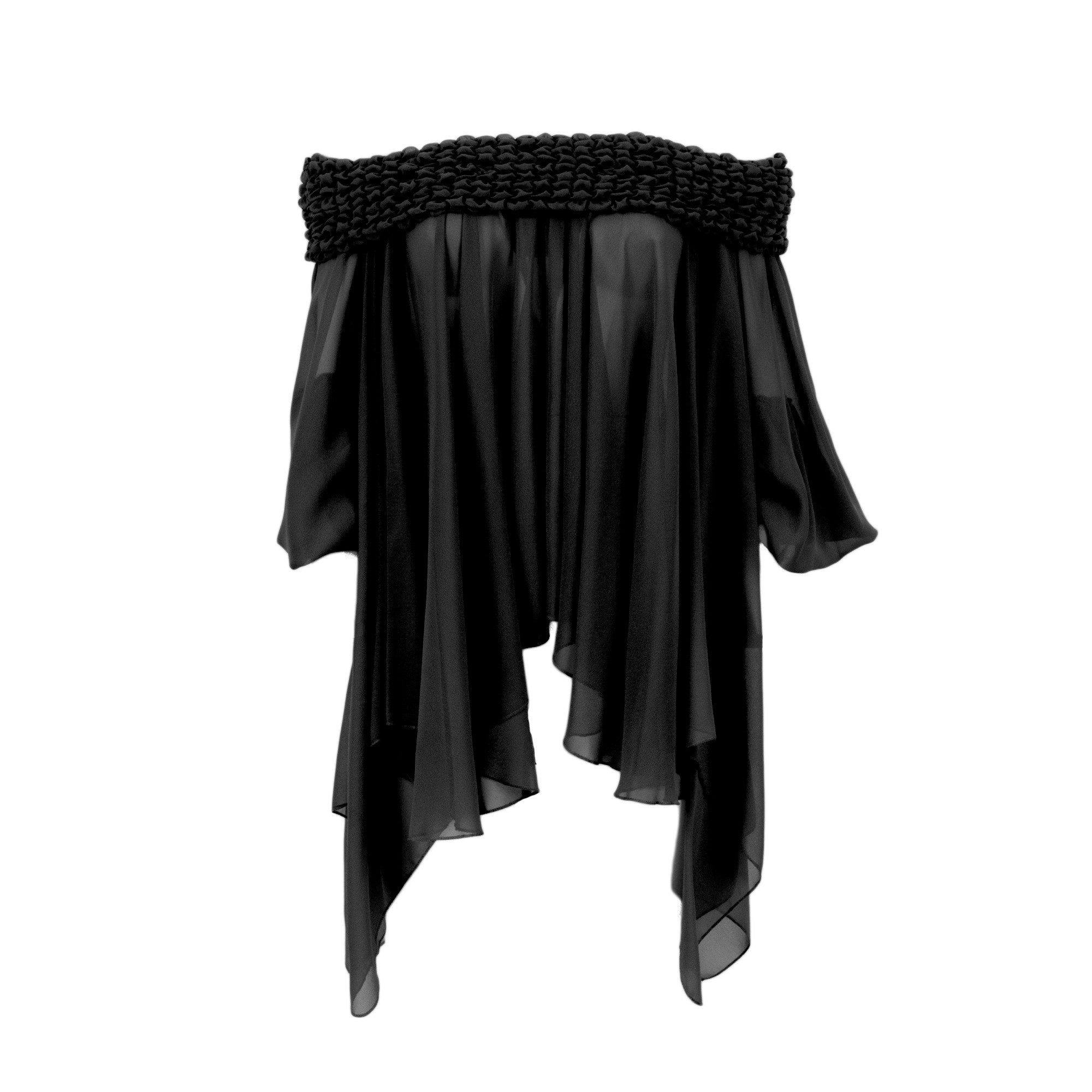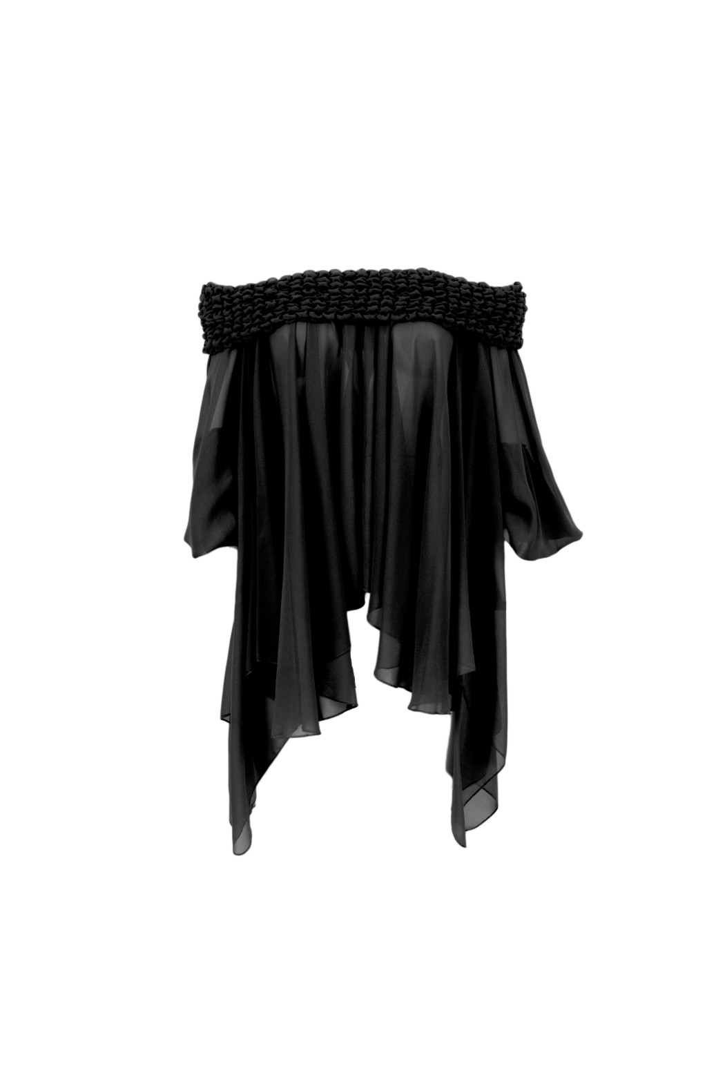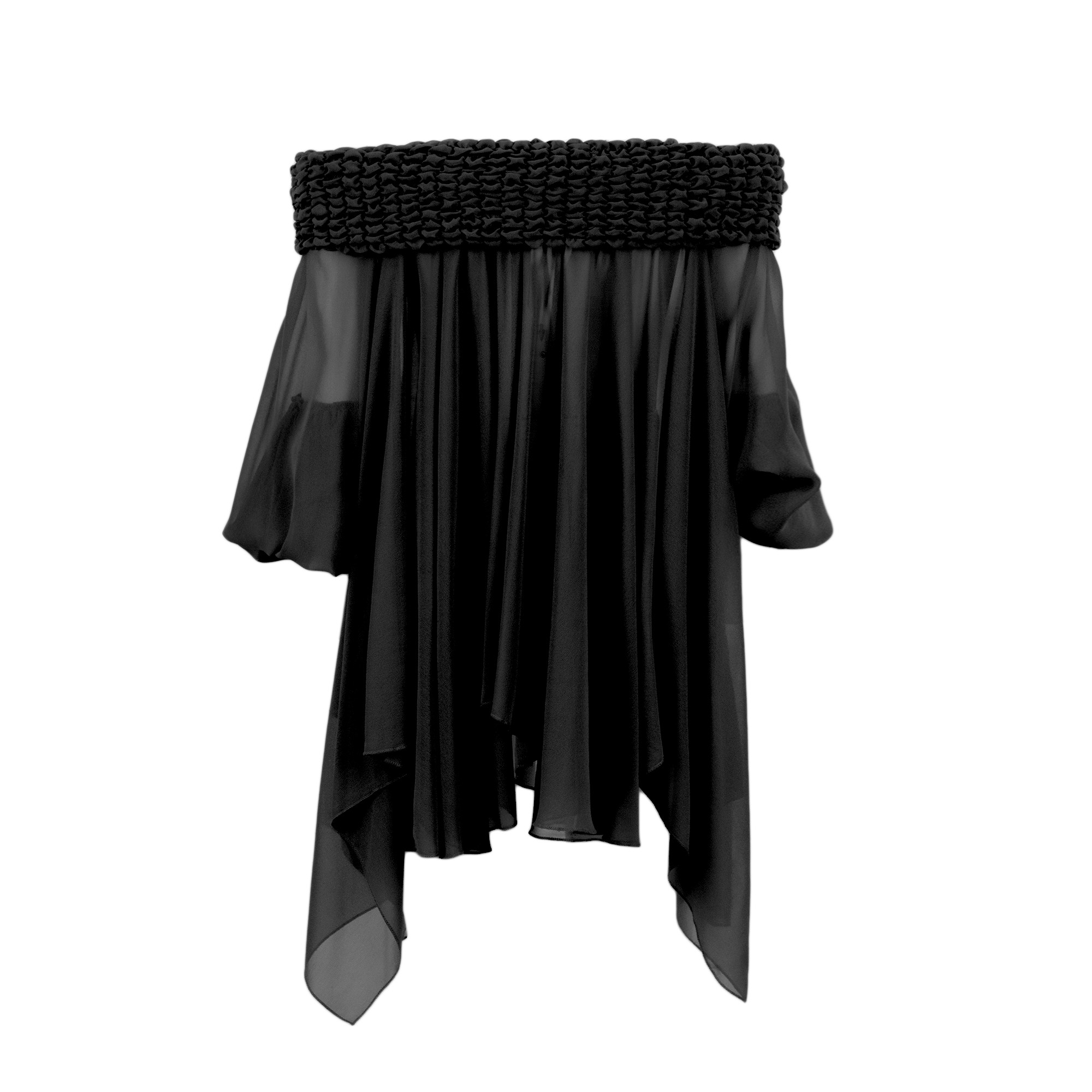 Blusa scollo dritto con rouches, bordo asimmetrico.