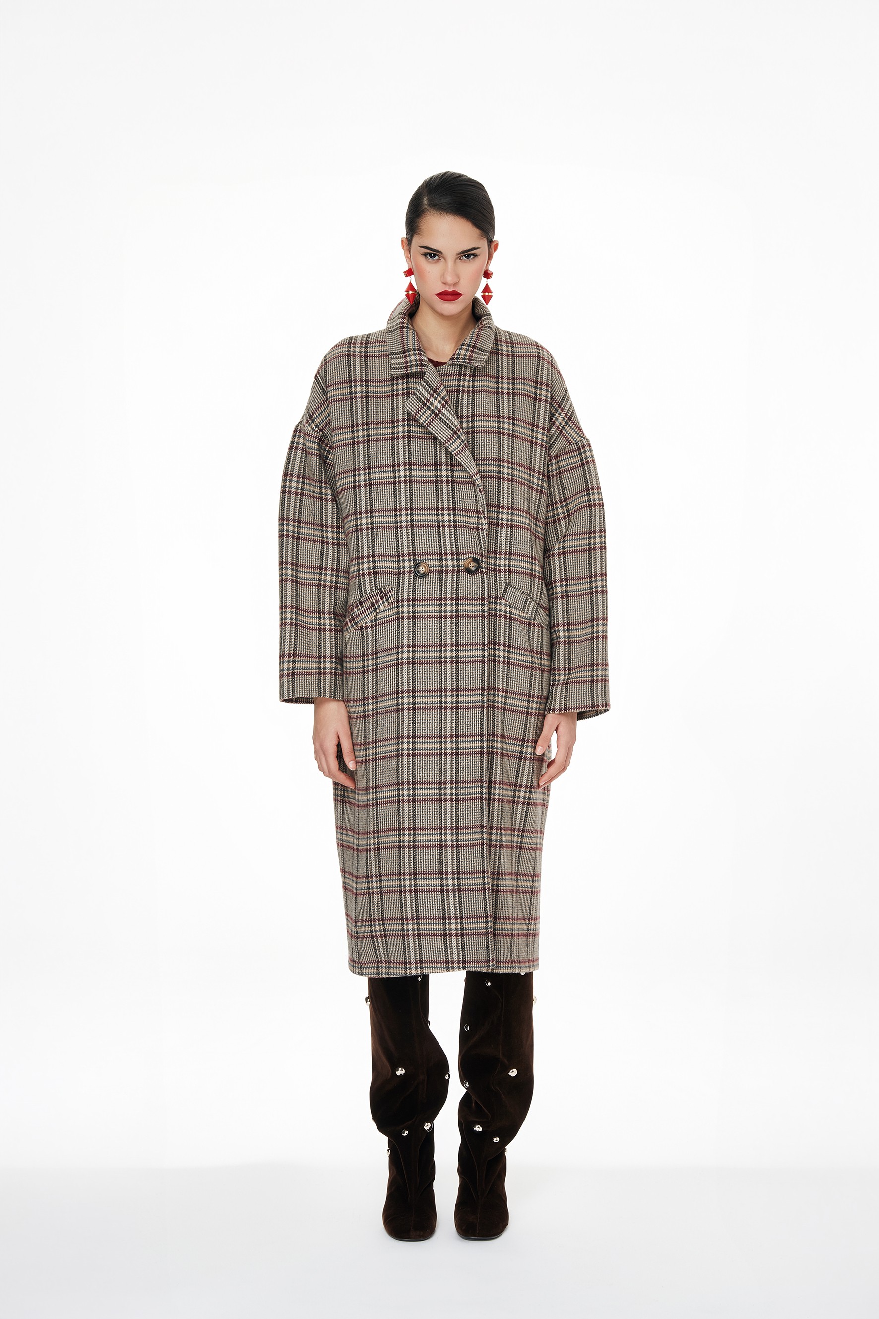 Cappotto monopetto a quadri con vestibilità oversize. Presenta collo a revers, maniche a giro basso, tasche frontali e chiusura con bottoni.