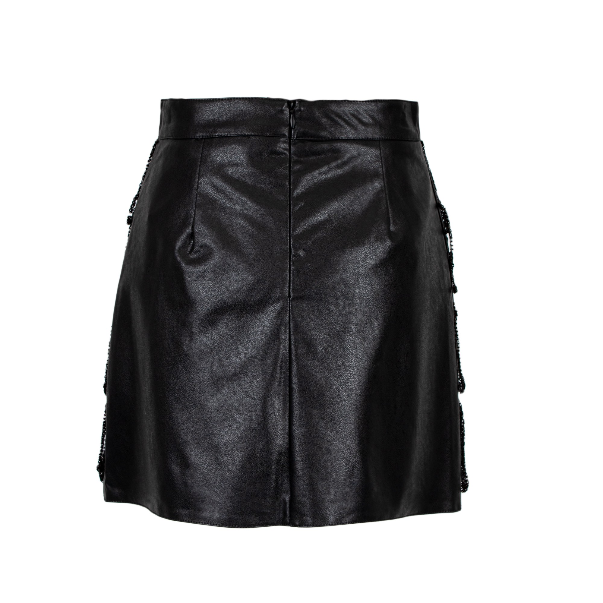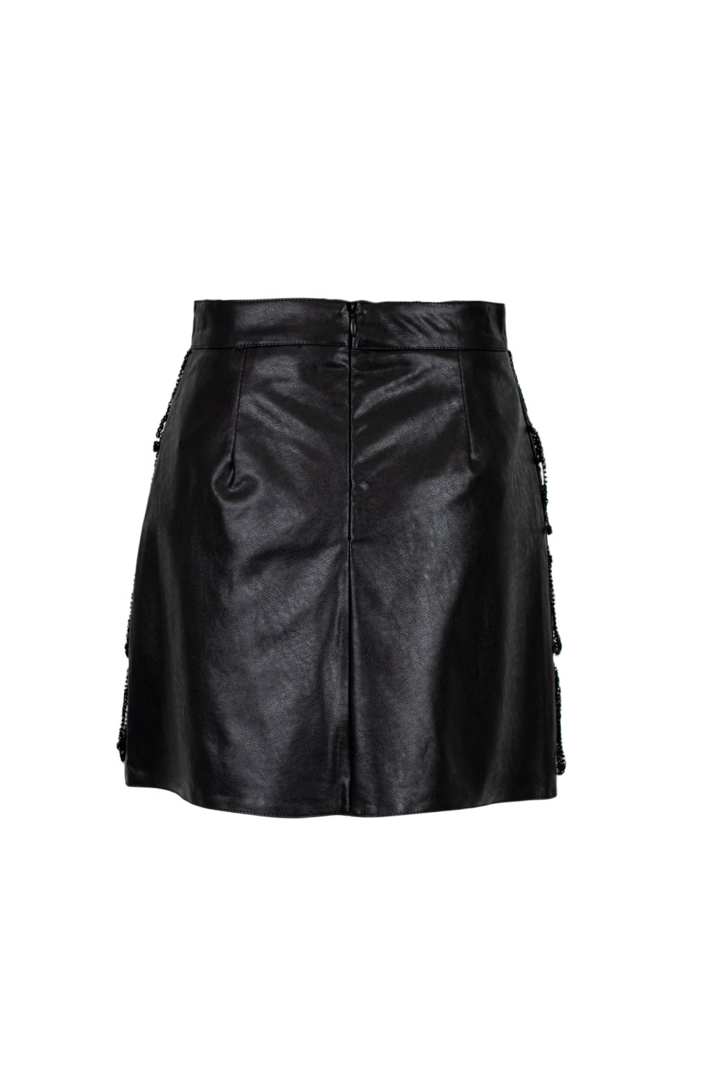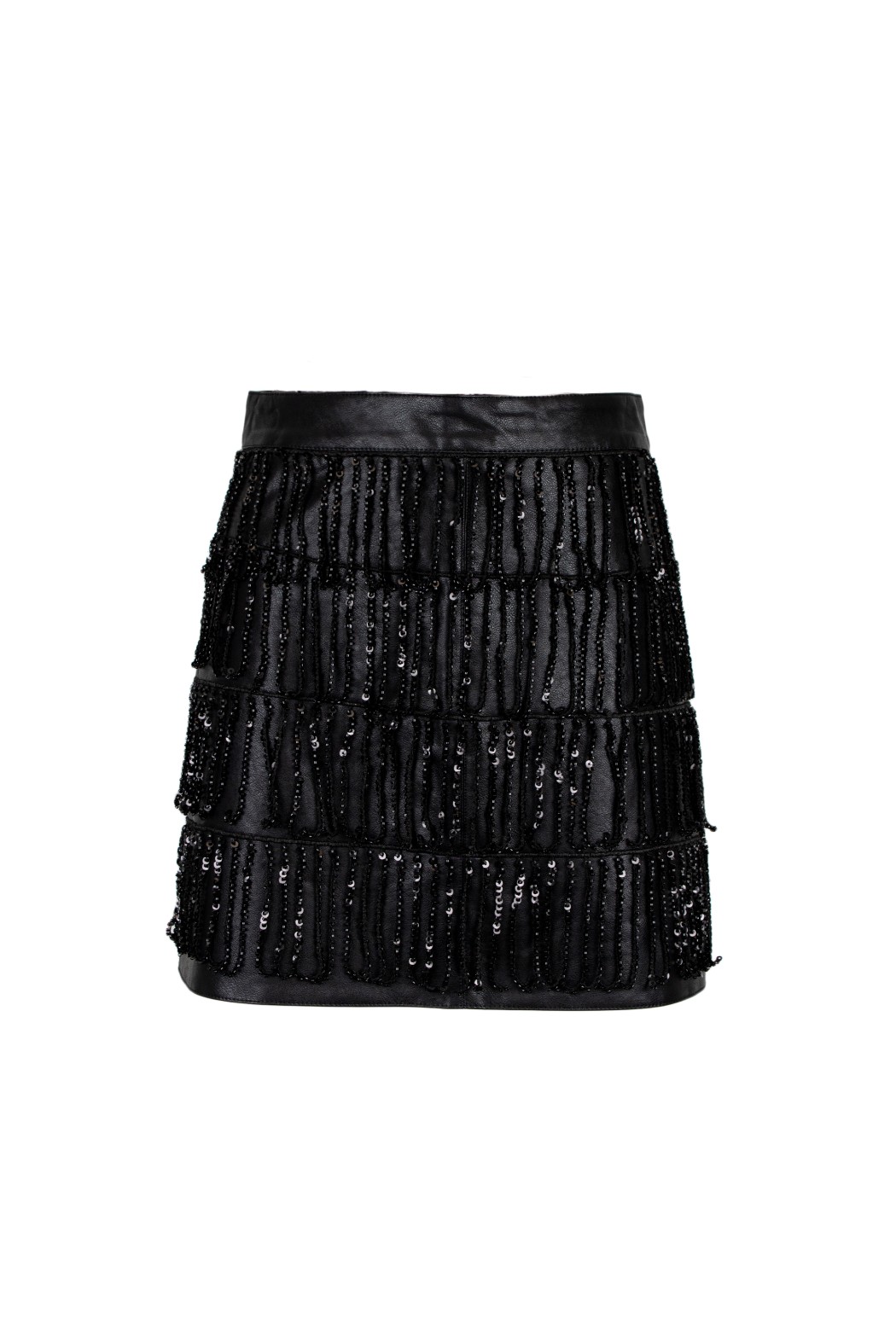 Minigonna in ecopelle con vita alta. Presenta applicazioni di frange a pailletes e perline su più livelli, creando un effetto a balze.