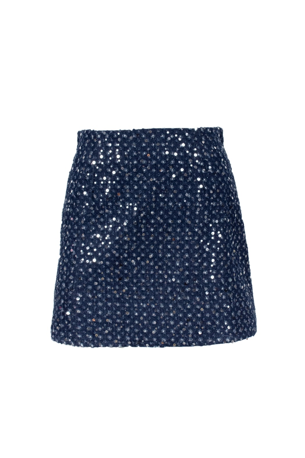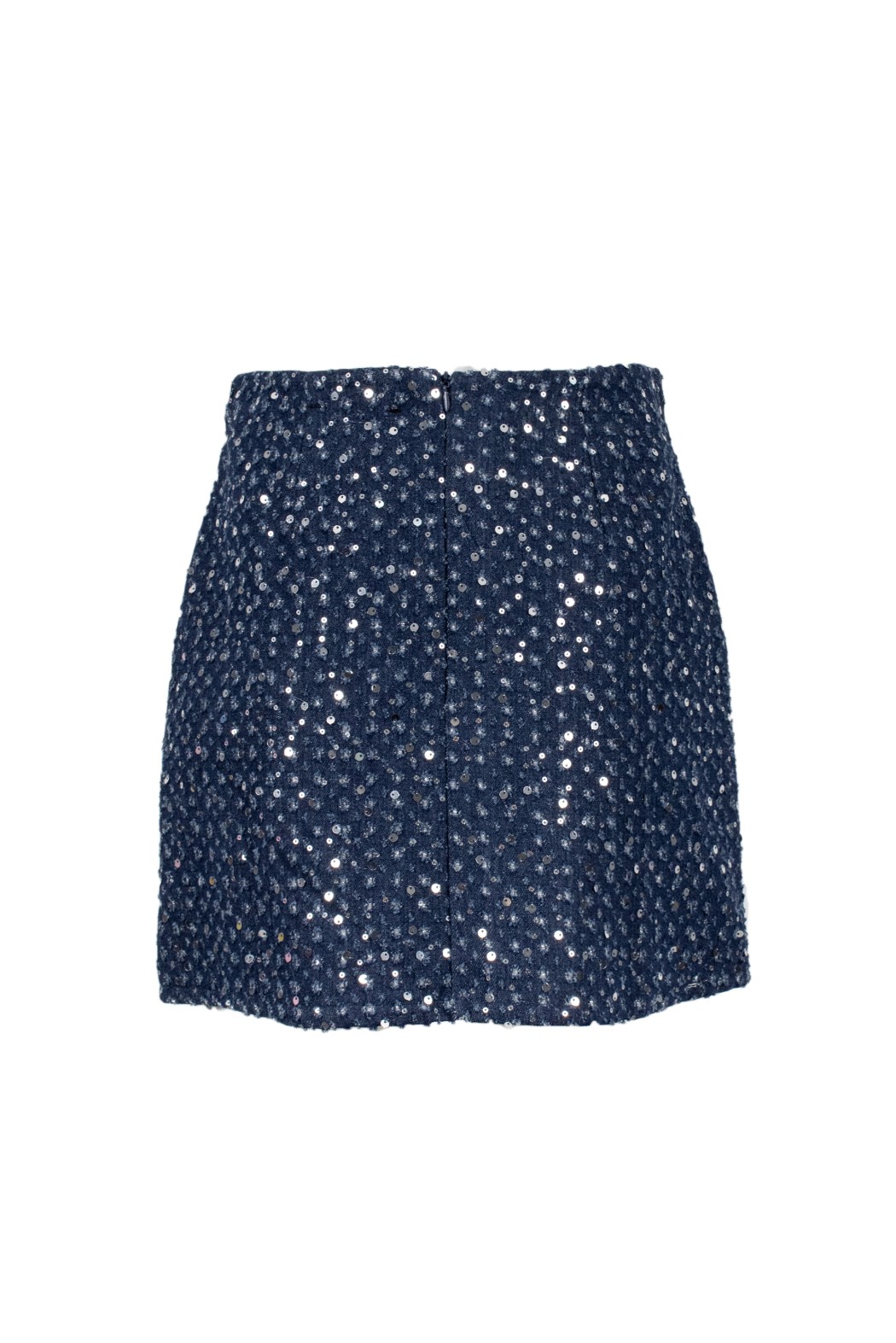 Gonna mini denim, dettagli in paillettes e piccole sfrangiature.