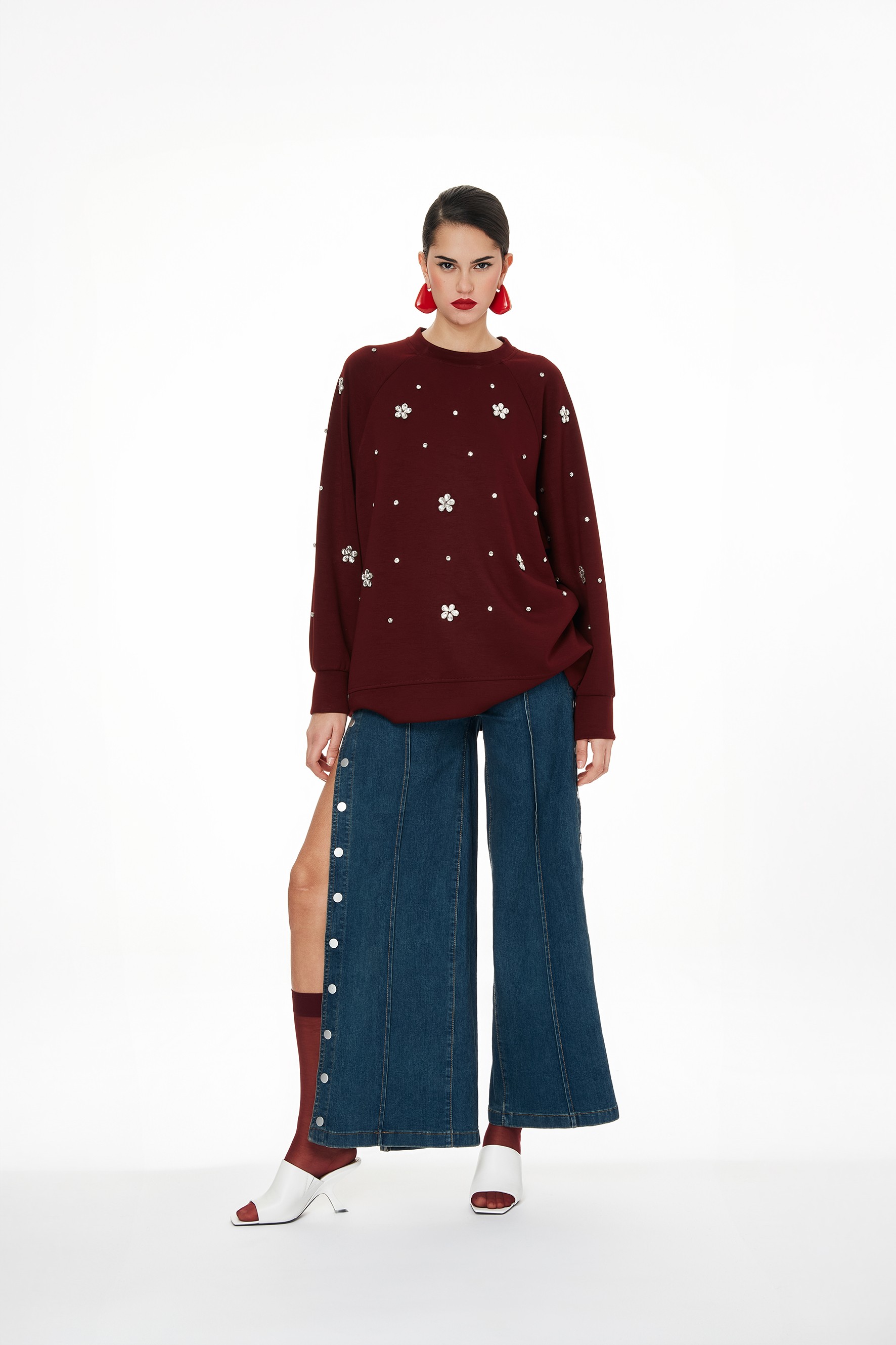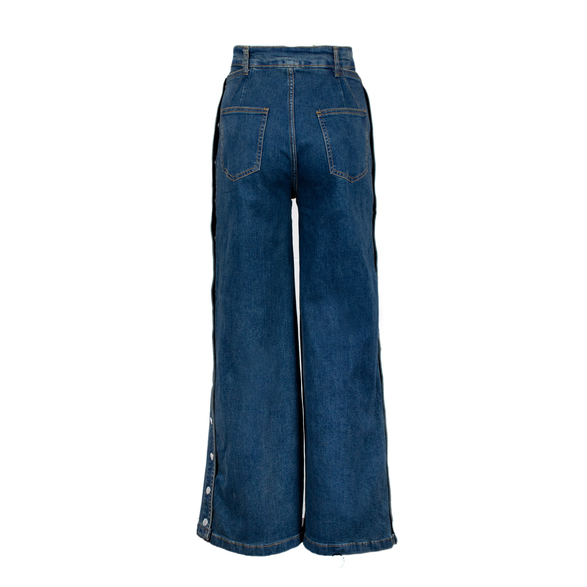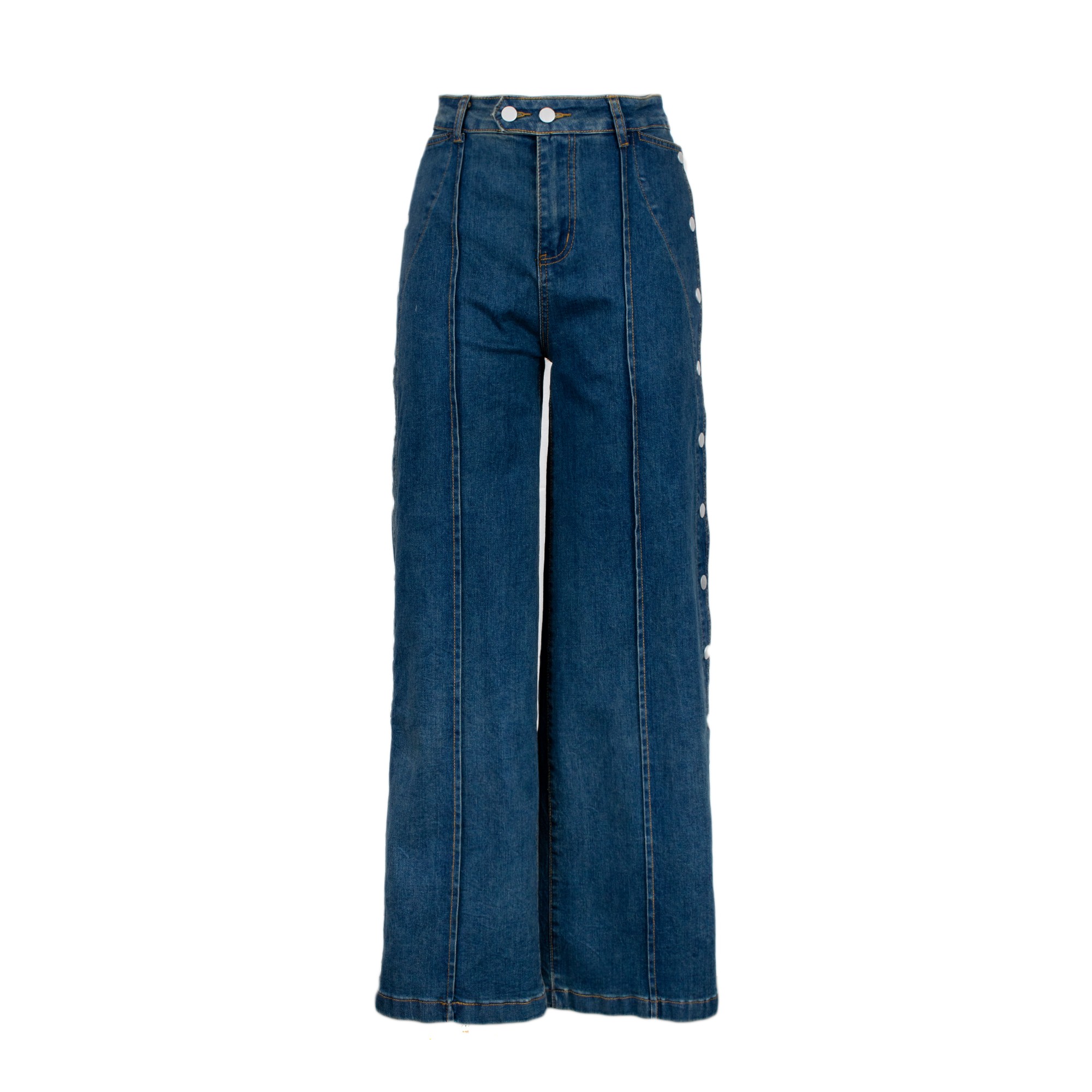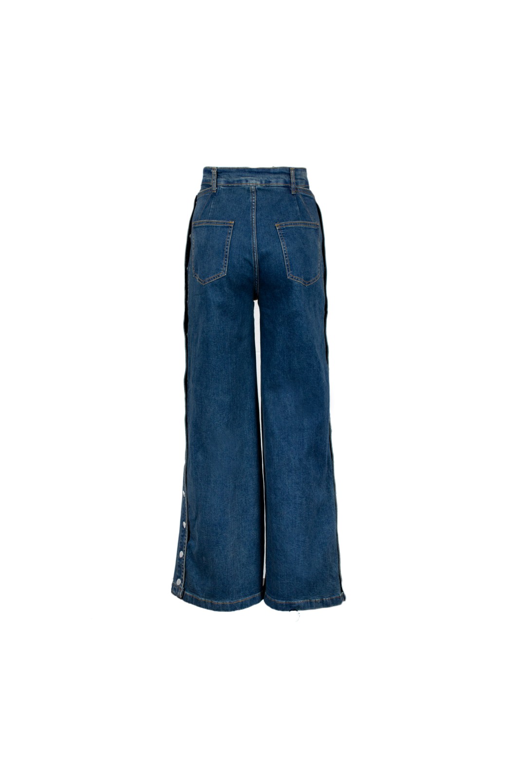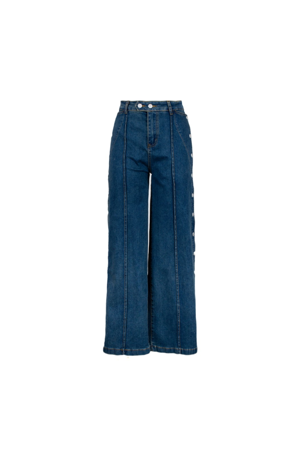 Jeans a vita alta e gamba larga, con cuciture frontali a vista. Il capo presenta bottoni laterali in metallo a contrasto e tasche frontali a filo.