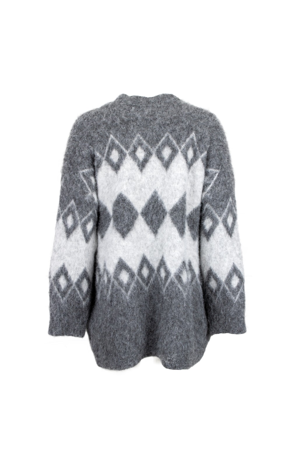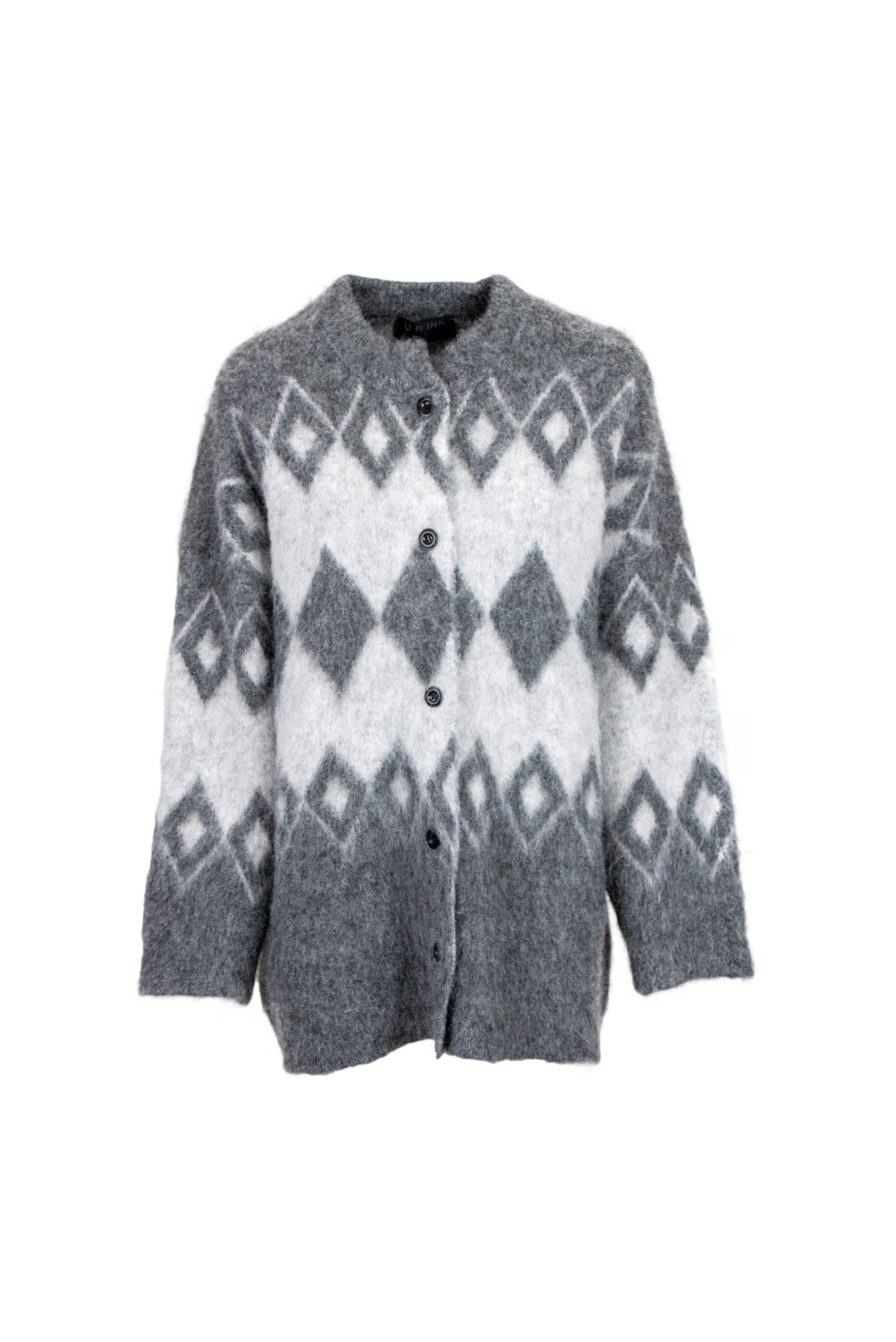Cardigan in mohair con maniche lunghe. Il capo presenta un collo a giro, una chiusura frontale con bottoni e una fantasia a rombi.