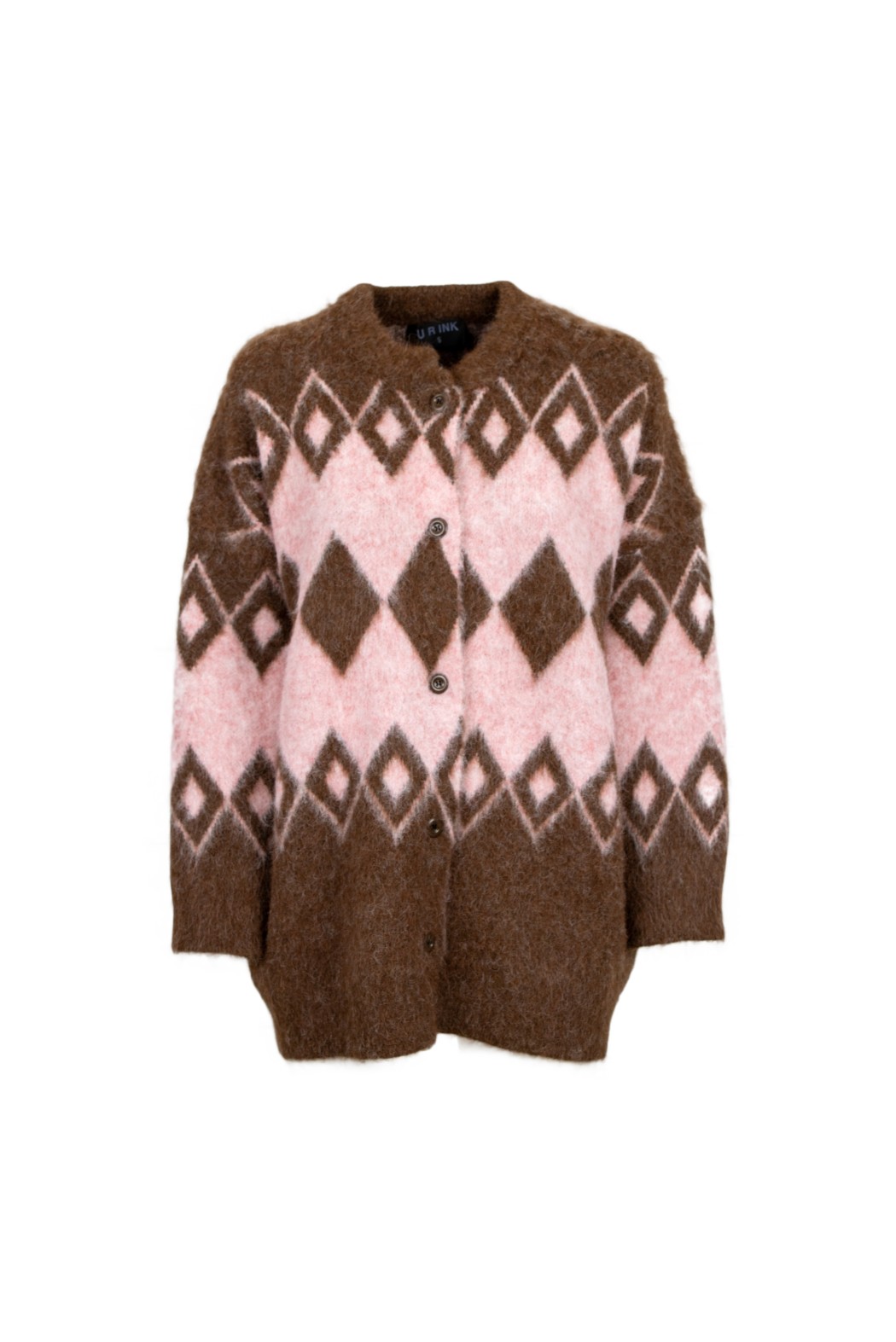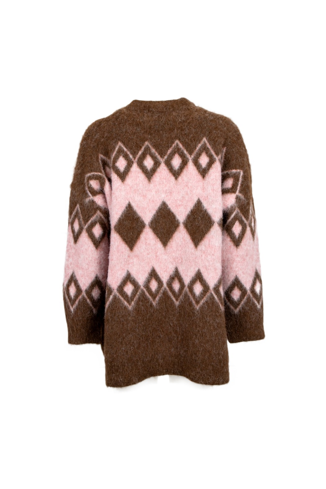 Cardigan in mohair con maniche lunghe. Il capo presenta un collo a giro, una chiusura frontale con bottoni e una fantasia a rombi.