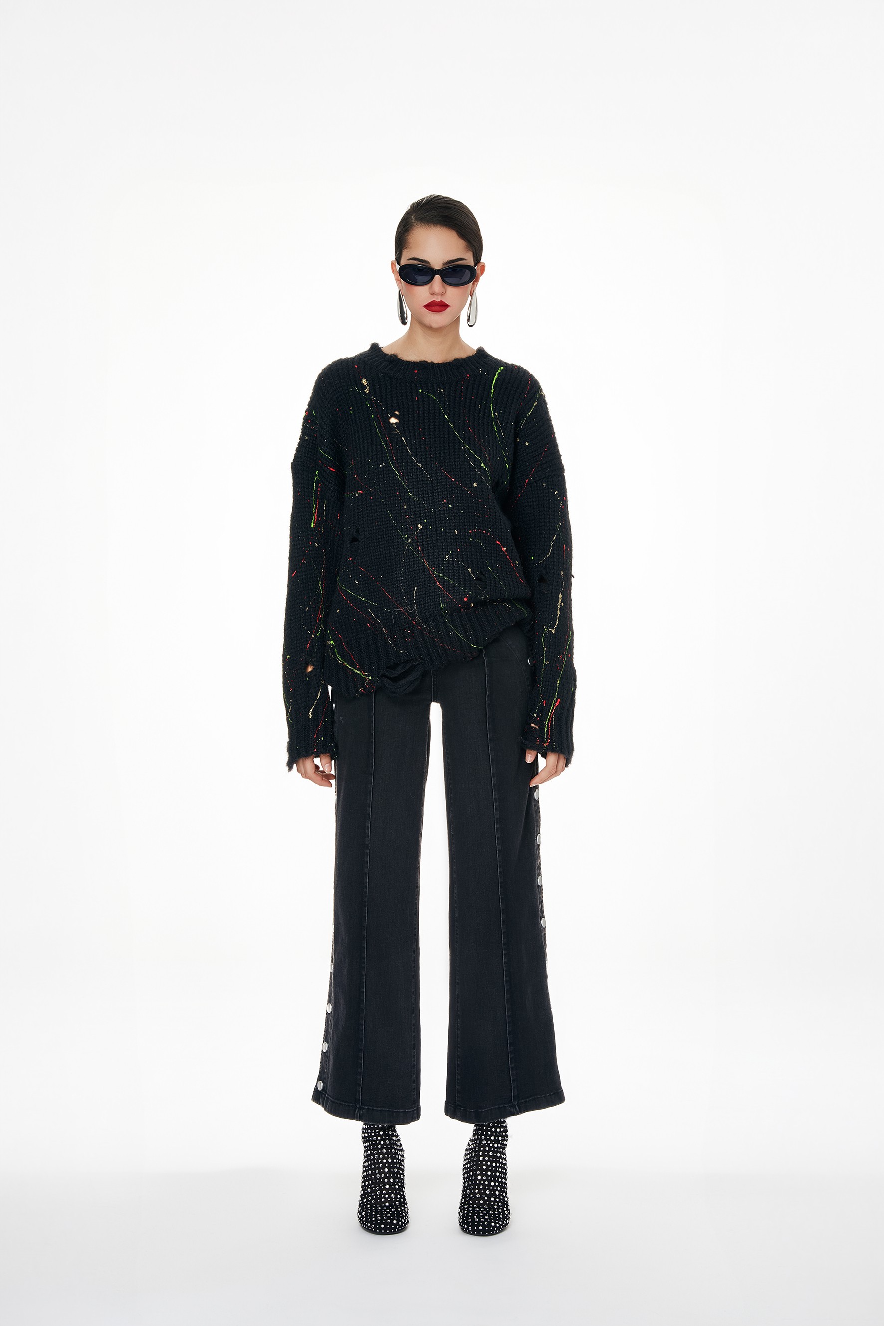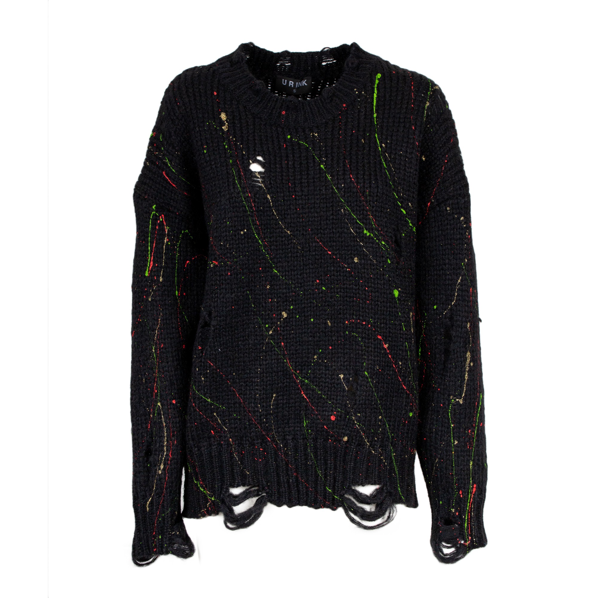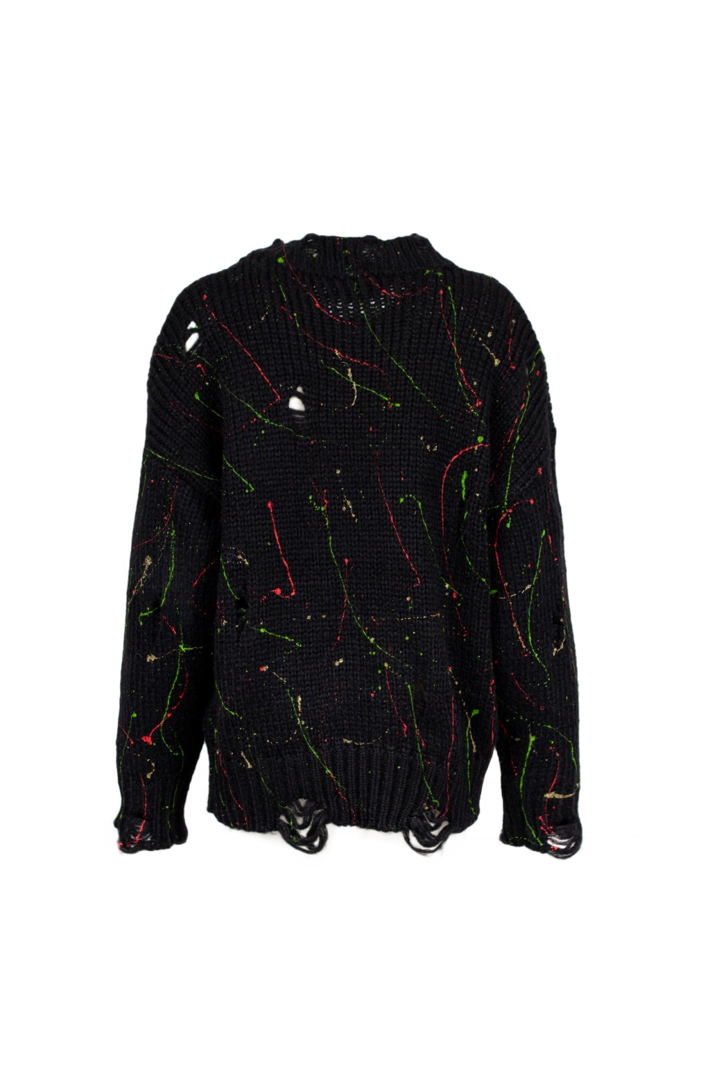 Maglione a girocollo in maglia. Presenta una lavorazione a coste, effetto strappato e decoro con schizzi di colore.