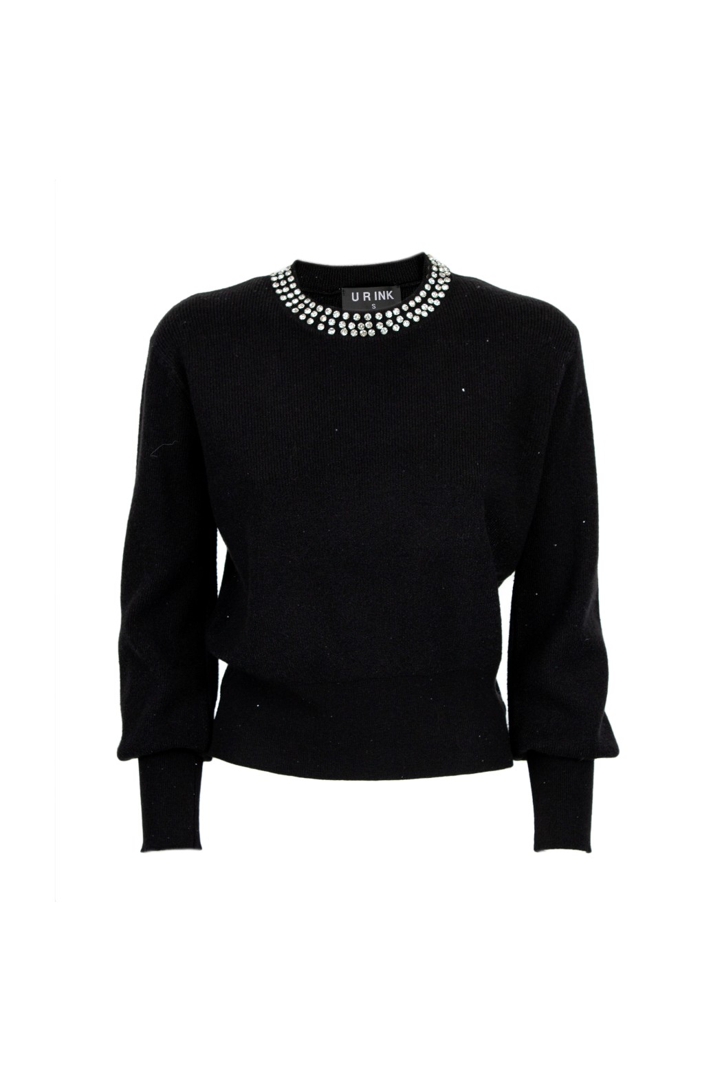 Maglione a girocollo in maglia a coste. Presenta un colletto decorato con applicazioni di strass su più file.