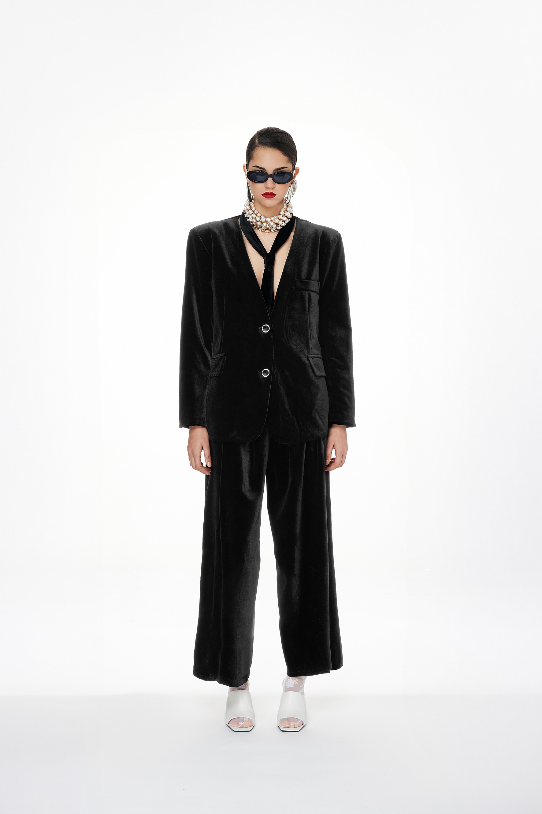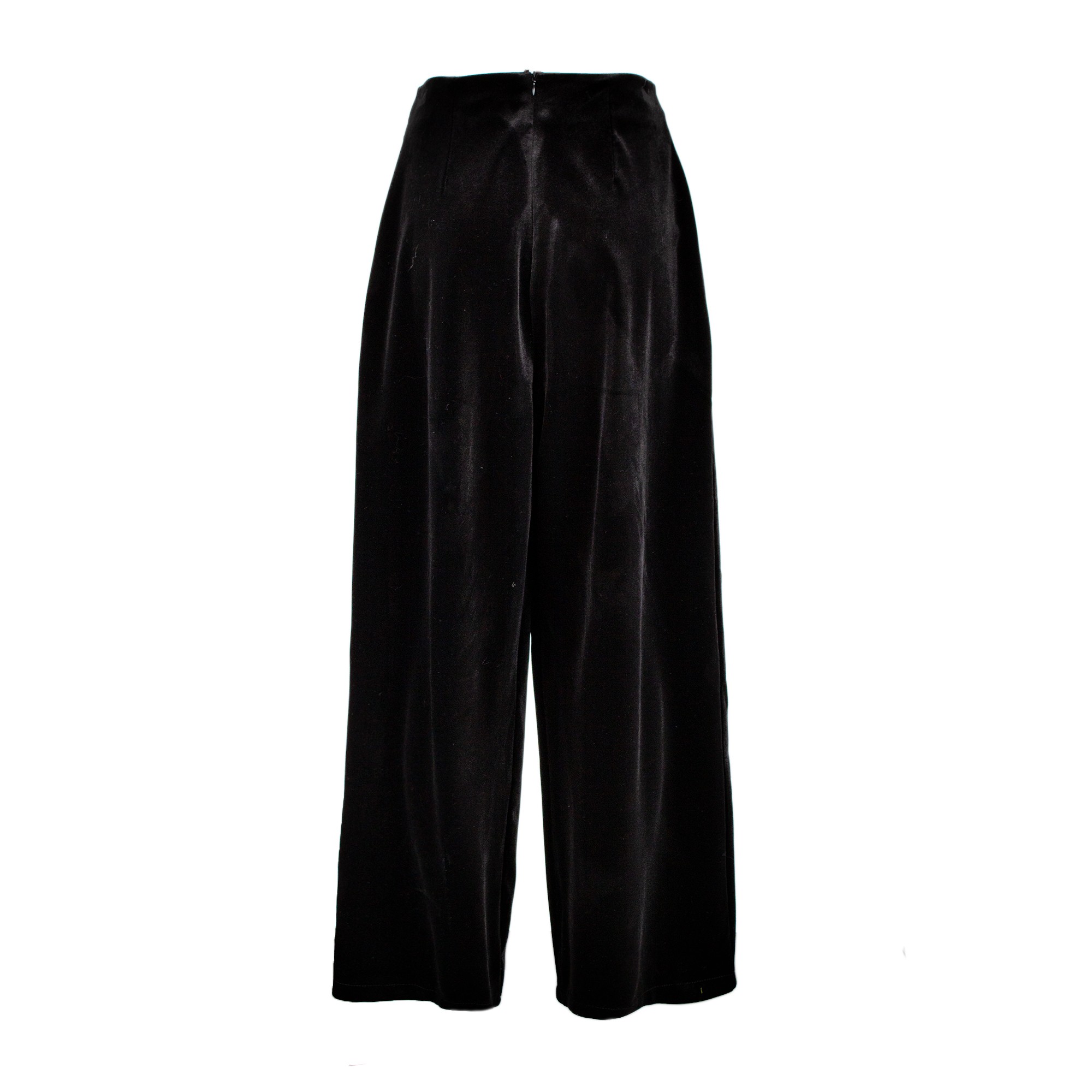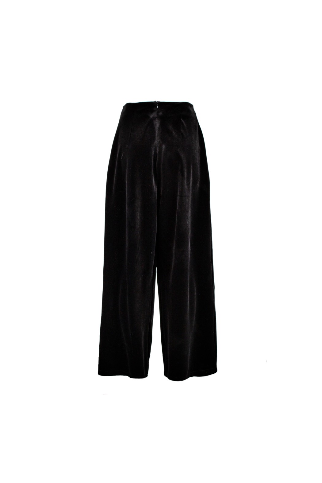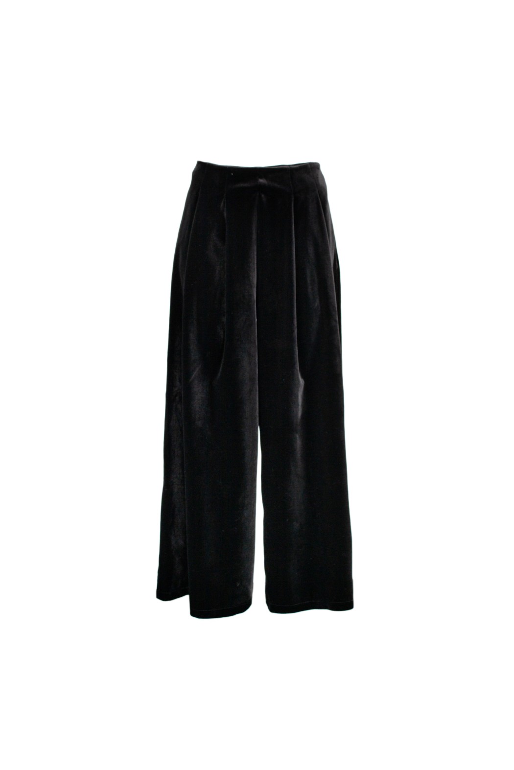 Pantalone a palazzo in velluto. Presenta vita alta, pieghe anteriori e cerniera a scomparsa sul fianco.