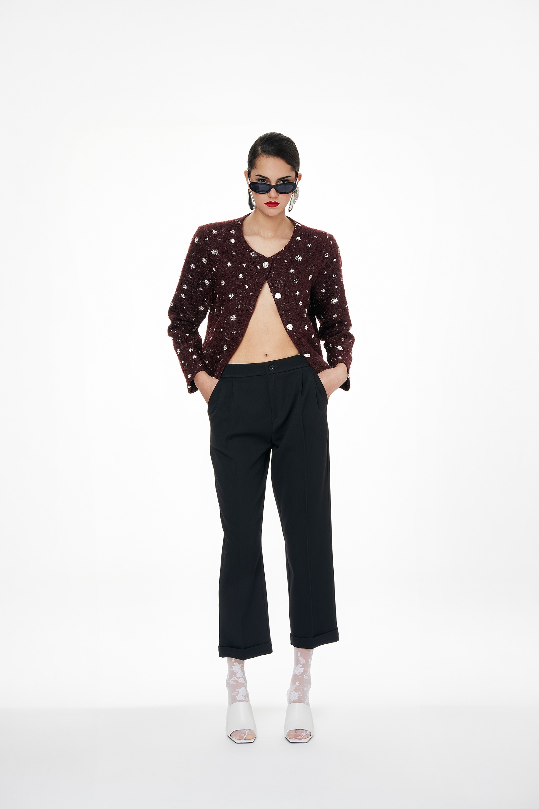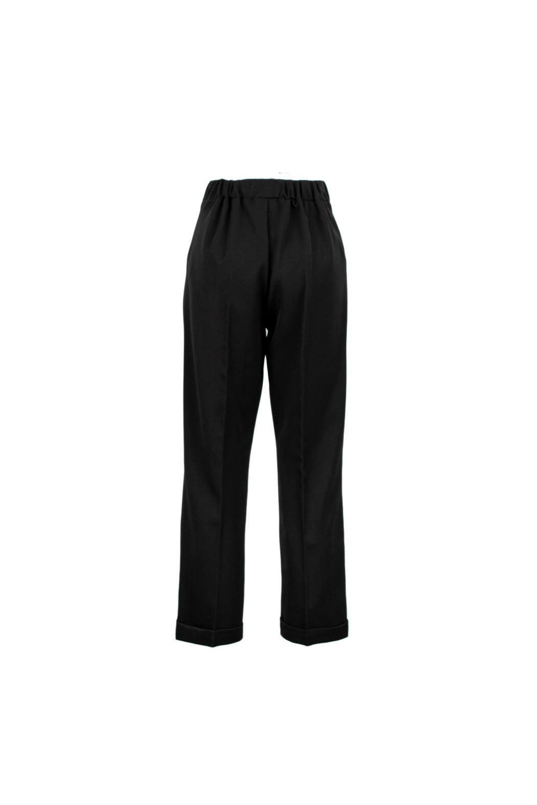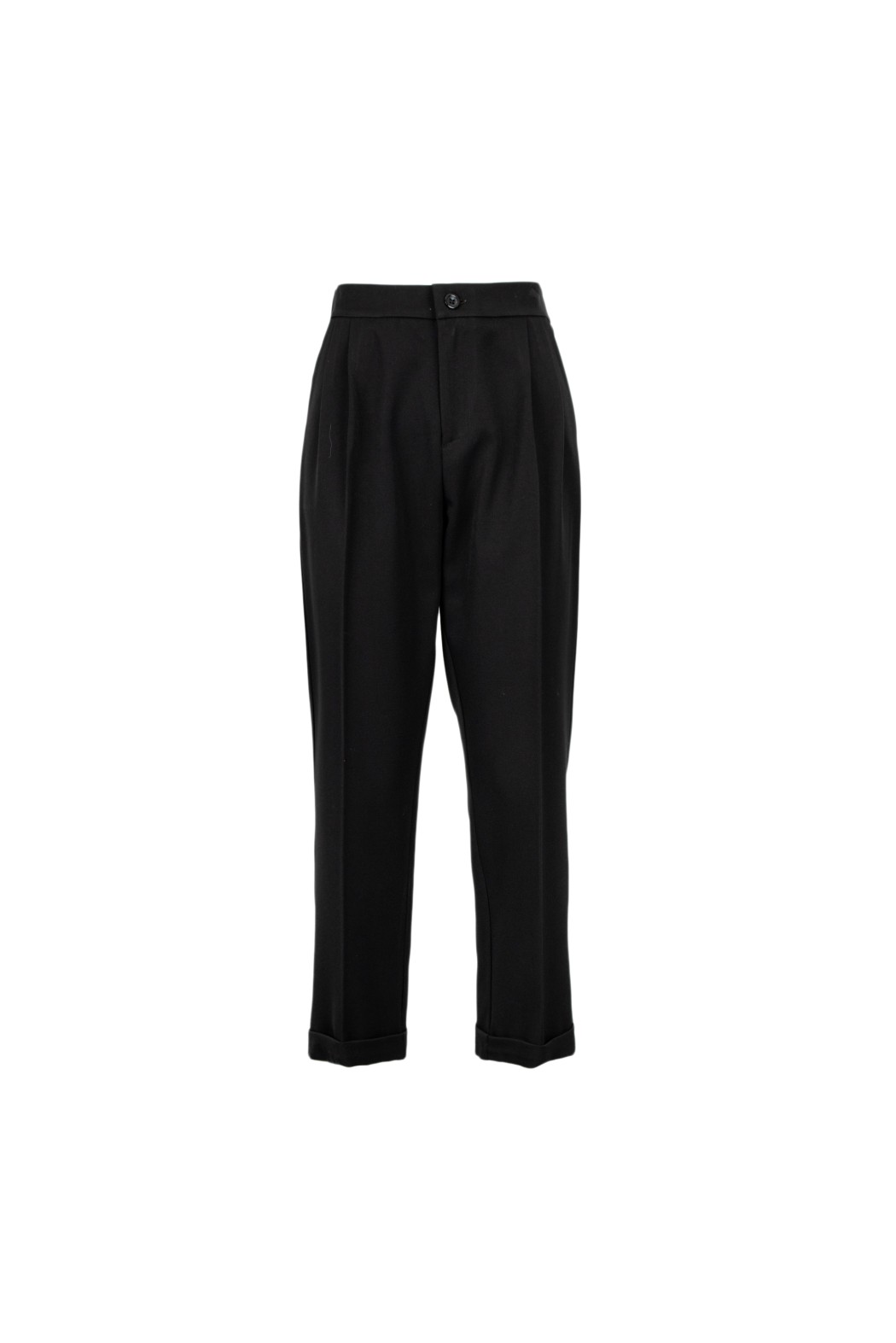 Pantalone a sigaretta in tessuto. Presenta vita alta, pieghe anteriori chiusura a scomparsa. Orlo risvoltato.