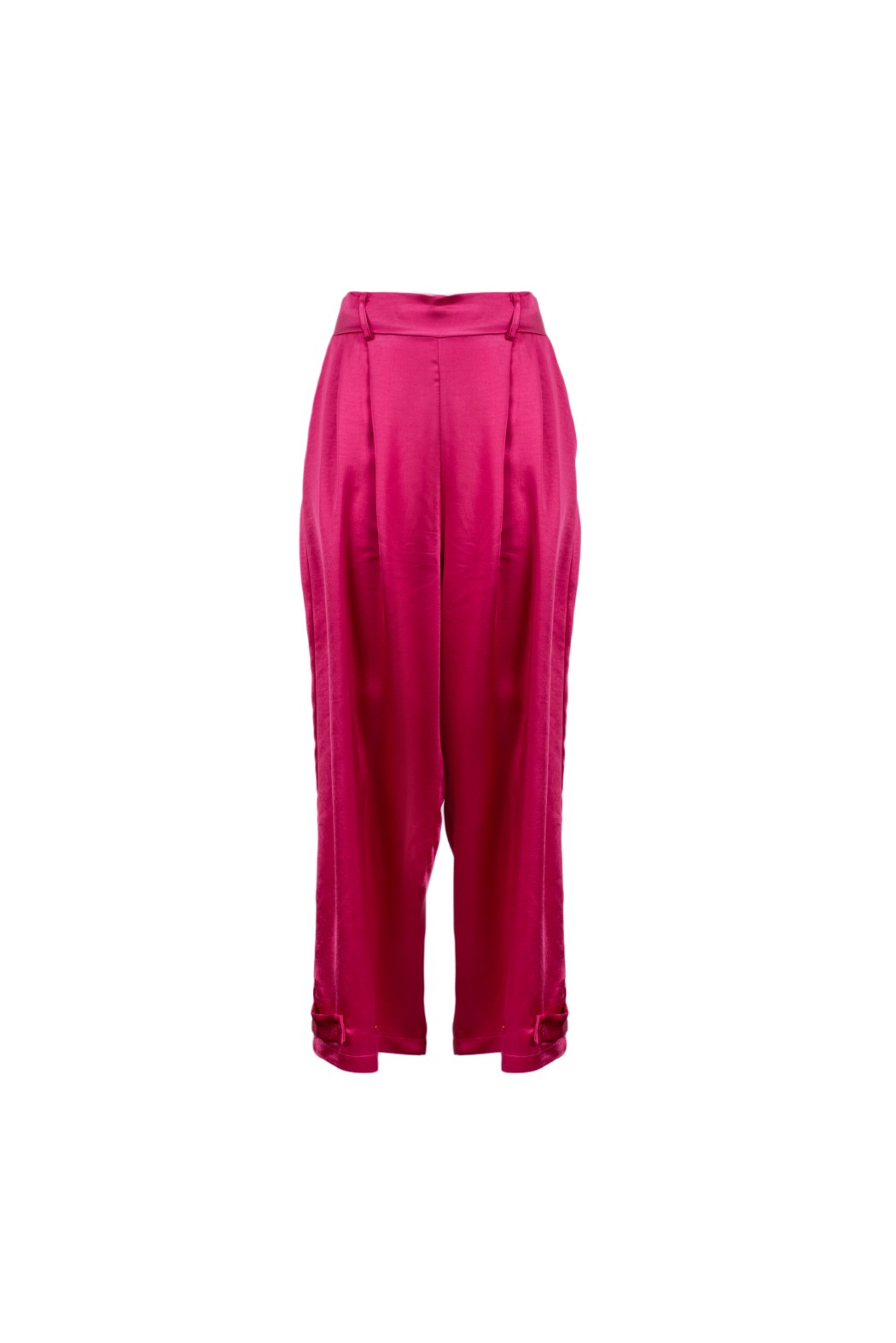 Pantalone full lenght con pinces, elastico sul retro e fibbia con bottone sulle caviglie.