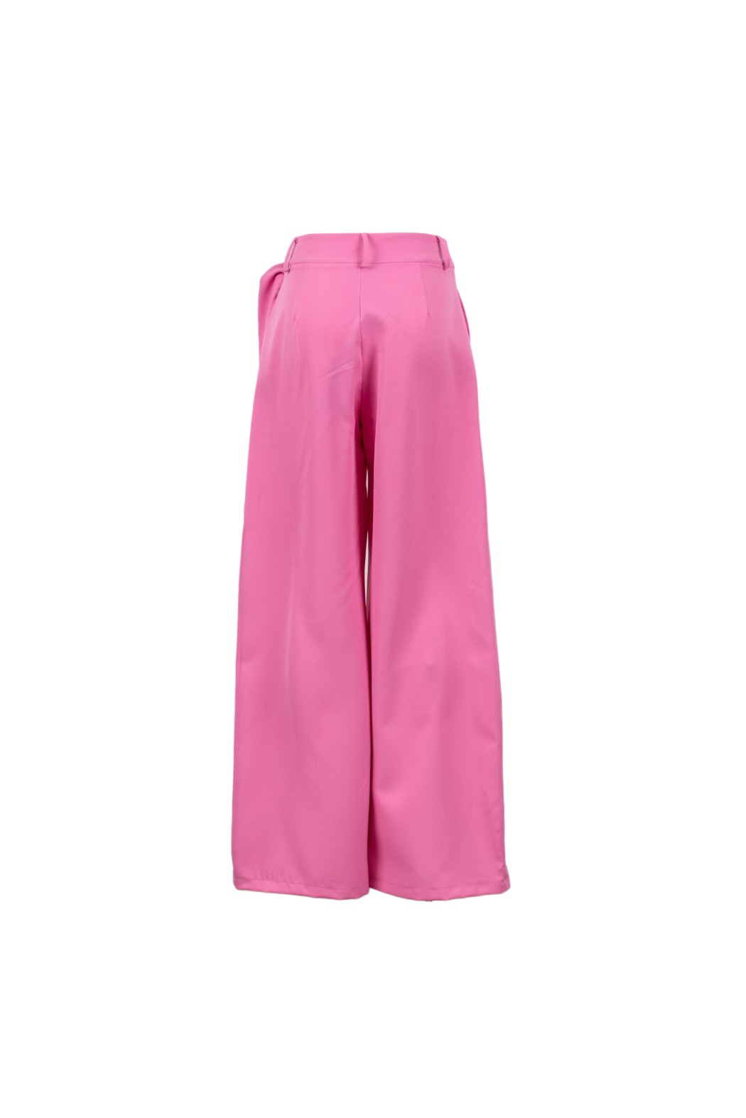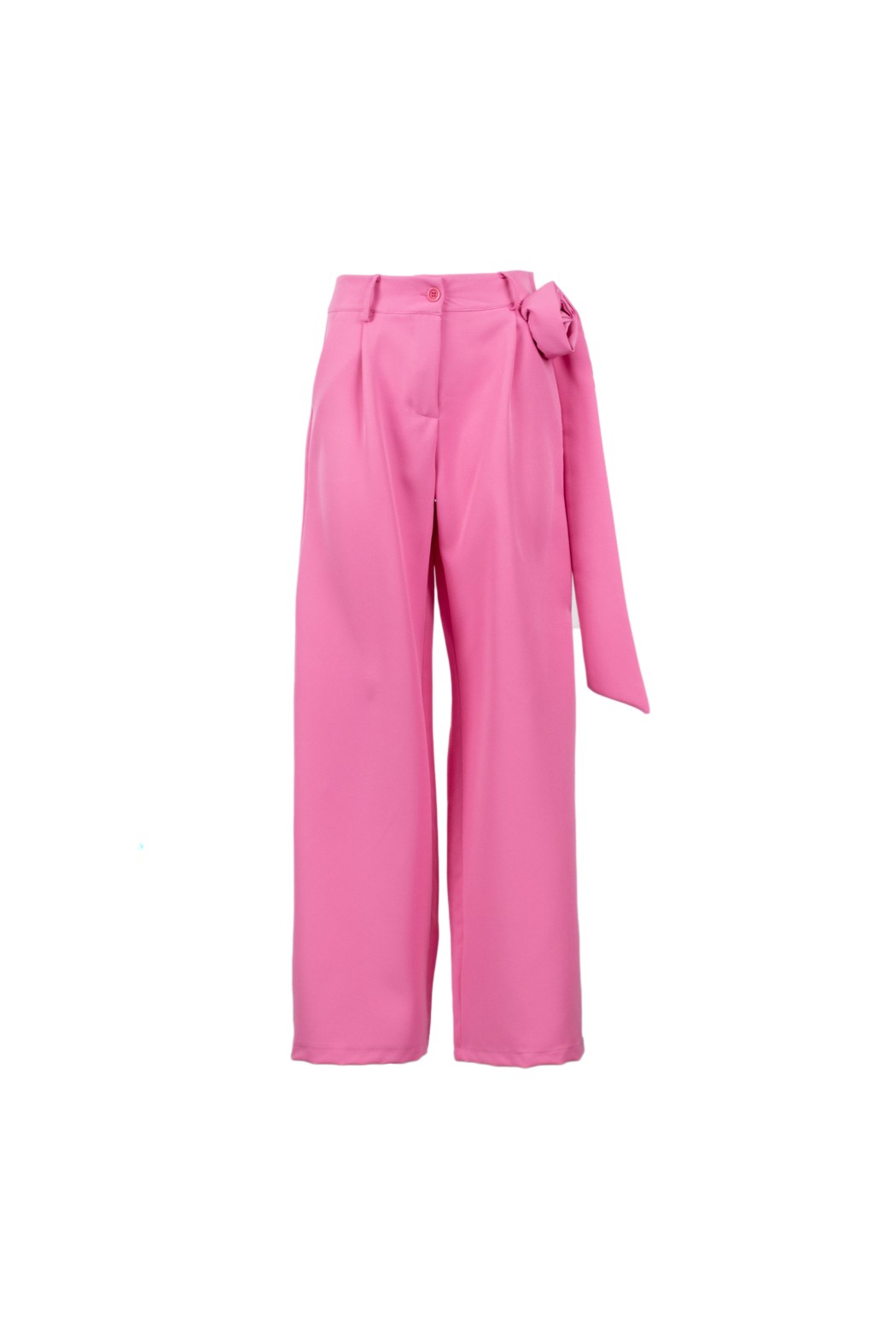Pantalone full lenght con pinces, fiore con voulant applicato sul fianco.
