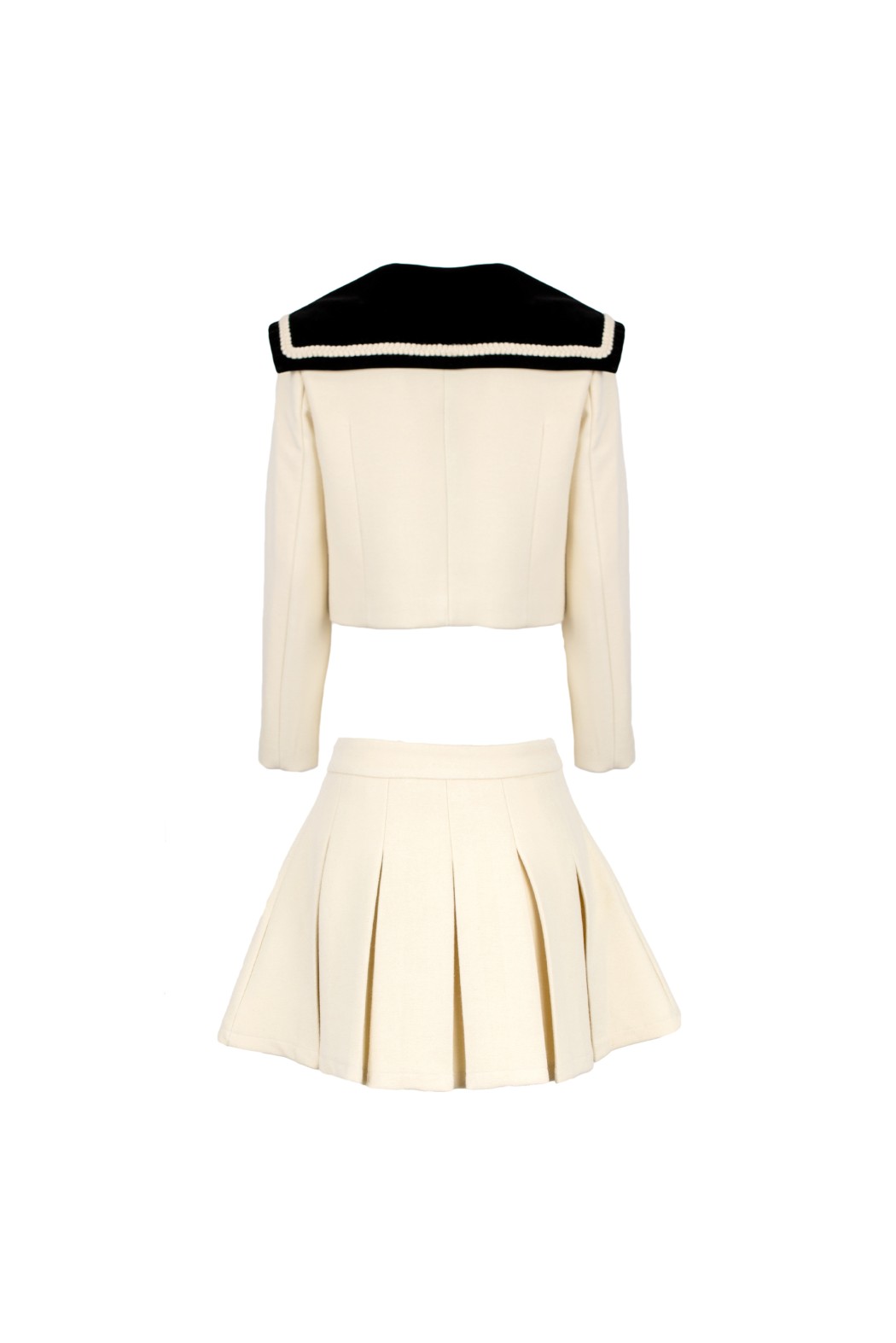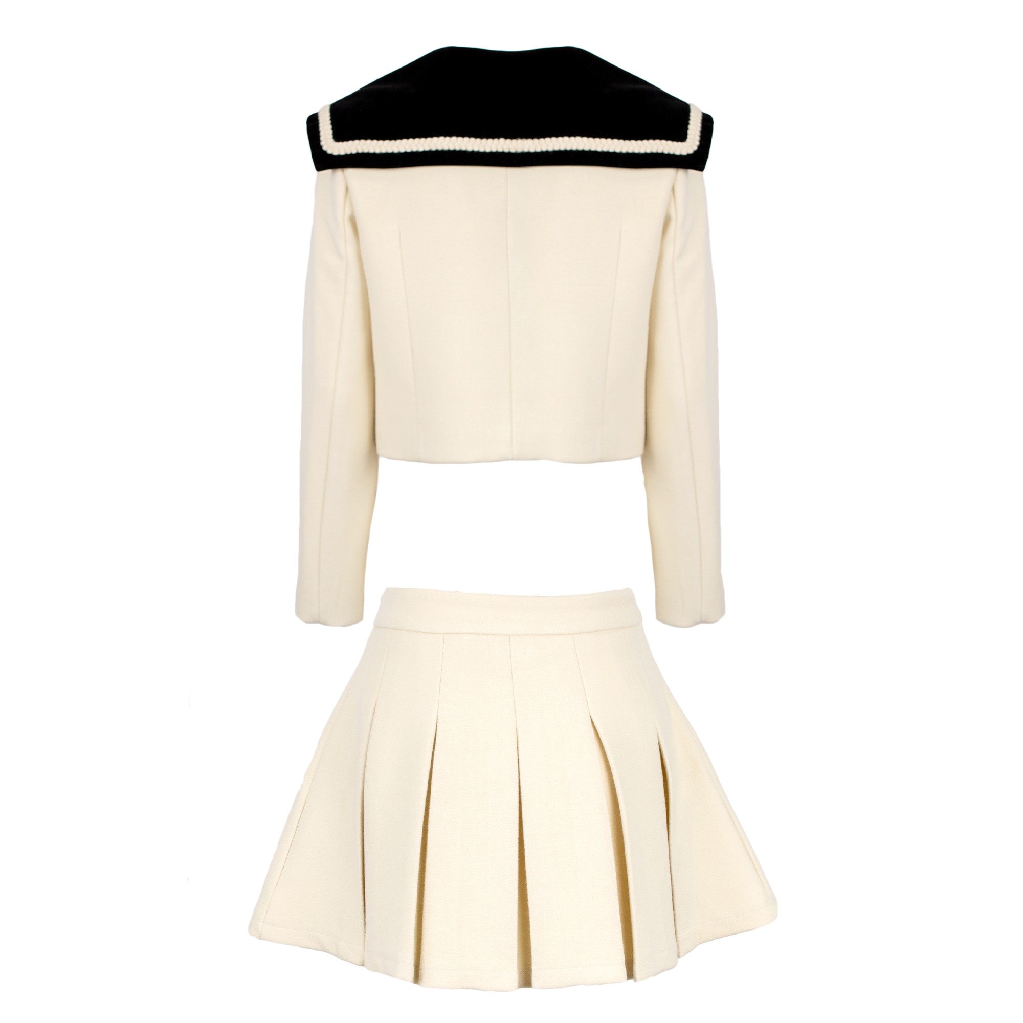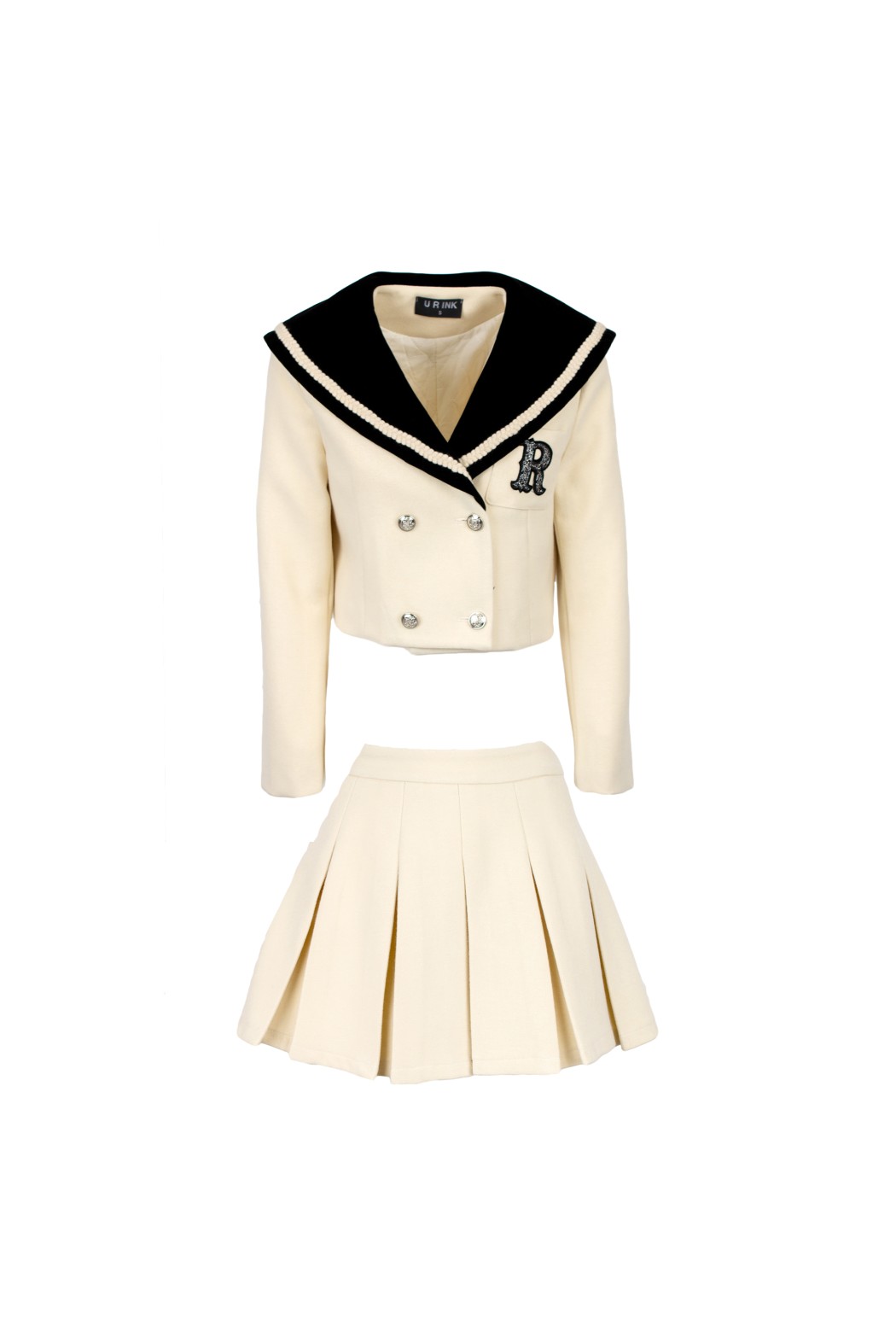 Questo set è composto da giacca e gonna. La giacca è blu scuro, corta e a doppio petto, con un ampio colletto alla marinara in velluto nero. Sulla manica è presente un'applicazione che rappresenta la lettera 'R'. La gonna è blu scuro e a pieghe, abbinata alla giacca.