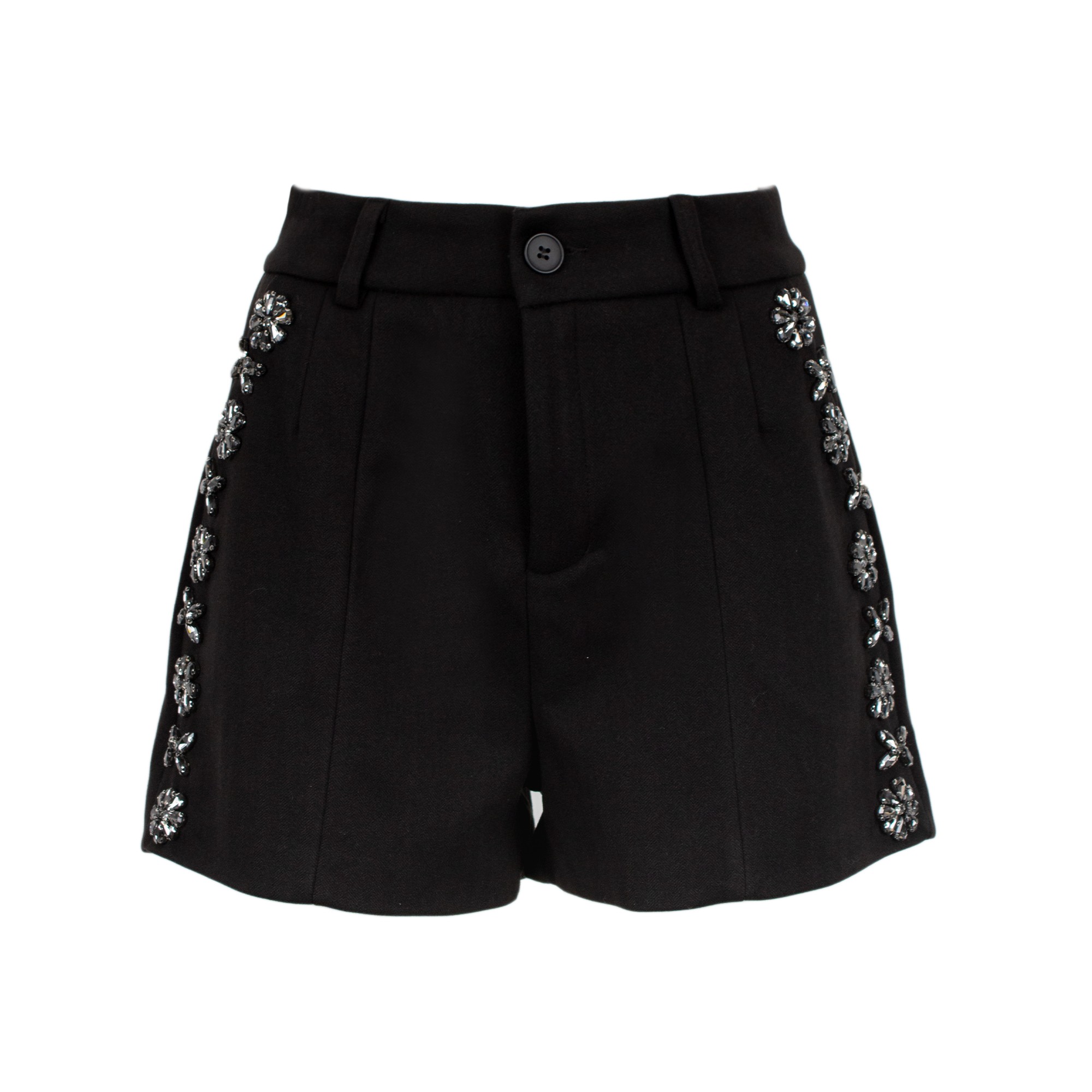Shorts a vita alta. Il capo presenta delle applicazioni floreali gioiello lungo i fianchi.