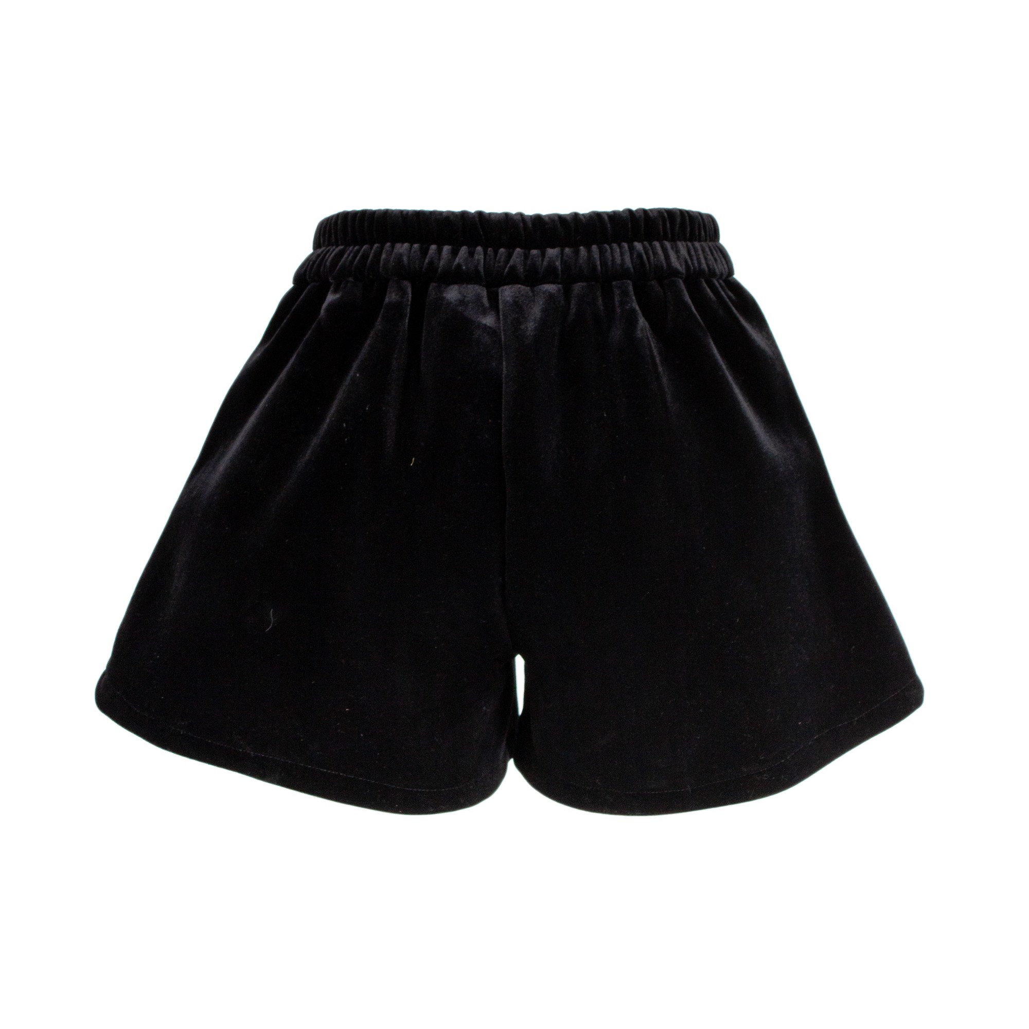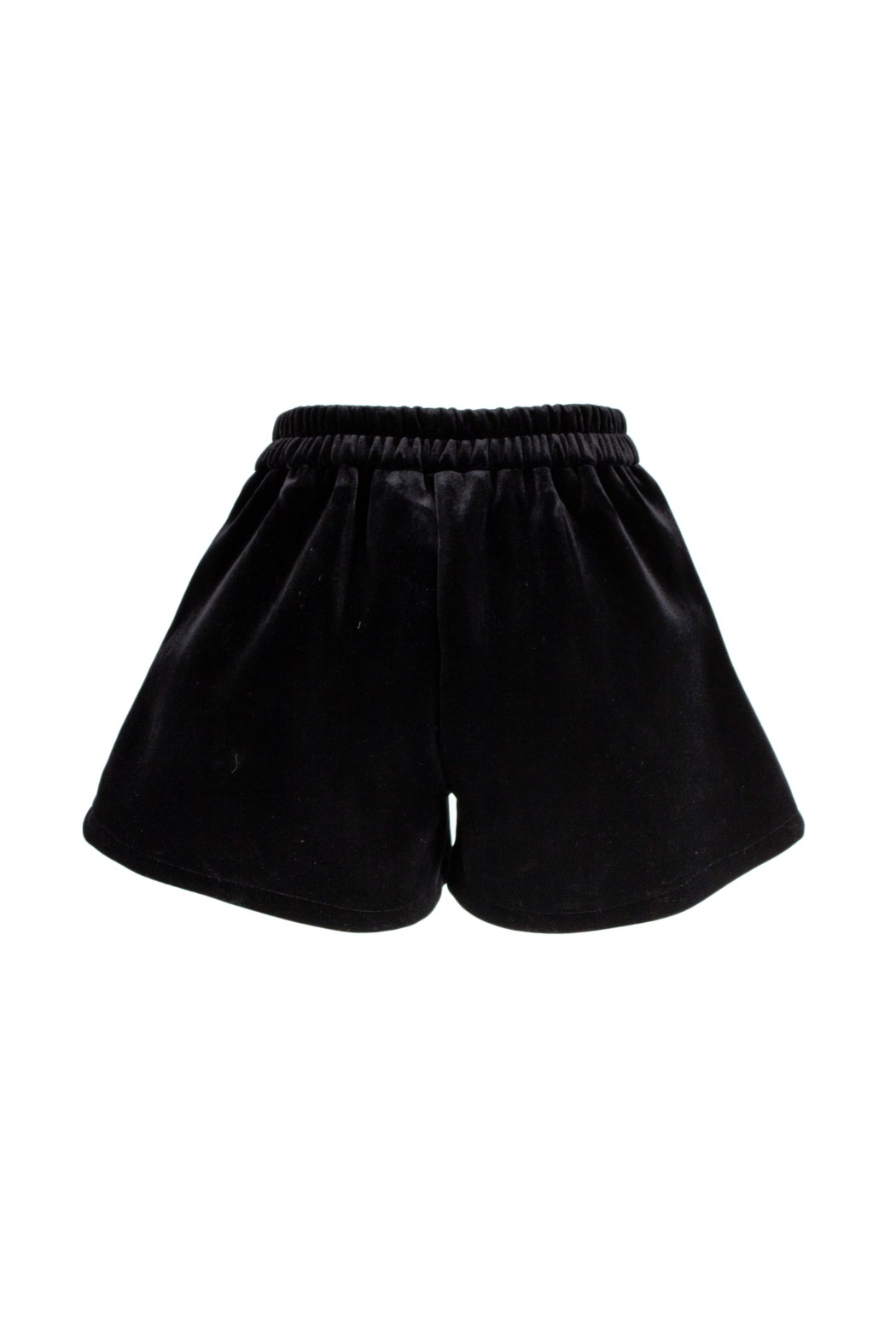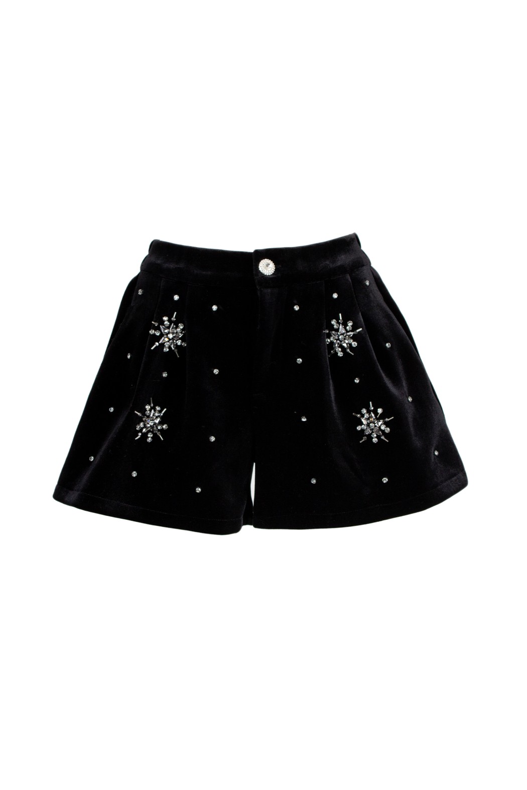 Shorts a vita alta in velluto. Il capo presenta delle applicazioni gioiello a forma di fiocco di neve e borchie lungo tutta la superficie.