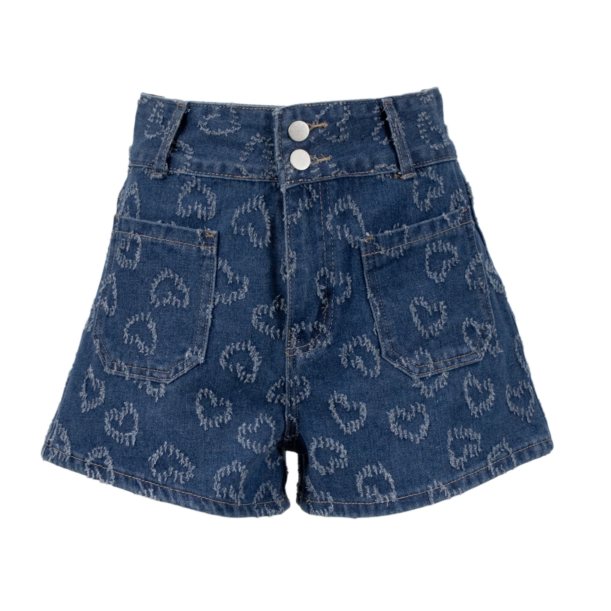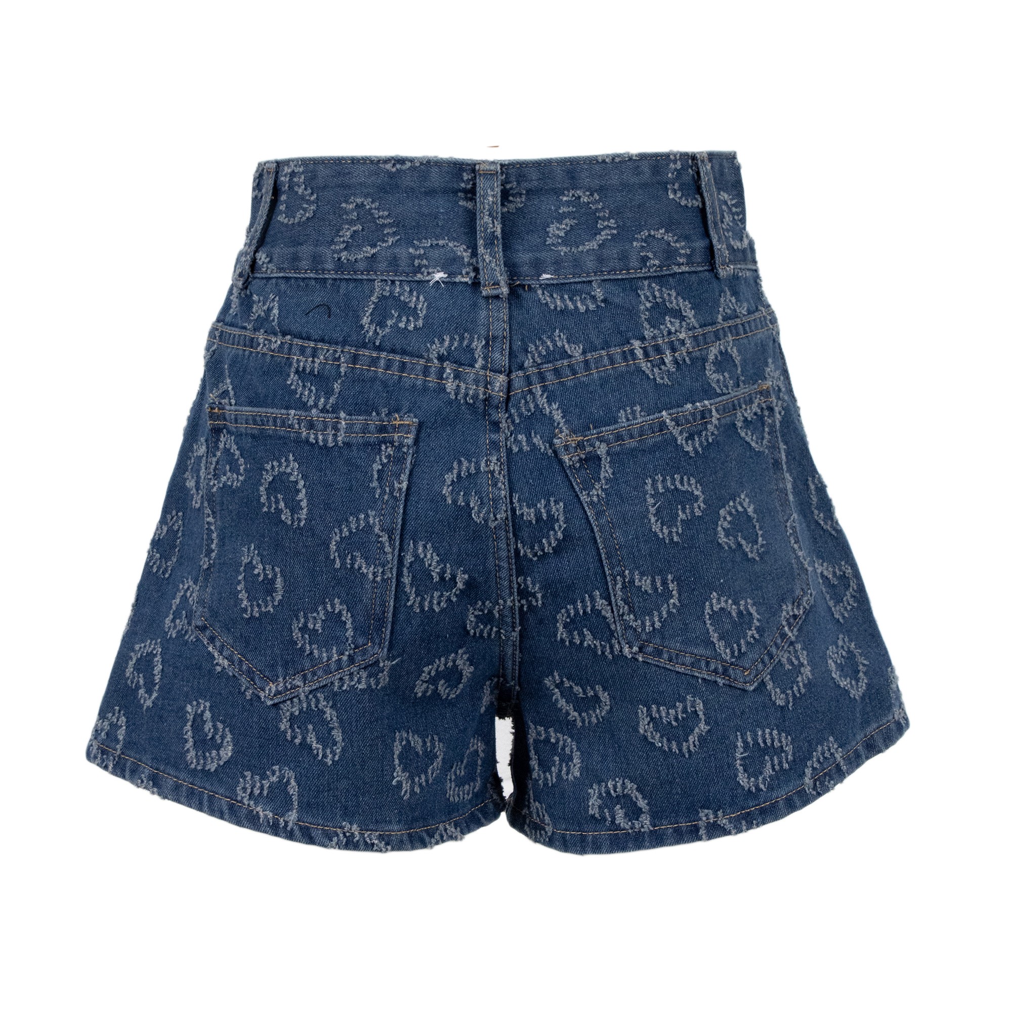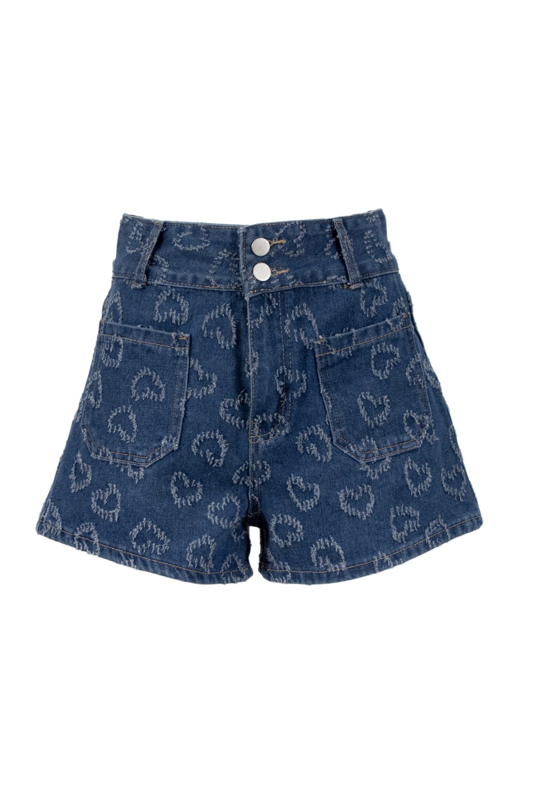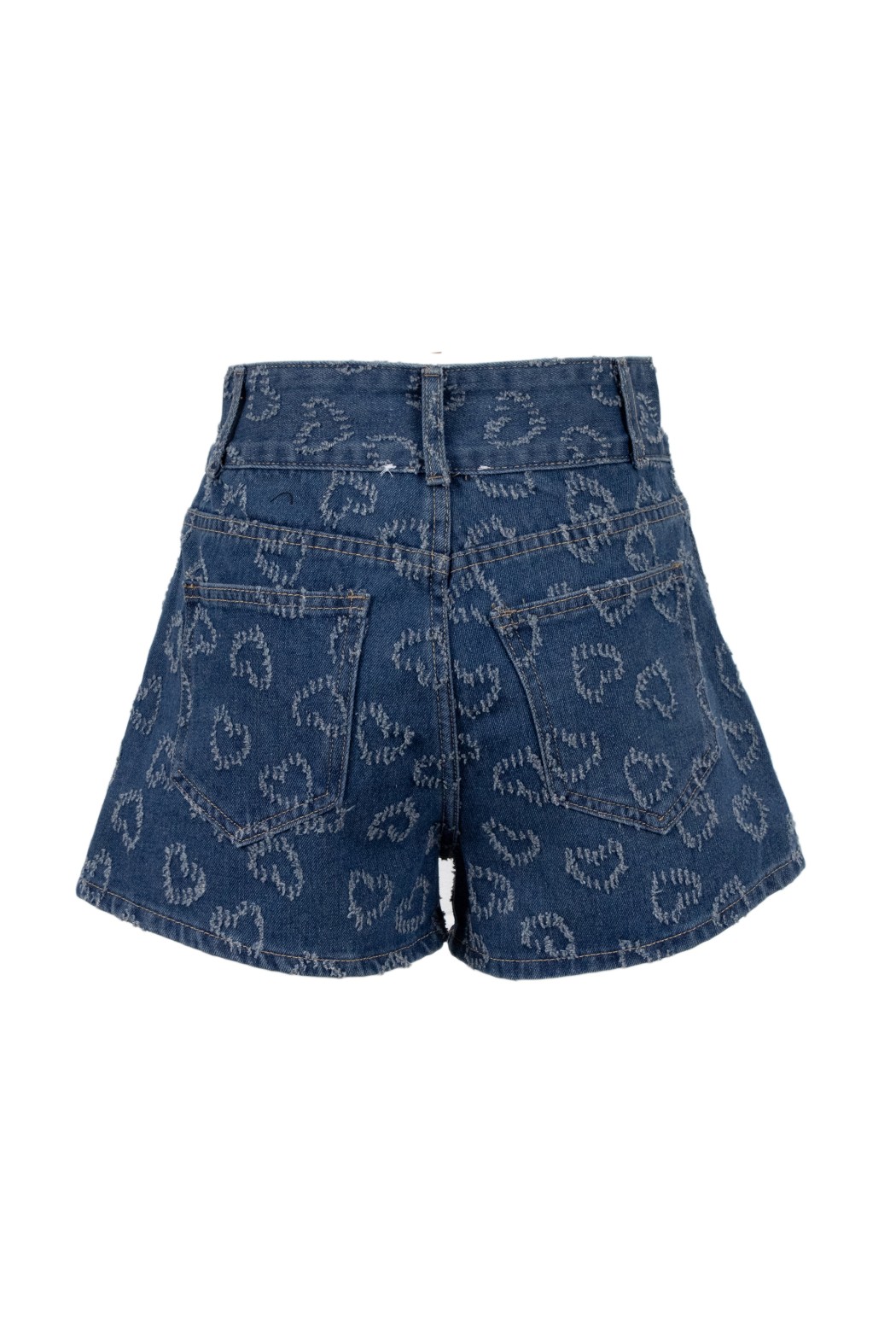 Shorts denim vita alta, dettagli a cuore sfrangiati, tasche a filo chiusura due bottoni.