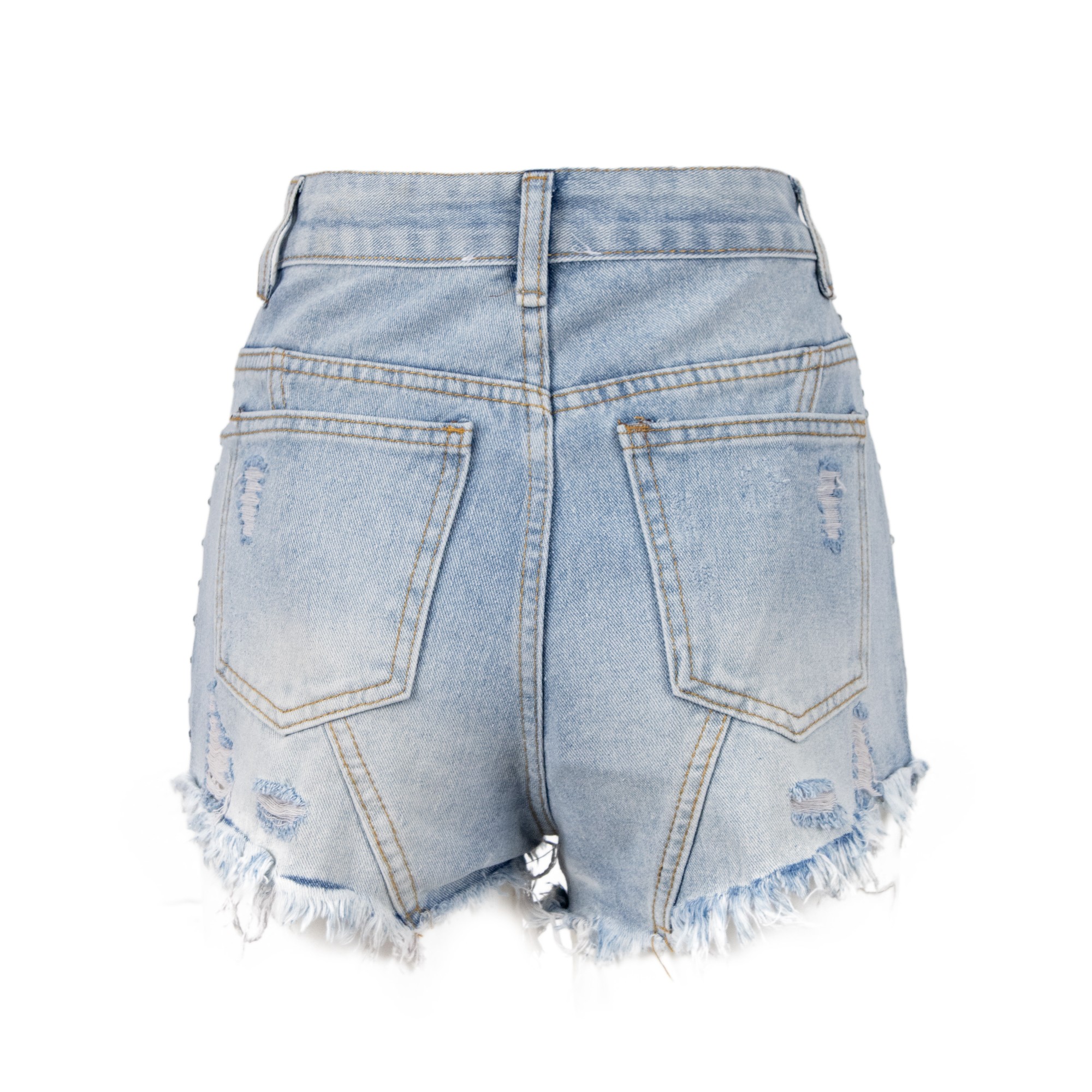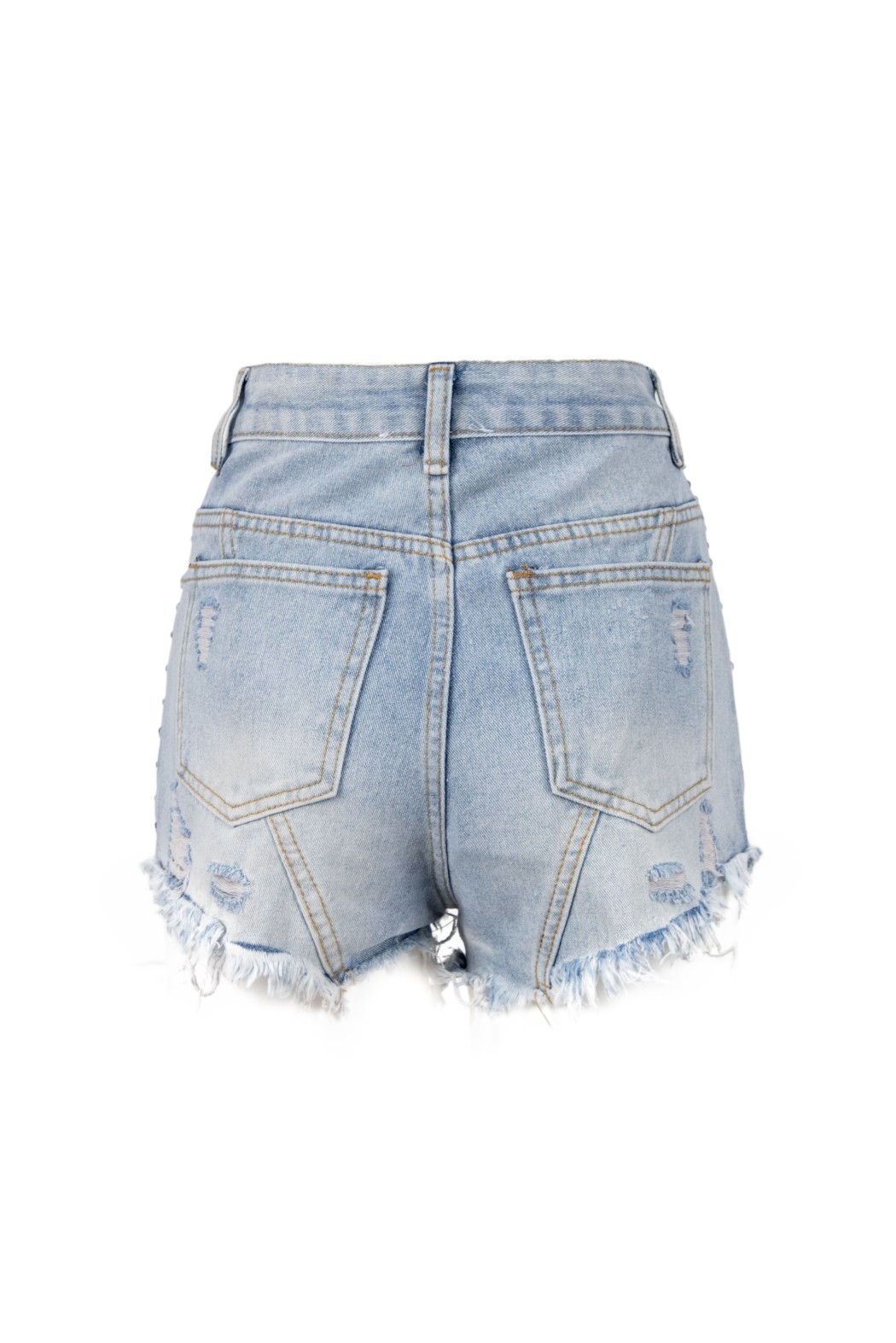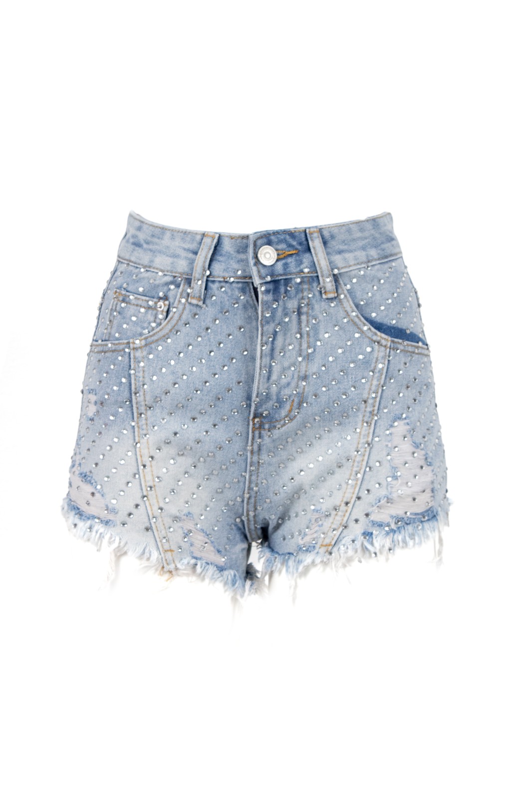 Shorts denim, dettagli strass e bordi sfrangiati.