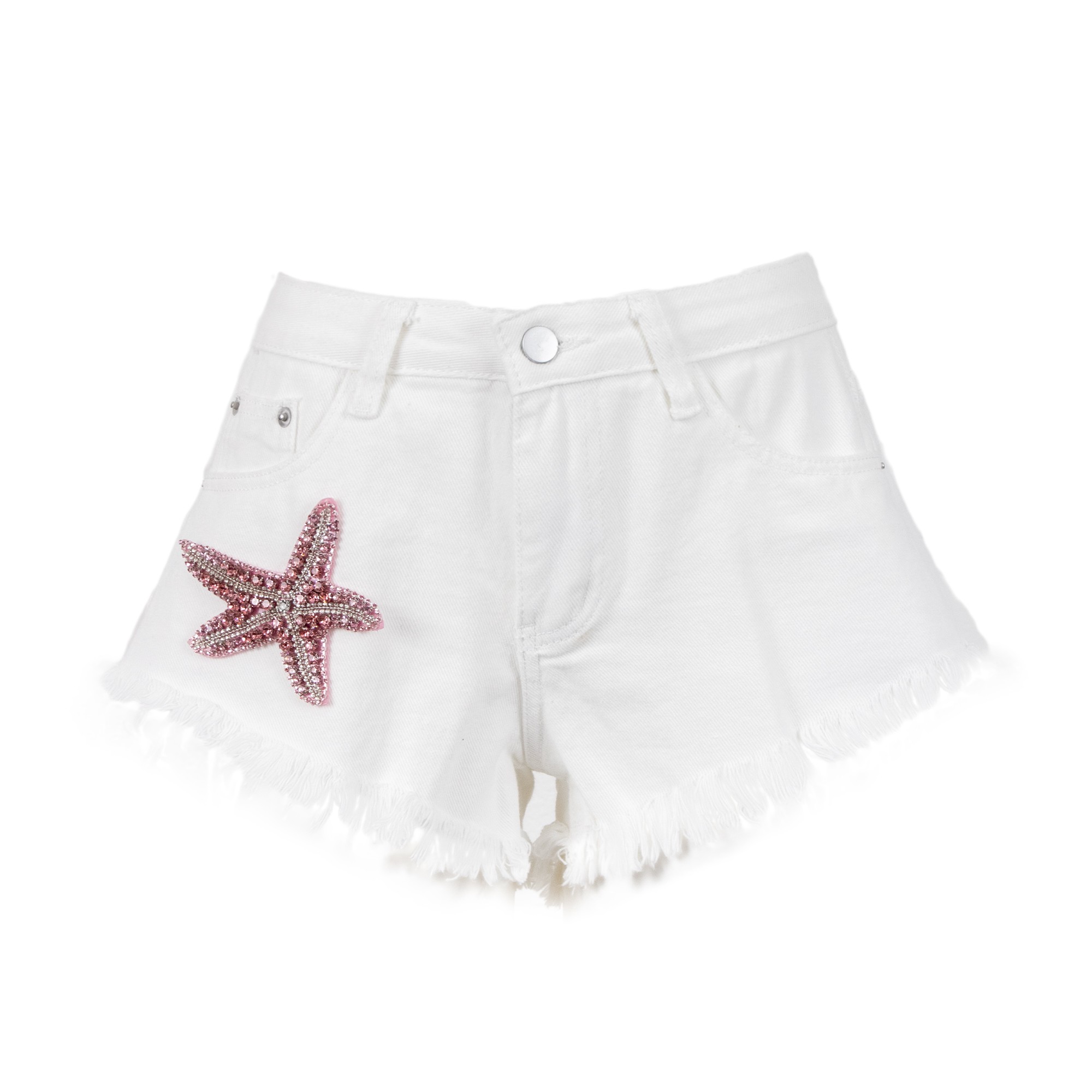 Shorts denim, stella marina in strass applicata, bordi sfrangiati.