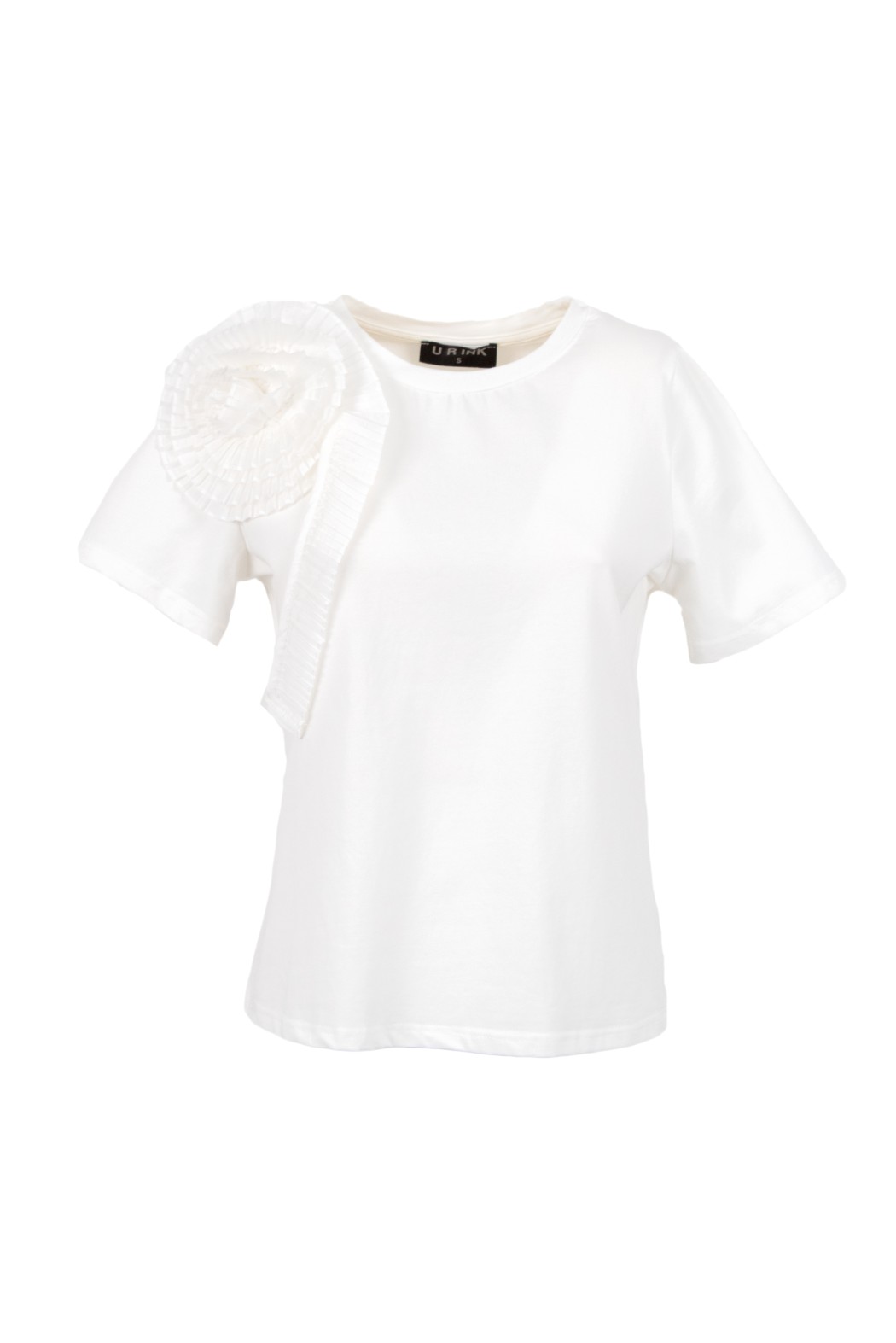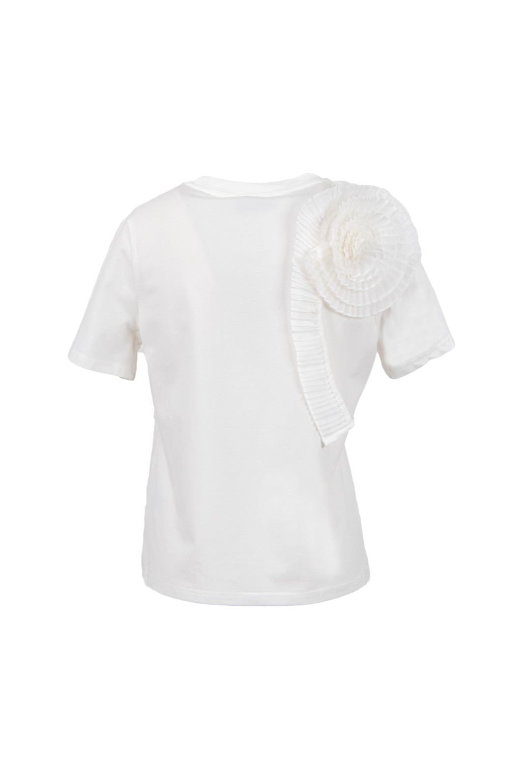 T-shirt collo tondo, rouches a fiore applicata su spalla fronte retro.